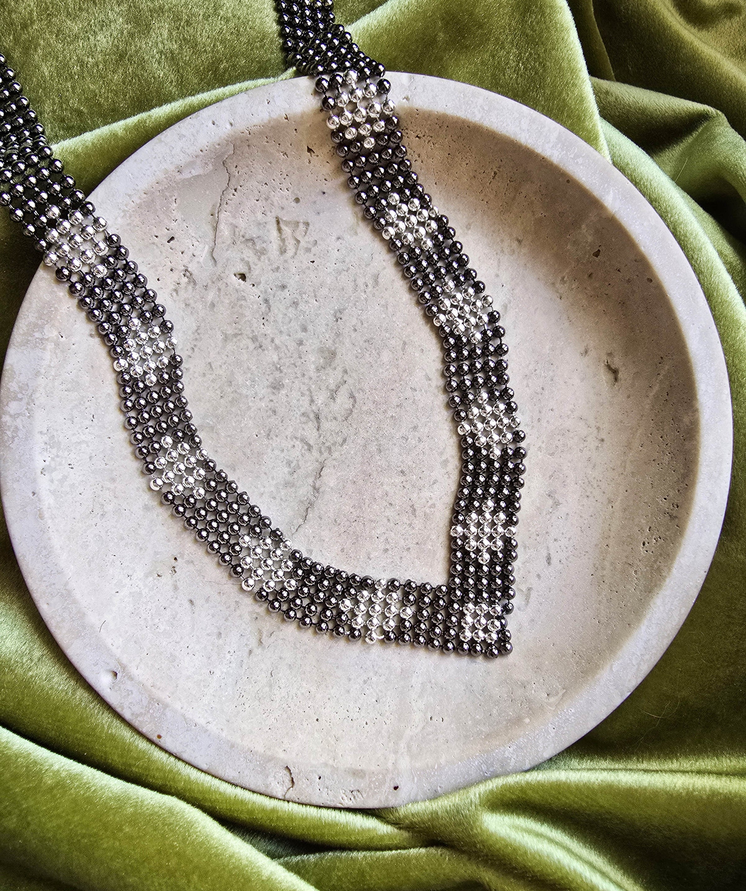 This vintage Givenchy necklace and bracelet set is a striking example of the house’s mastery of Parisian glamour. Crafted in silver-tone metal, the pieces feature a bold geometric pattern of clear and black crystals, creating a dazzling yet refined look. The matching bracelet and necklace are designed to complement one another perfectly, making this set ideal for evening wear or special occasions.