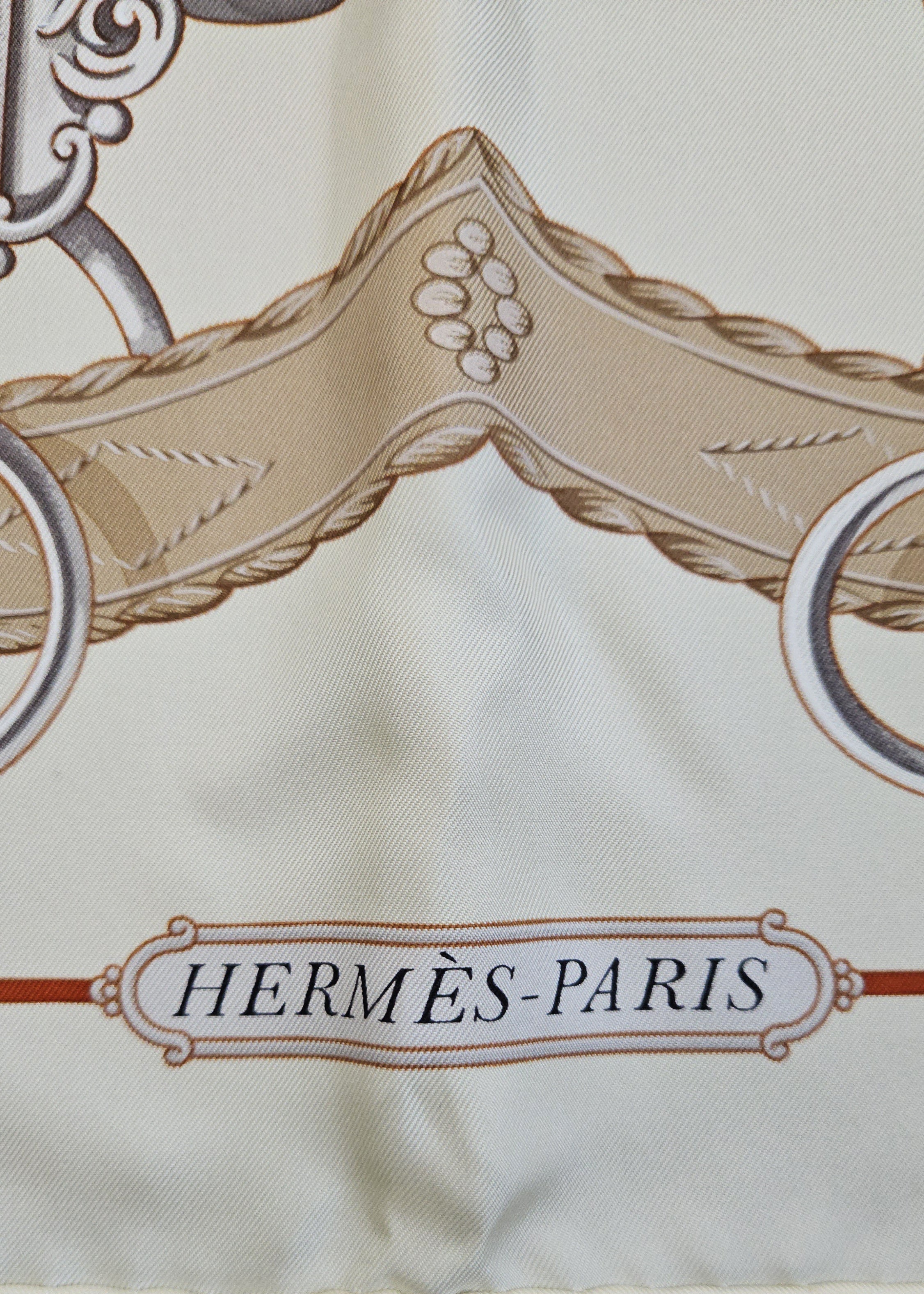 This vintage Hermès silk scarf is a stunning representation of the maison’s timeless artistry and equestrian heritage. The scarf showcases elaborate bridles, bits, and leather straps arranged in a refined symmetrical composition. Rendered in neutral tones of cream, taupe, and grey, it embodies understated luxury and versatile elegance — perfect for wearing around the neck, as a headscarf, or tied to a handbag.