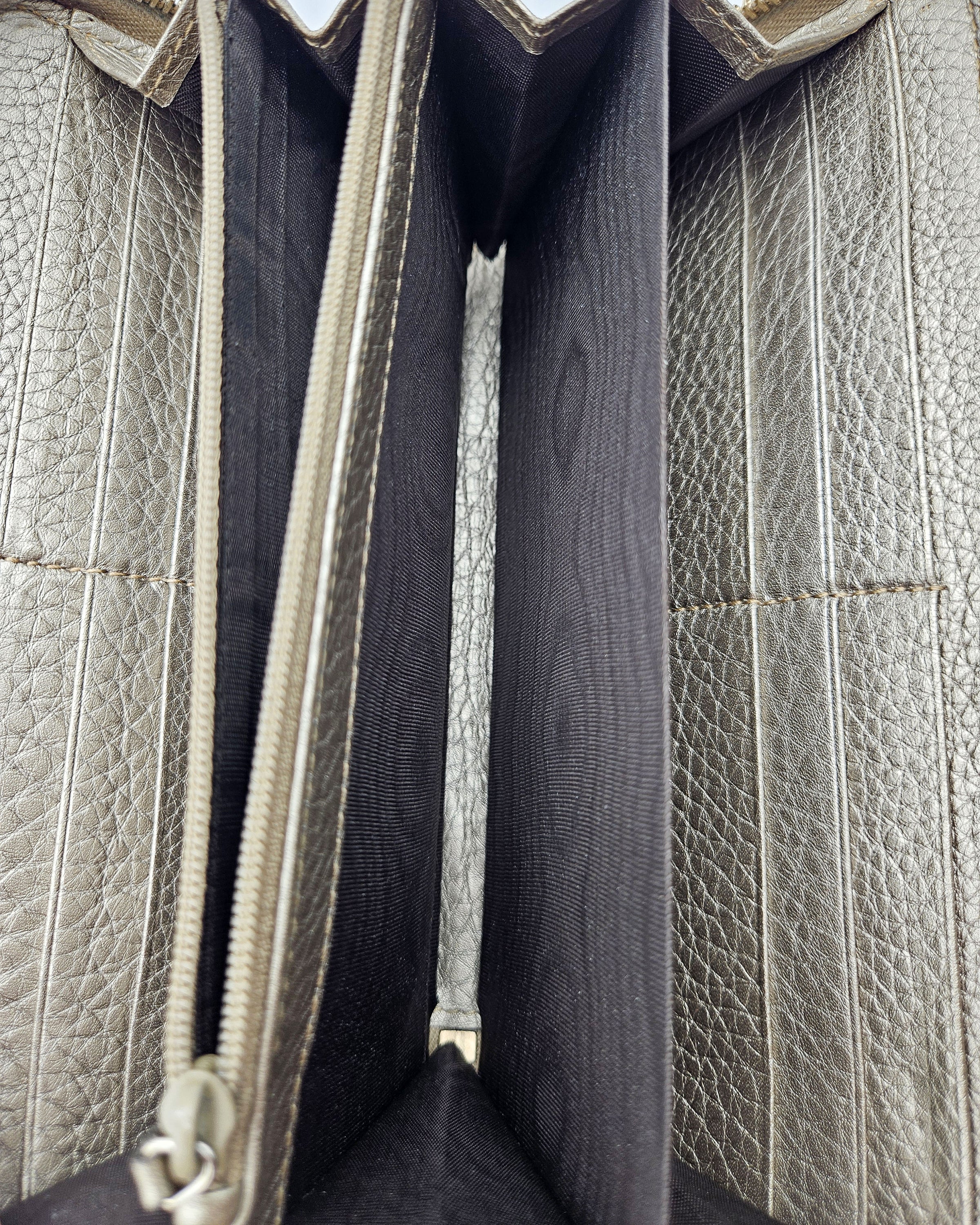 • Intérieur : Intérieur cuir grainé doré et toile noire, plusieurs fentes pour cartes et poche à monnaie en tissu moiré