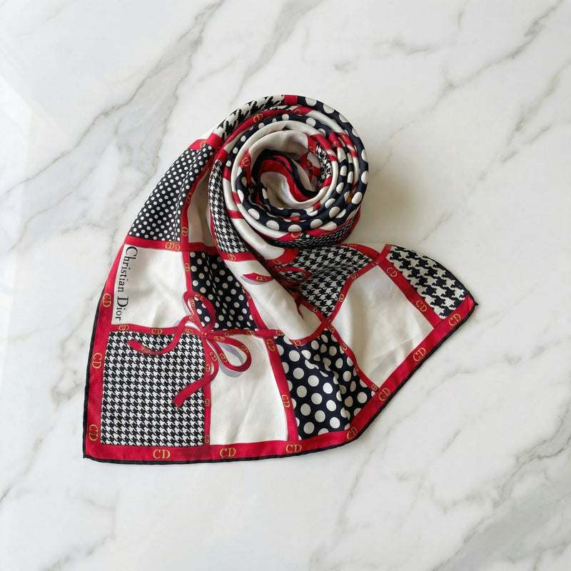 Foulard Carré Christian Dior Vintage en Soie – Motif Carreaux et Pois Noir & Blanc avec Rubans Rouges
