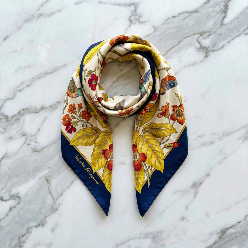 Foulard Vintage Salvatore Ferragamo À Motif Floral Et Oiseaux