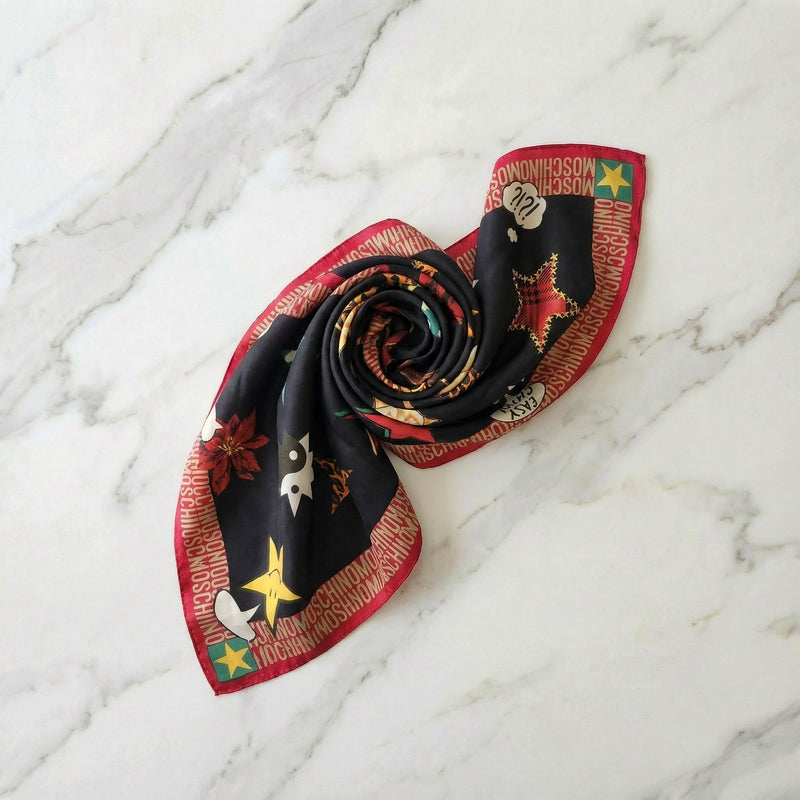 Foulard Moschino Vintage en Soie Motifs Étoiles & Logo