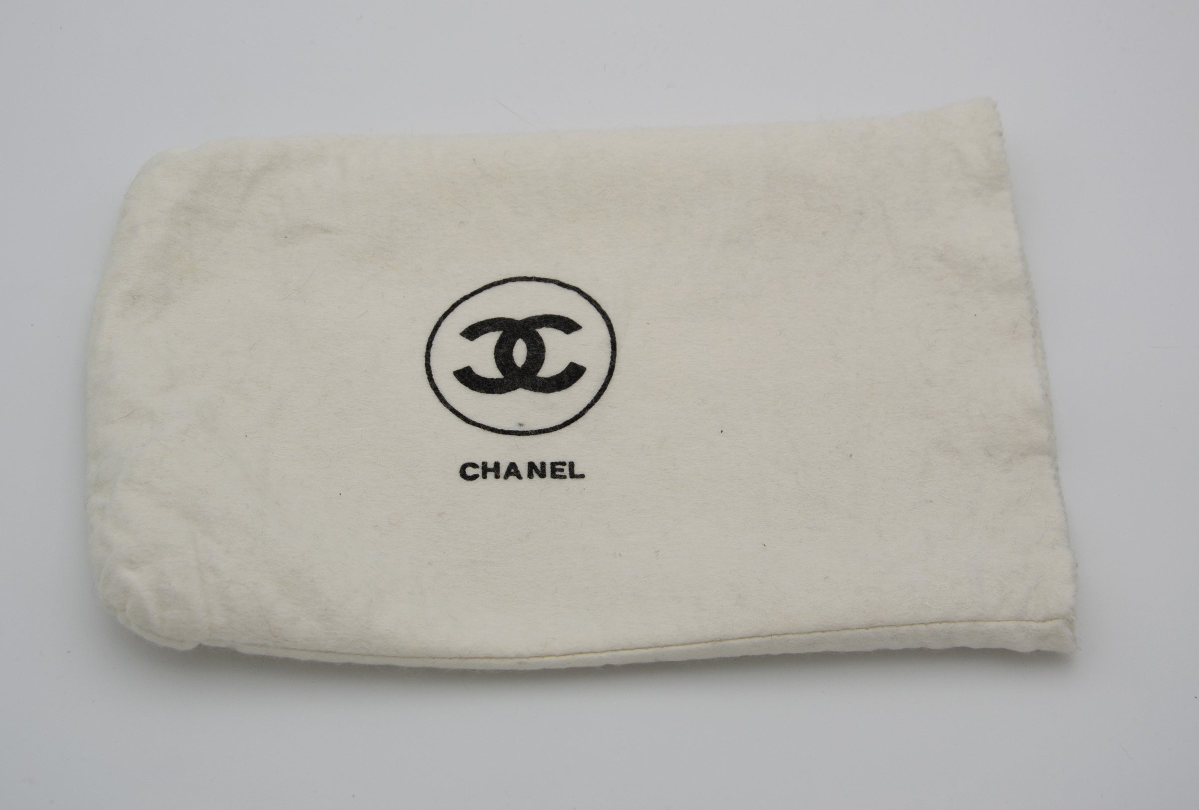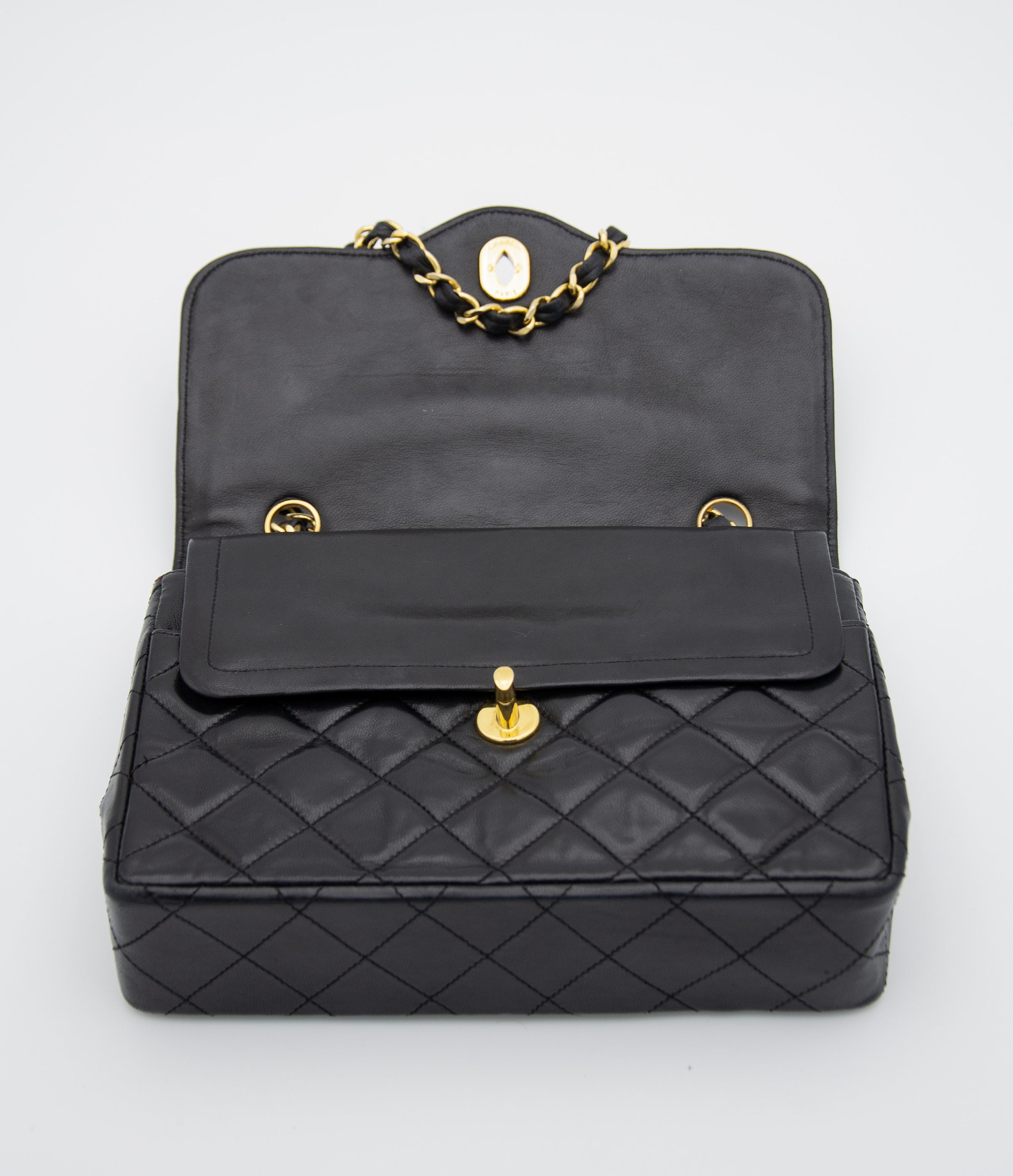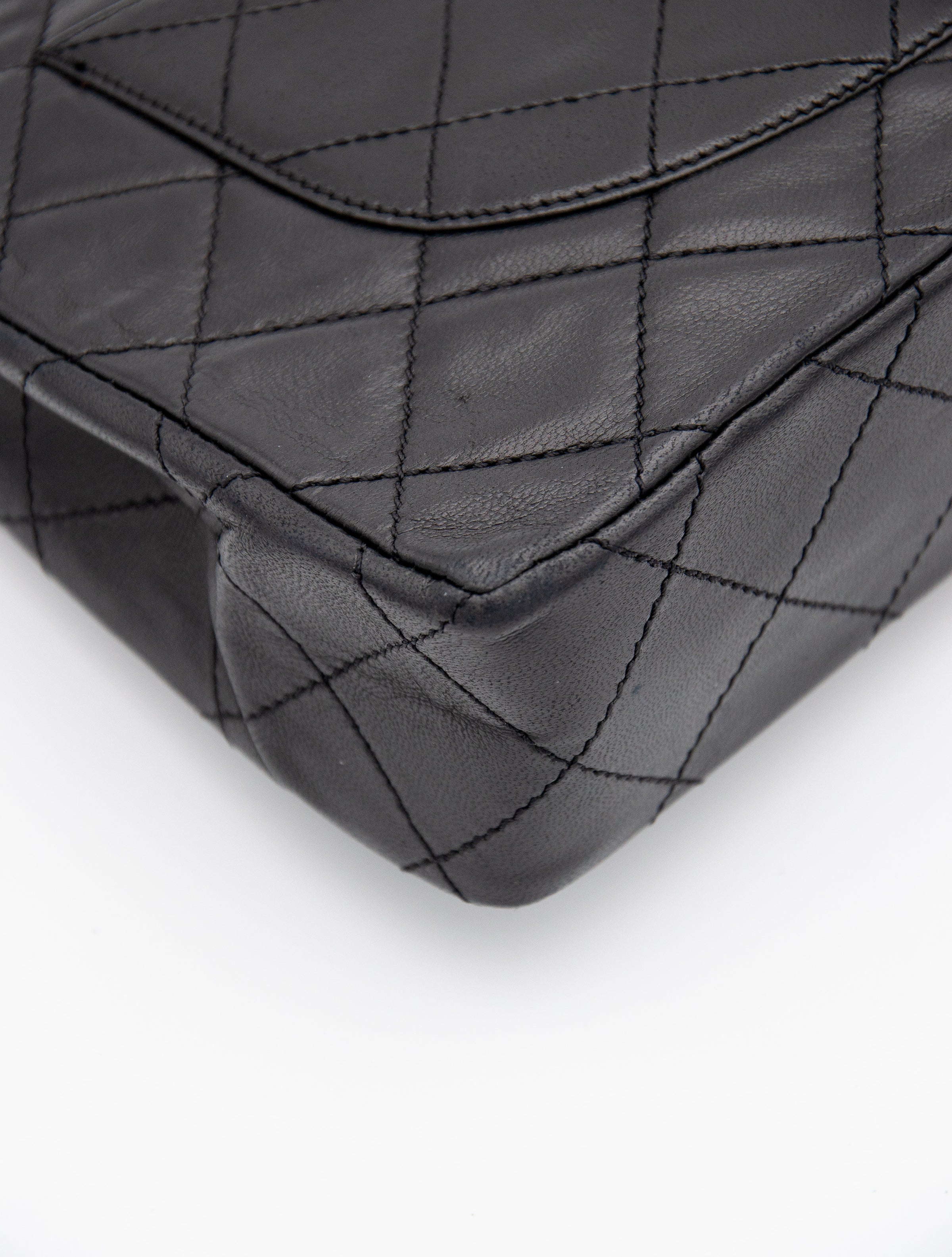 The bag is in good overall condition, showing minimal signs of wear, with slight creasing on the flap, which is expected for its age. The leather is free of tears or stains, and the chain links and hardware are also in great condition. The bag is sold with its original dust bag, making it a coveted vintage piece perfect for collectors.