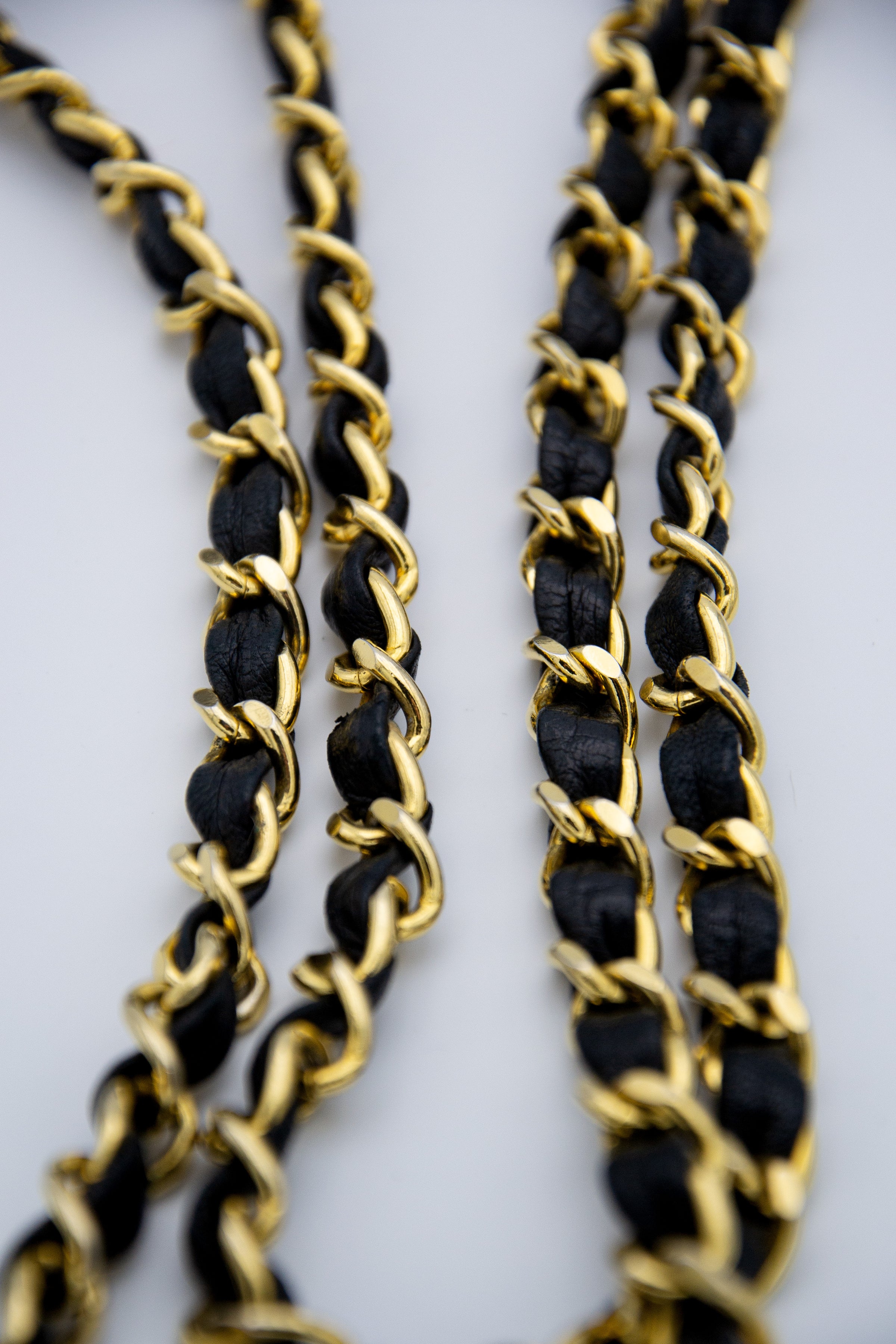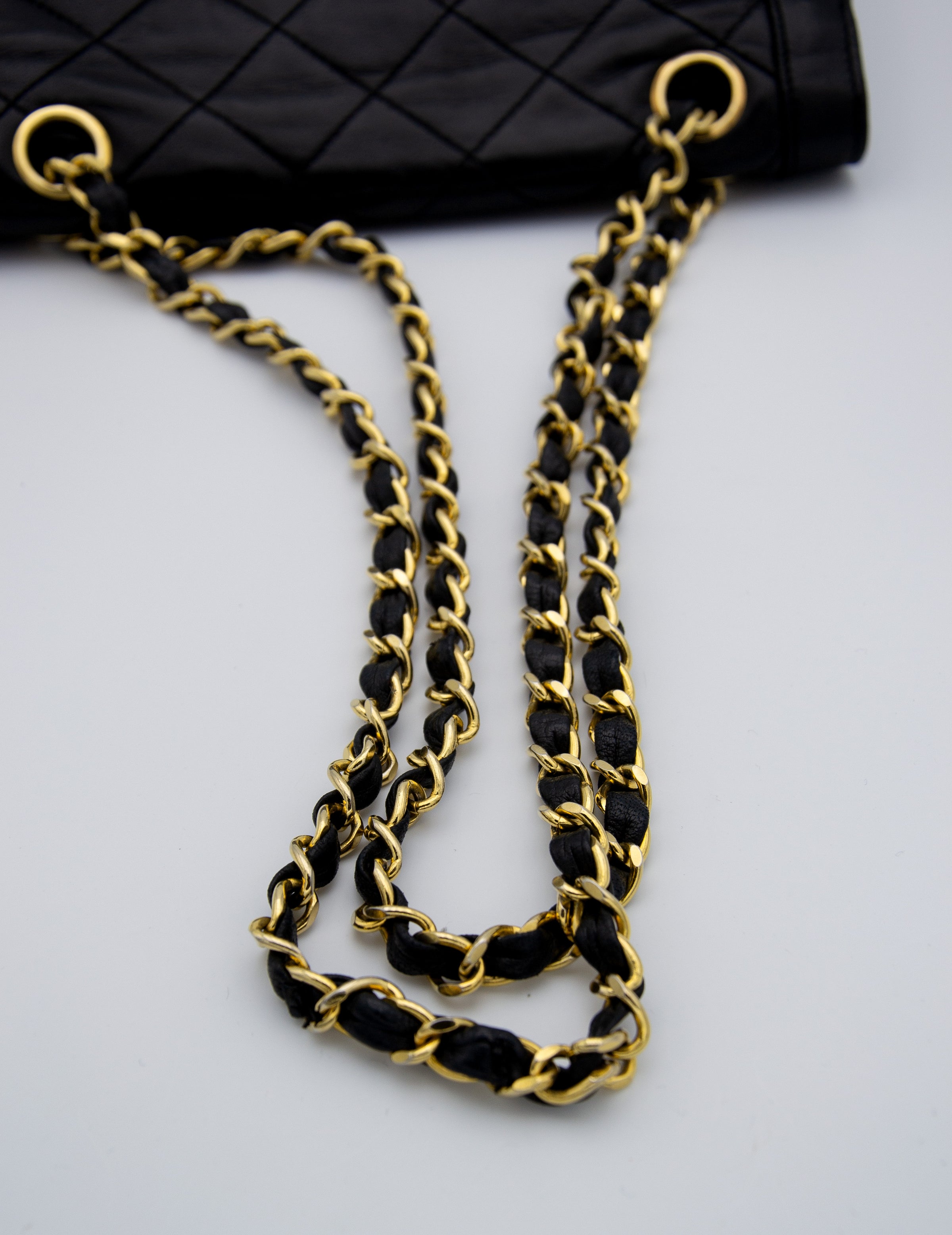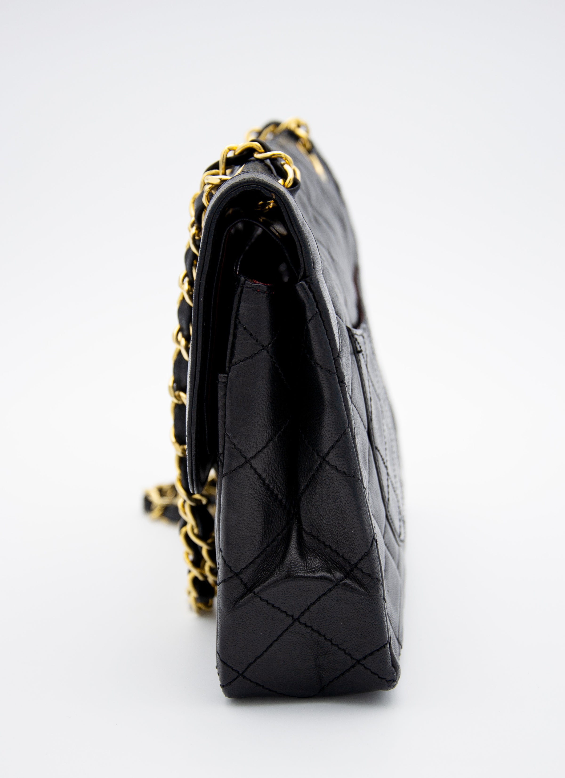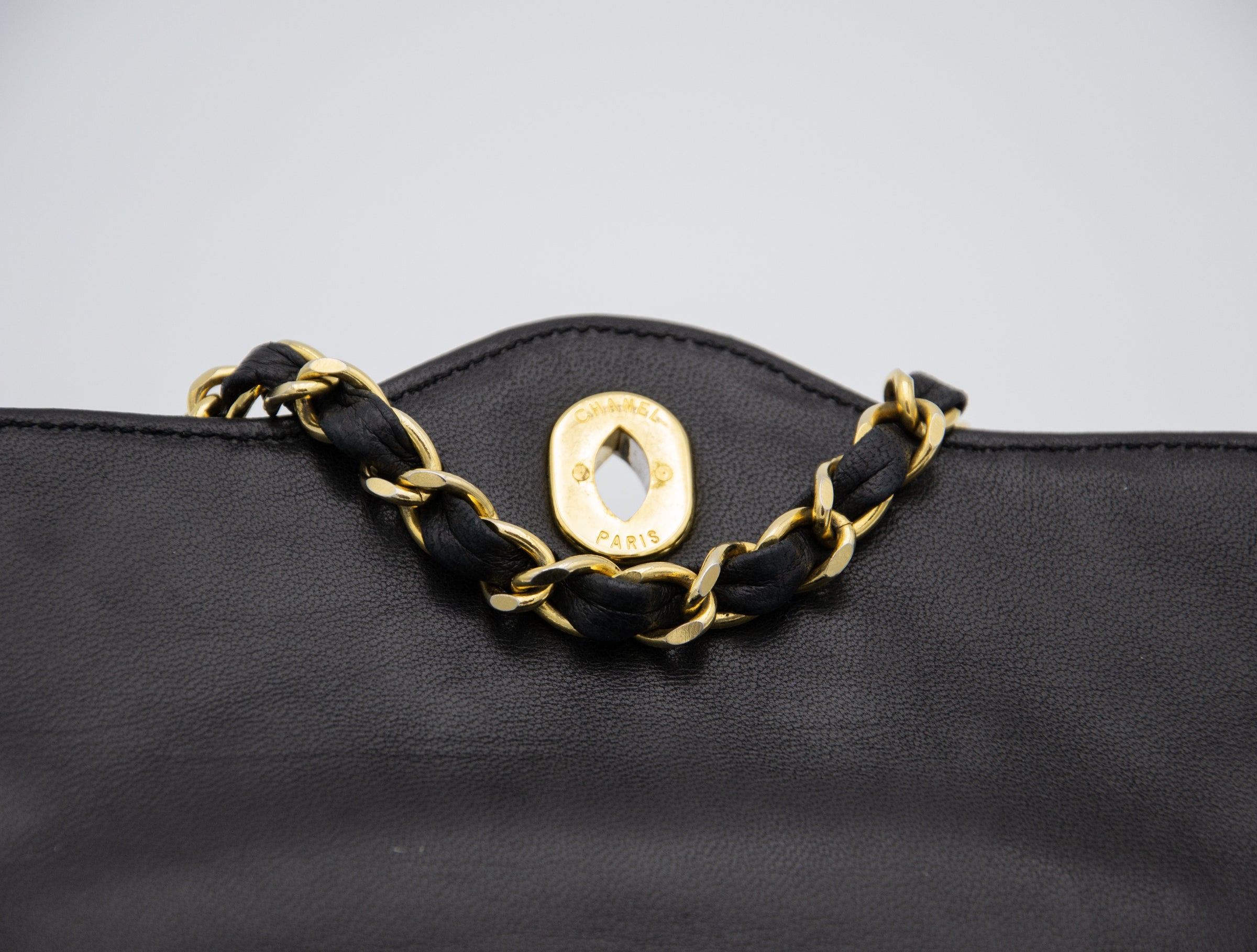 The bag is in good overall condition, showing minimal signs of wear, with slight creasing on the flap, which is expected for its age. The leather is free of tears or stains, and the chain links and hardware are also in great condition. The bag is sold with its original dust bag, making it a coveted vintage piece perfect for collectors.