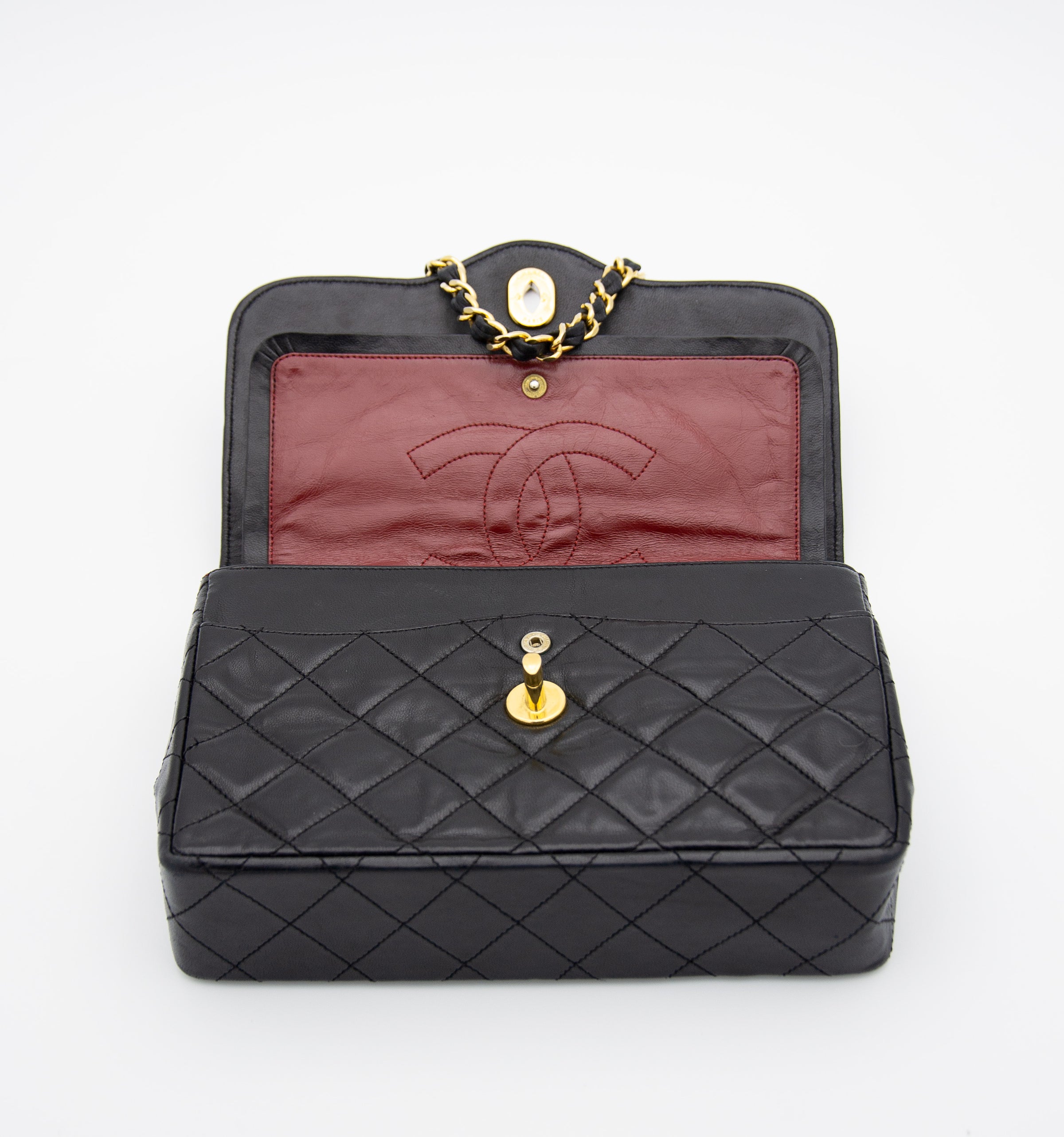 Step into elegance with this stunning vintage Chanel Double Flap bag, dating from 1986-1988. Crafted in luxurious black quilted lambskin leather, the bag features gold-plated hardware that adds a touch of opulence to its timeless design. The chain strap offers versatile styling options, allowing you to wear it over the shoulder or crossbody with a drop of either 22.86 cm or 40.64 cm. The bag includes an exterior slip pocket, an interior zippered pocket, and the iconic double flap design with a burgundy leather interior.