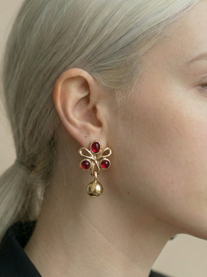 Nina Ricci Vintage Gold Clip-On Earrings with Red Cabochon