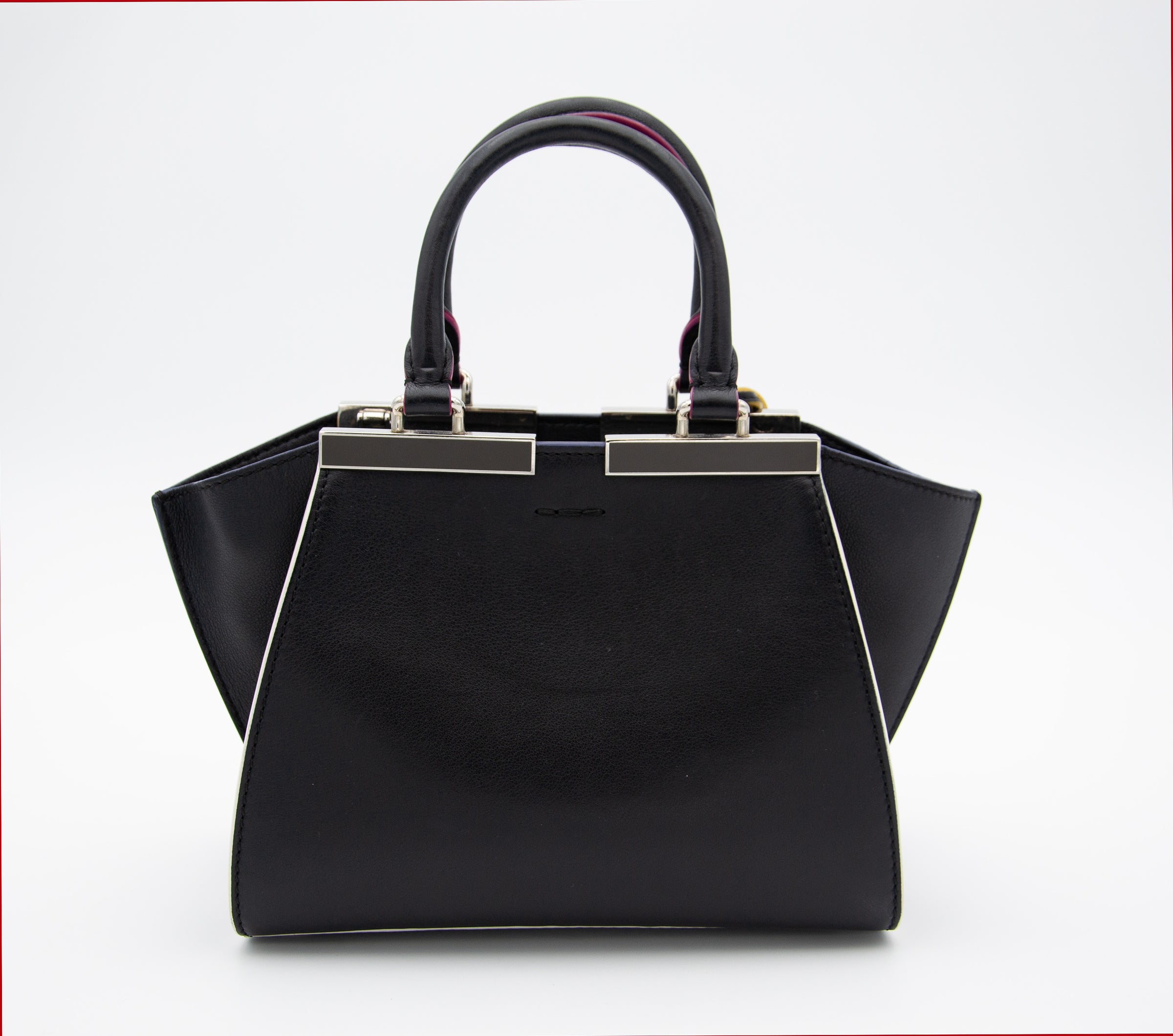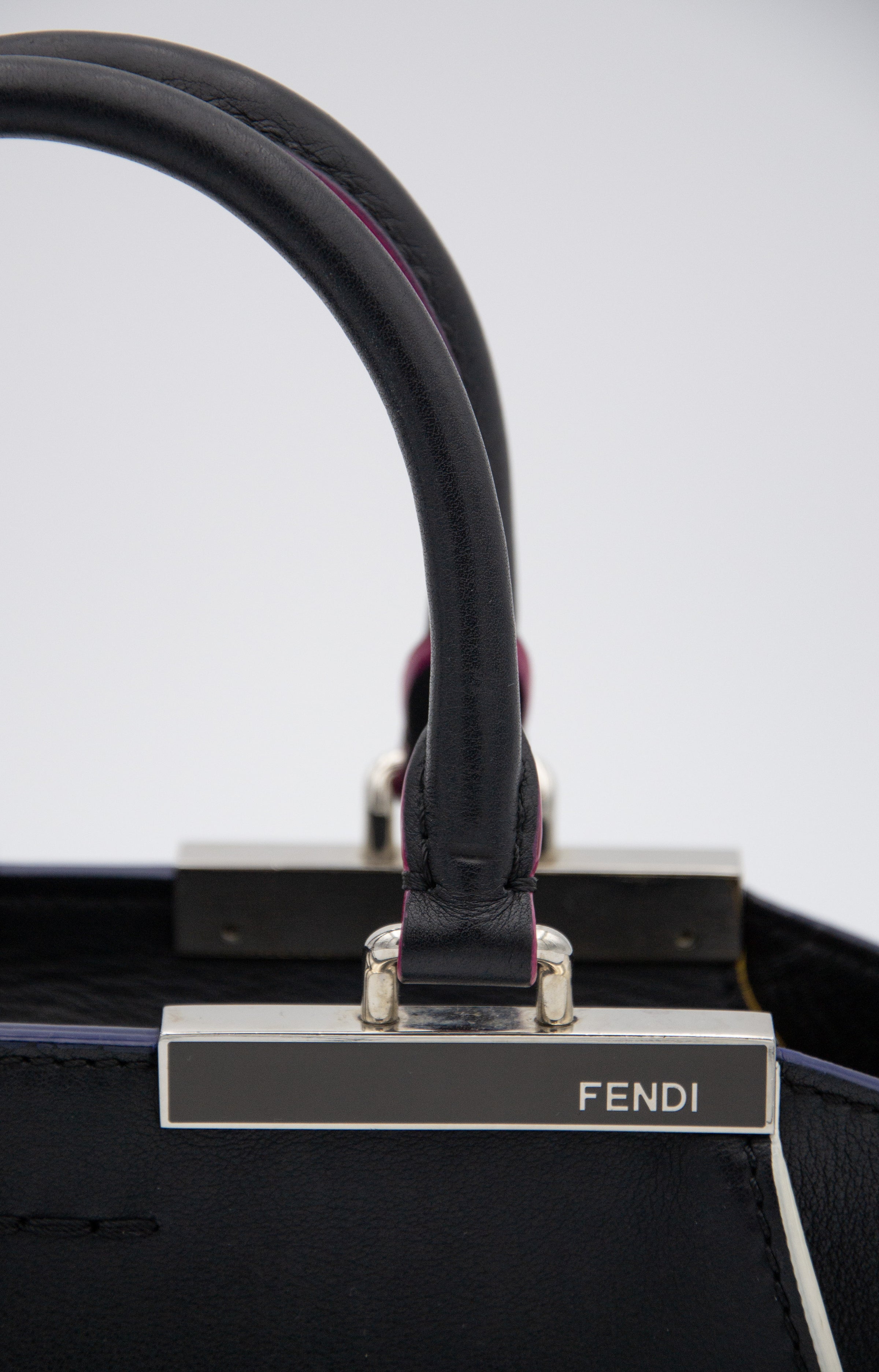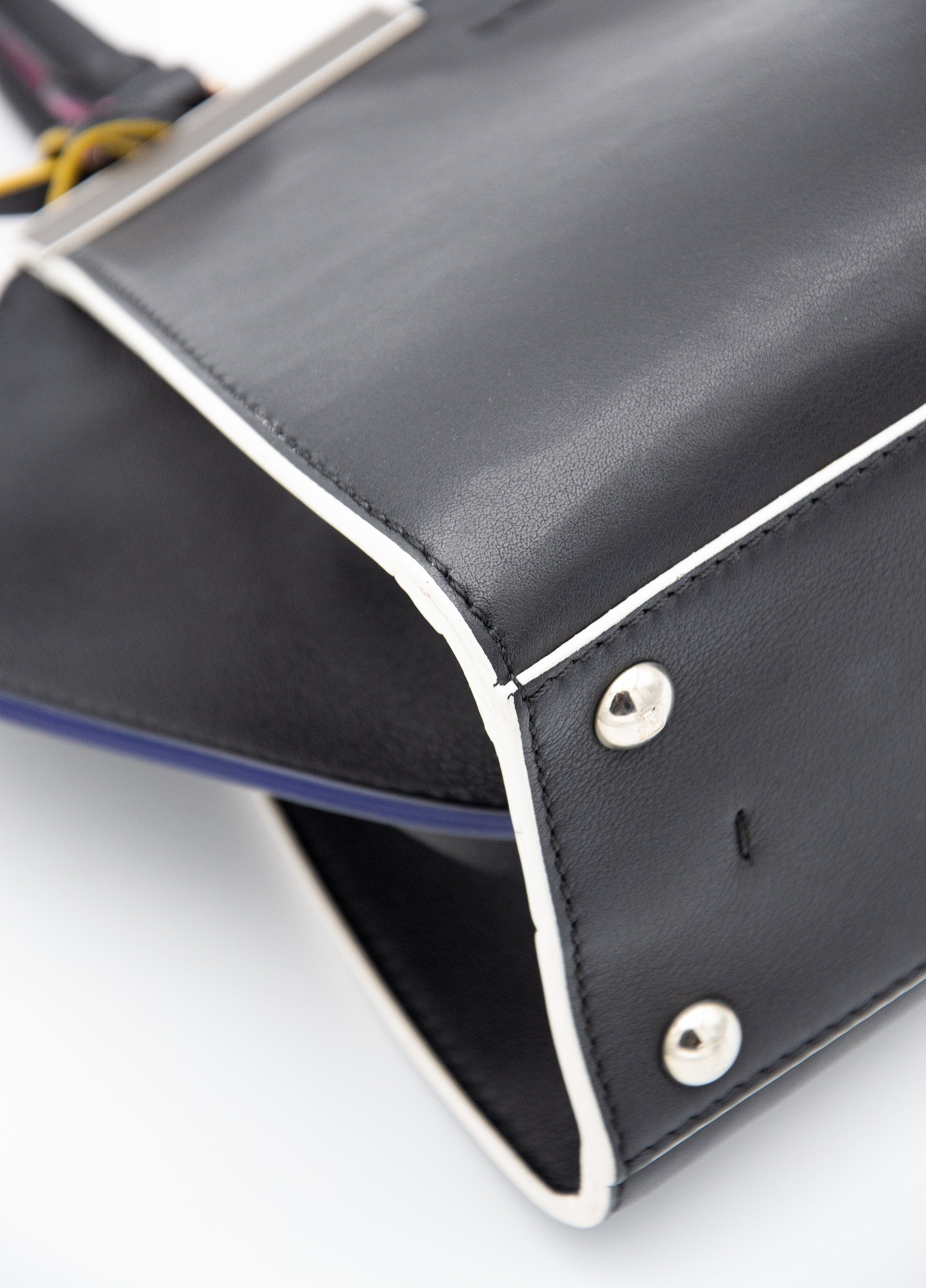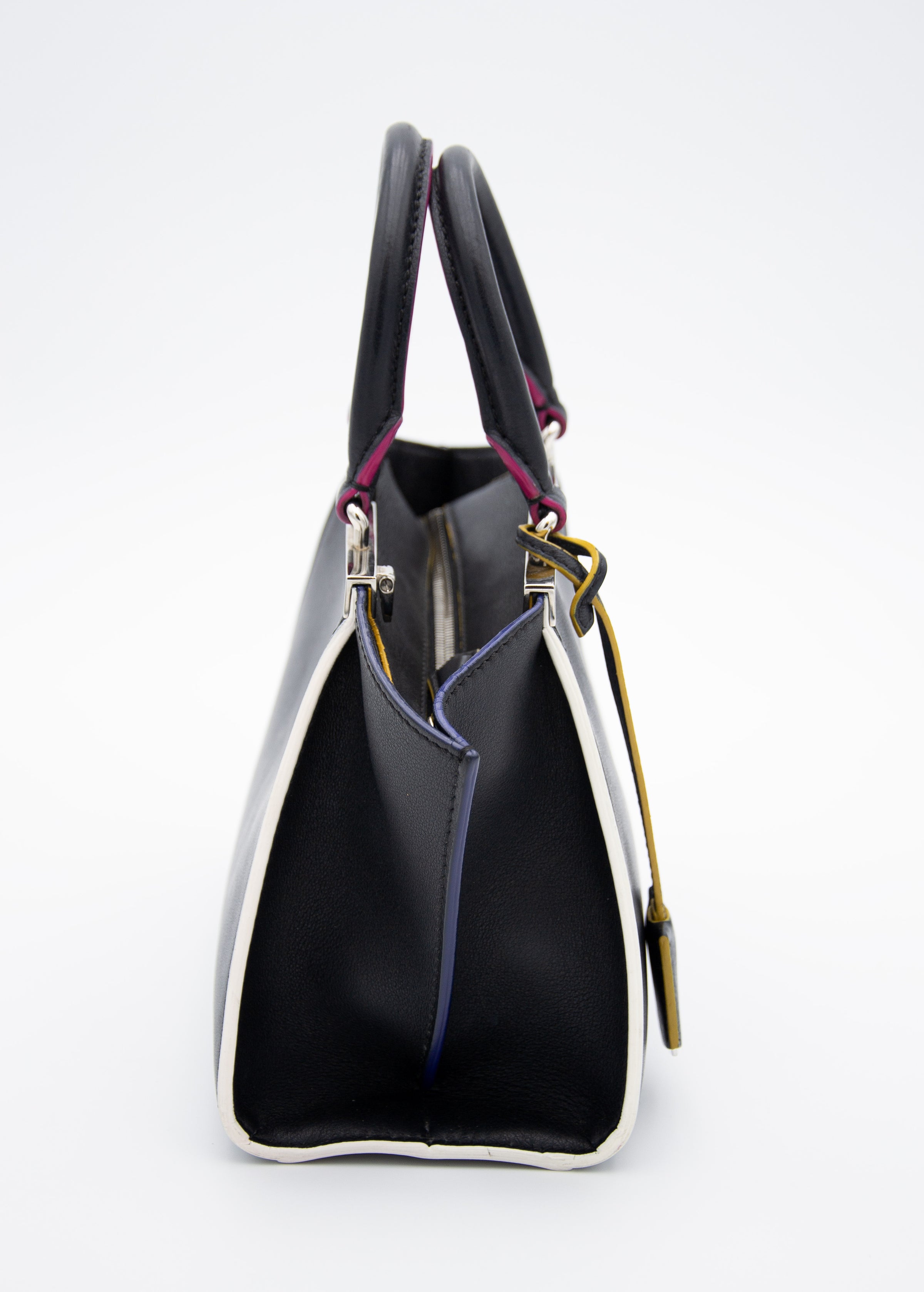 The Fendi Mini 3Jours Tote is a compact yet striking reimagining of Fendi’s iconic 2Jours bag, introduced under the creative direction of Silvia Venturini Fendi. This version combines a sleek trapezoid silhouette with structured side gussets and playful color-contrast edges in pink, yellow, blue, and white — a detail that makes it instantly recognizable.