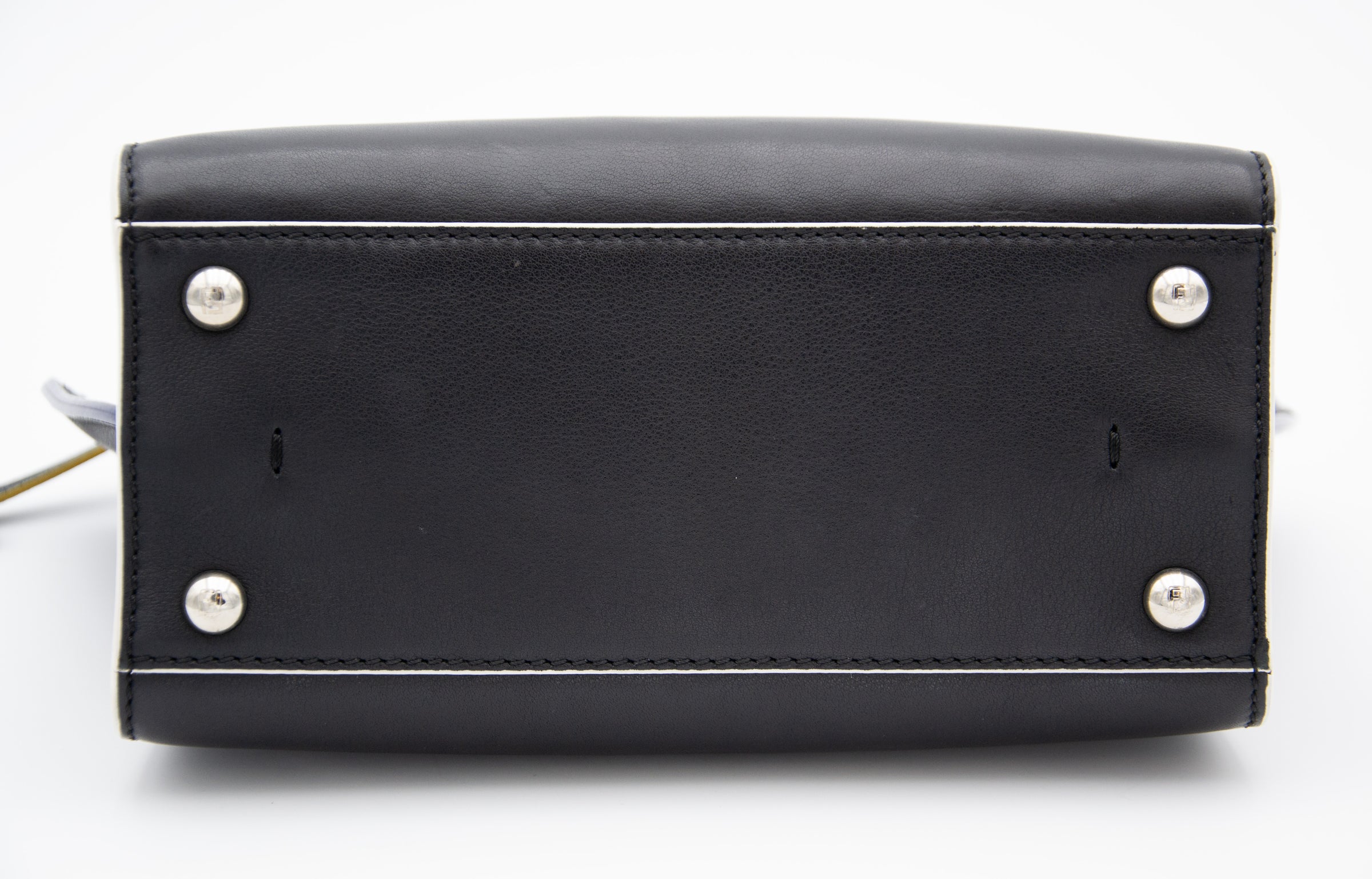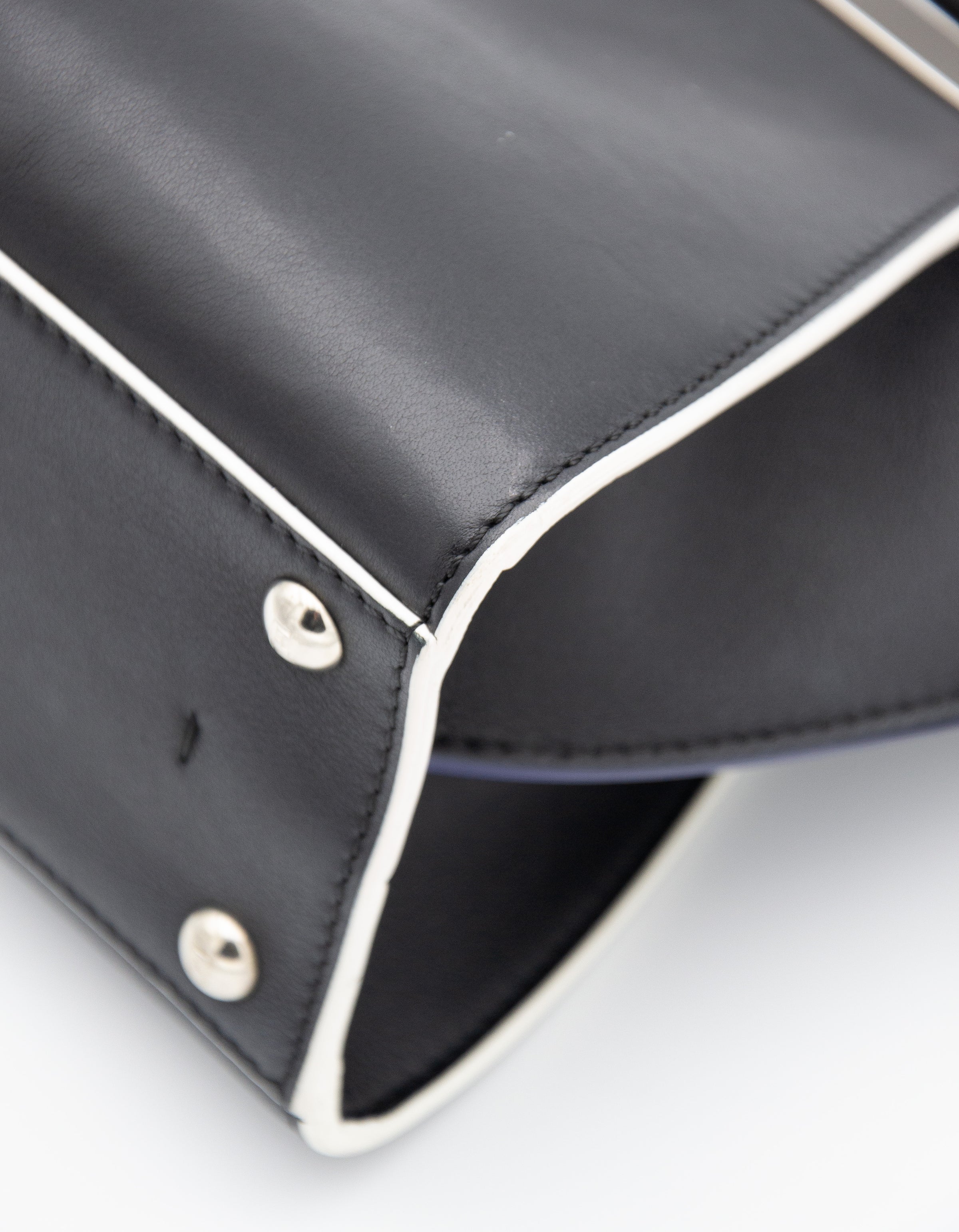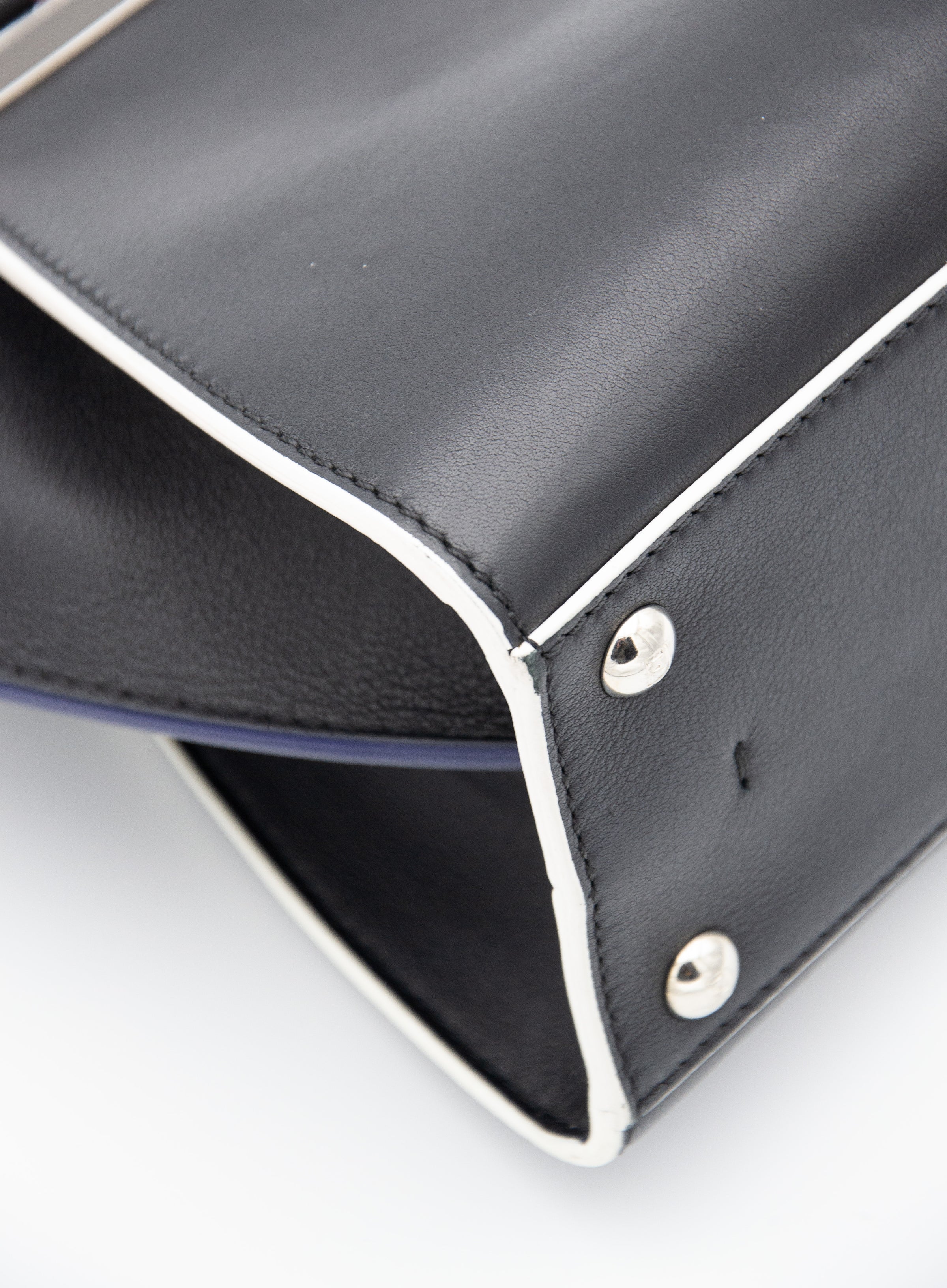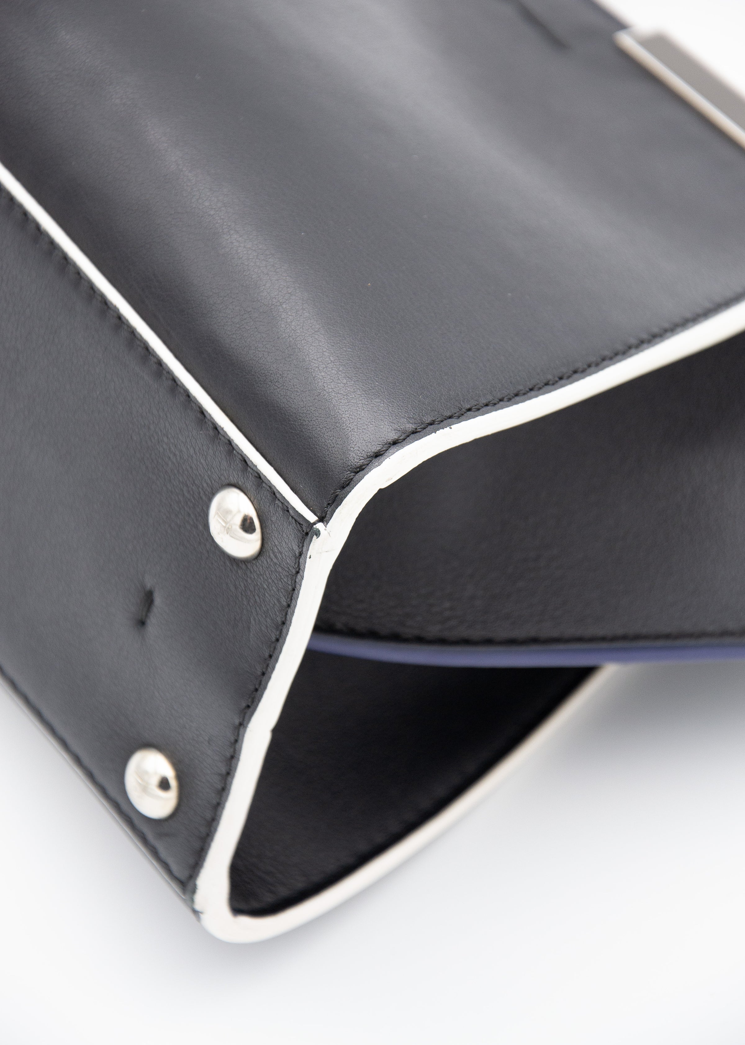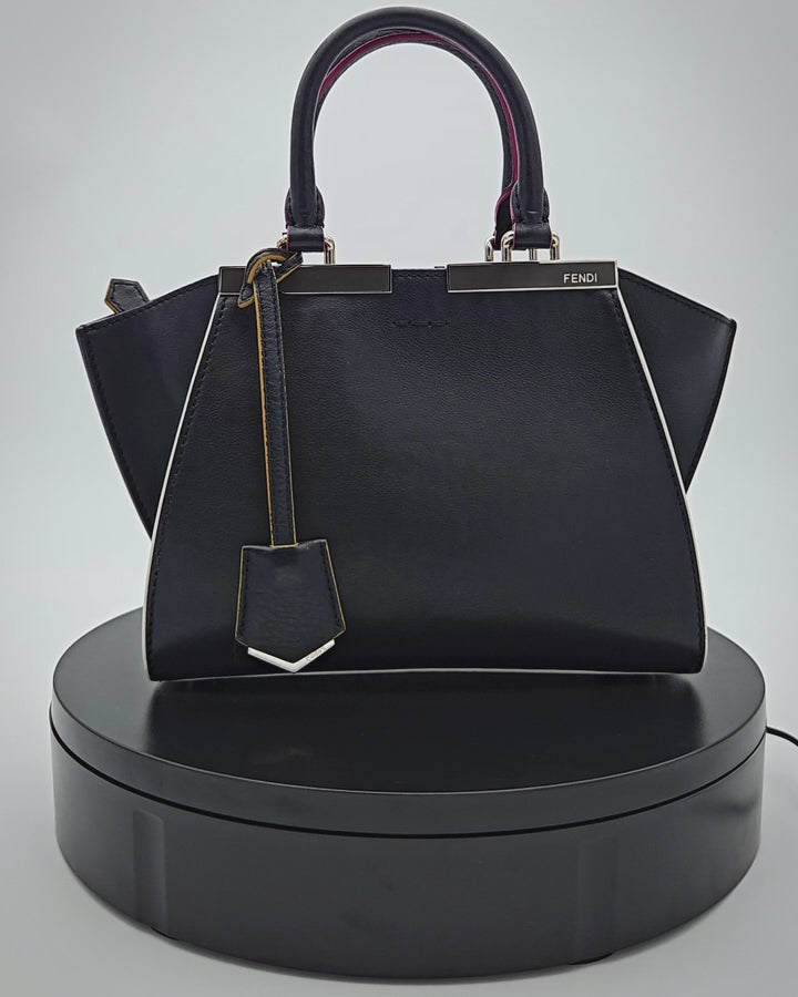 The Fendi Mini 3Jours Tote is a compact yet striking reimagining of Fendi’s iconic 2Jours bag, introduced under the creative direction of Silvia Venturini Fendi. This version combines a sleek trapezoid silhouette with structured side gussets and playful color-contrast edges in pink, yellow, blue, and white — a detail that makes it instantly recognizable.