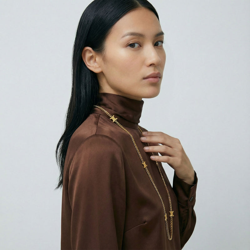 Collier Sautoir Dior Champagne Maille Jaseron avec Pendentif Abeille Pavé de Cristaux