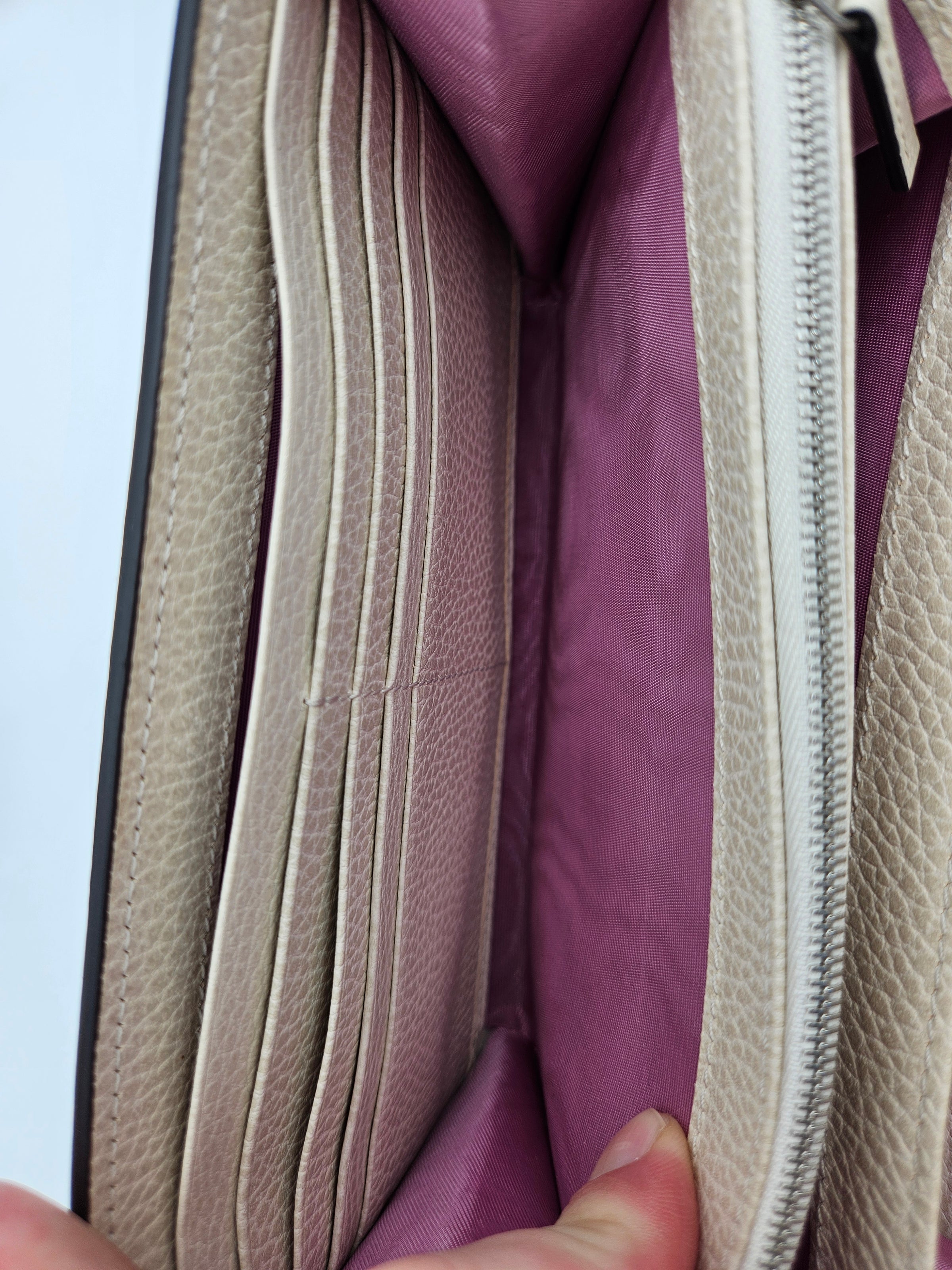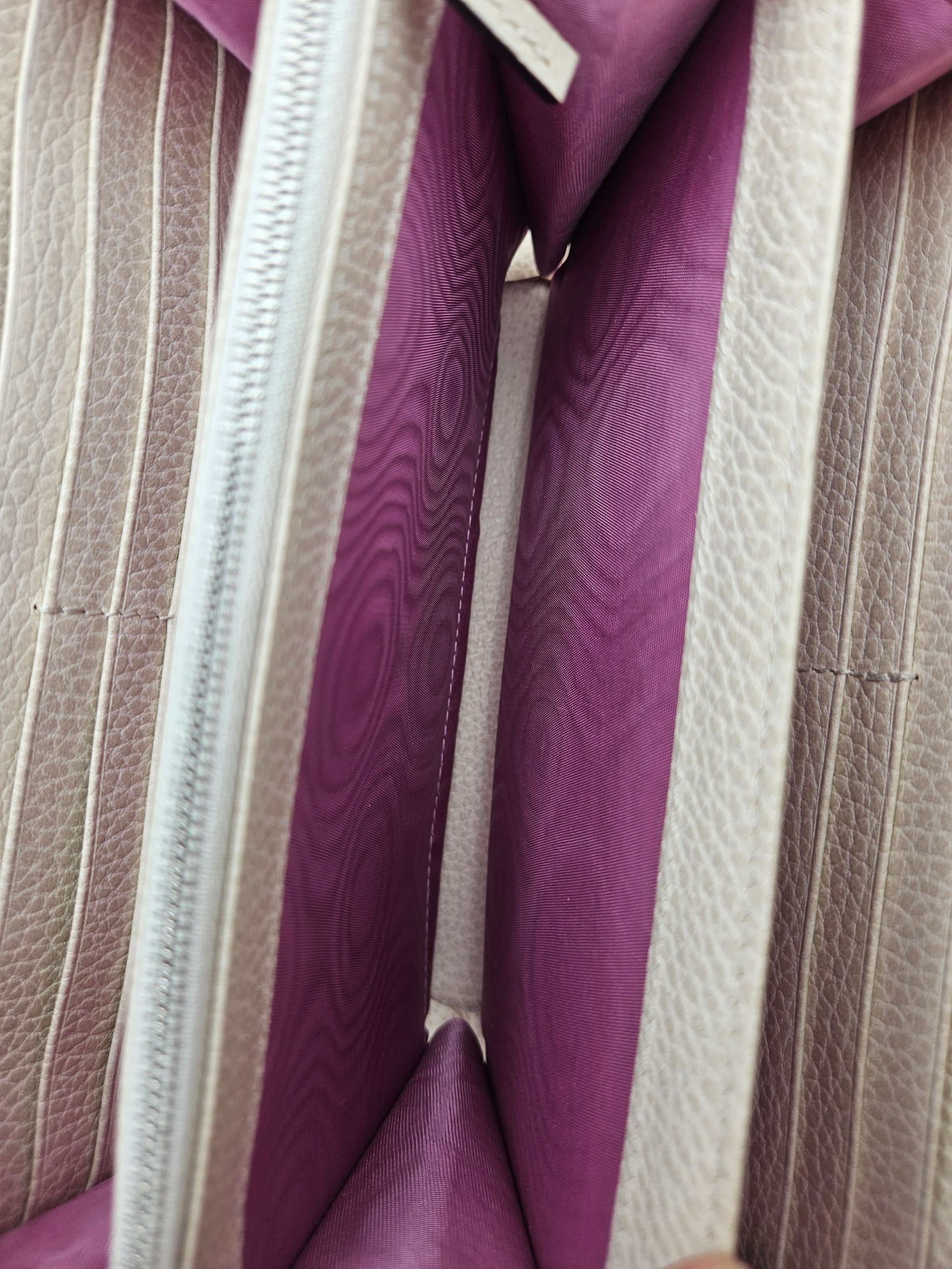 Le cuir, souple et résistant, est resté propre et bien conservé, avec seulement de légers signes d’usage et une discrète usure aux coins, cohérente avec un usage normal. L’intérieur, doublé de satin rose moiré, offre un contraste délicat et raffiné, tout en restant fonctionnel grâce à ses fentes pour cartes, idéales pour une utilisation quotidienne ou en soirée.
