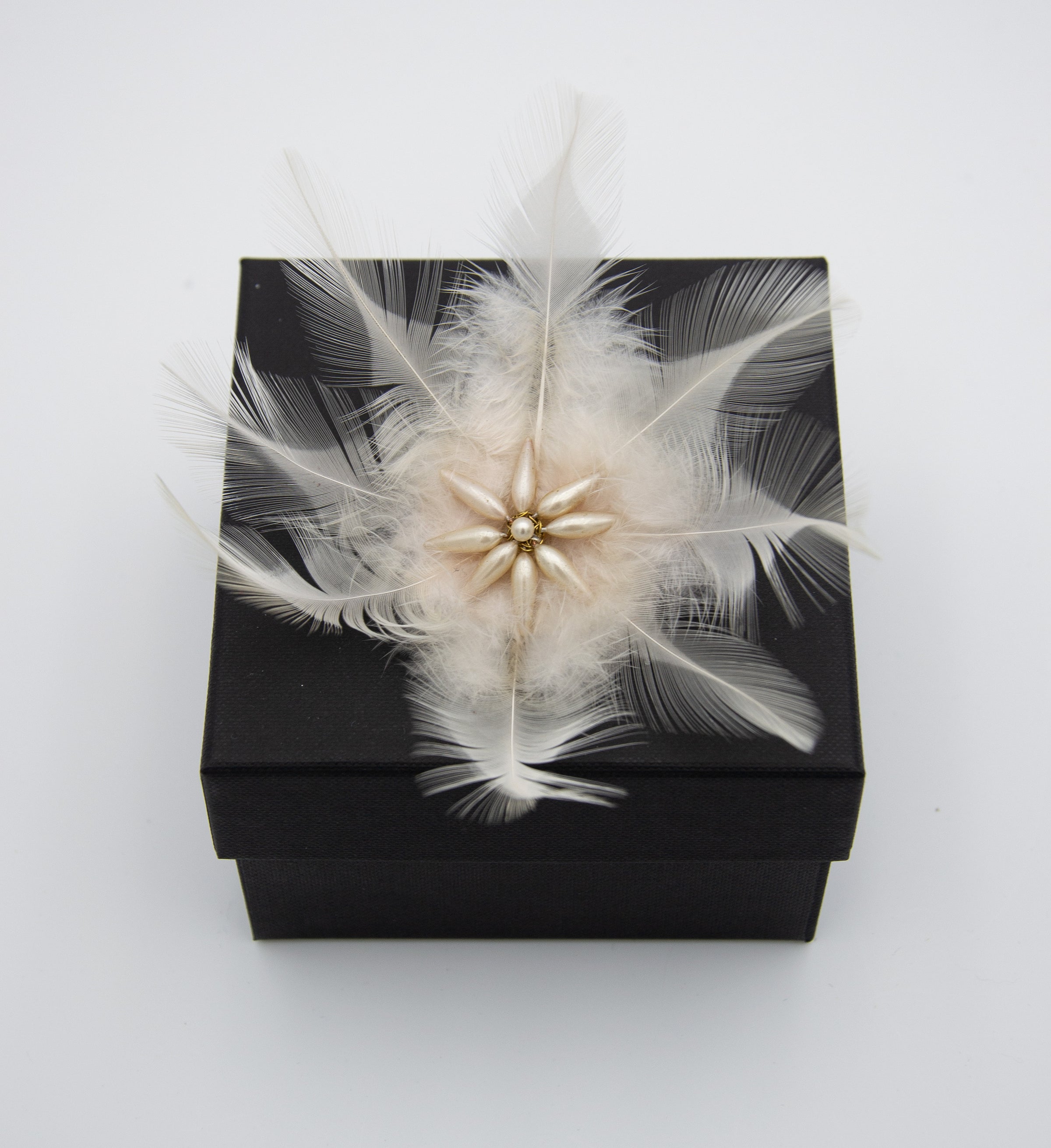 Finition : Composition délicate assemblée entièrement à la main : plumes aériennes et perles nacrées positionnées avec précision