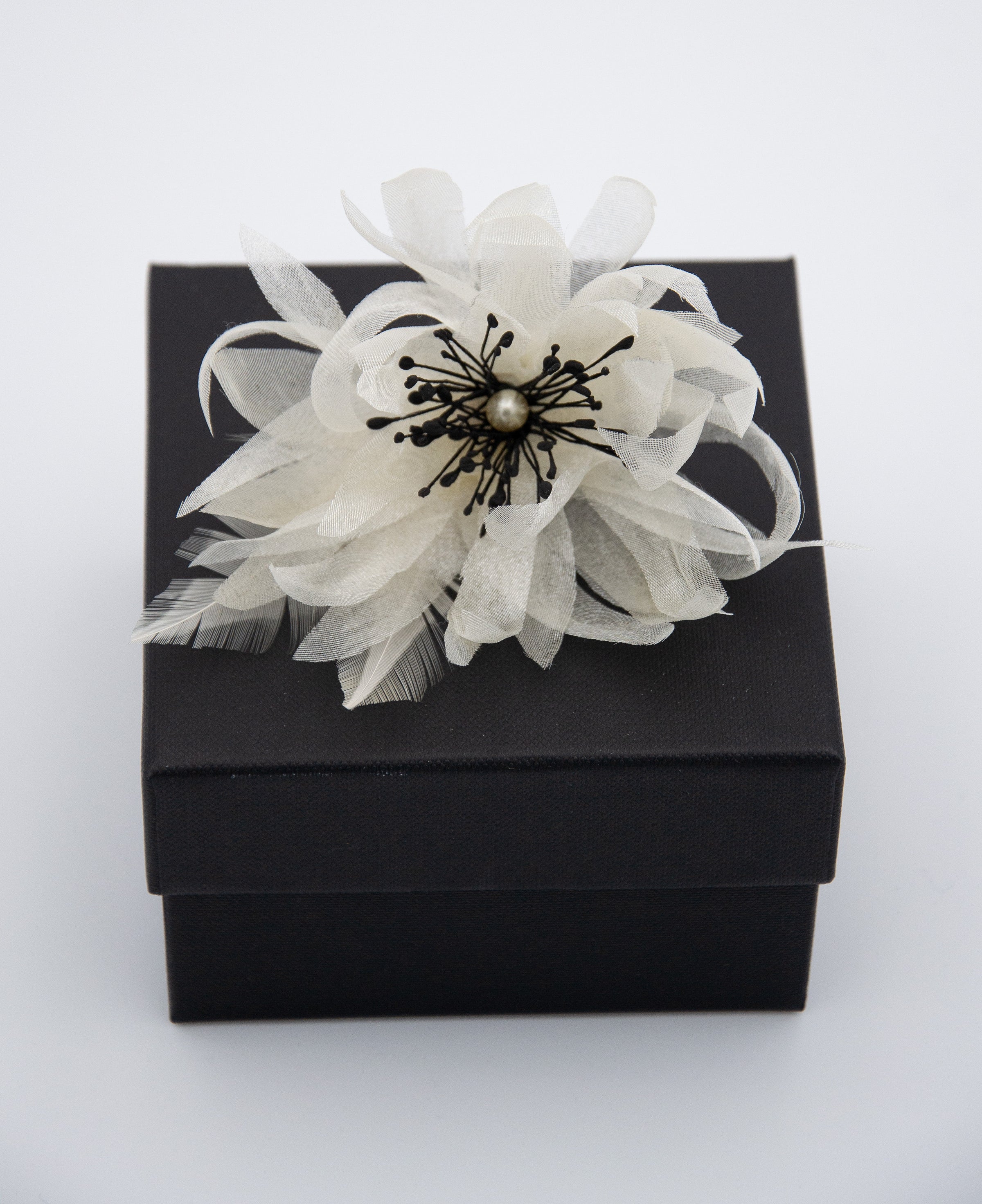 Chaque pétale est boulé puis assemblé à la main, créant un volume léger et aérien. Les plumes fines ajoutent une touche de mouvement tandis que la perle nacrée et les étamines éclairent le cœur de la fleur, apportant douceur et sophistication.
