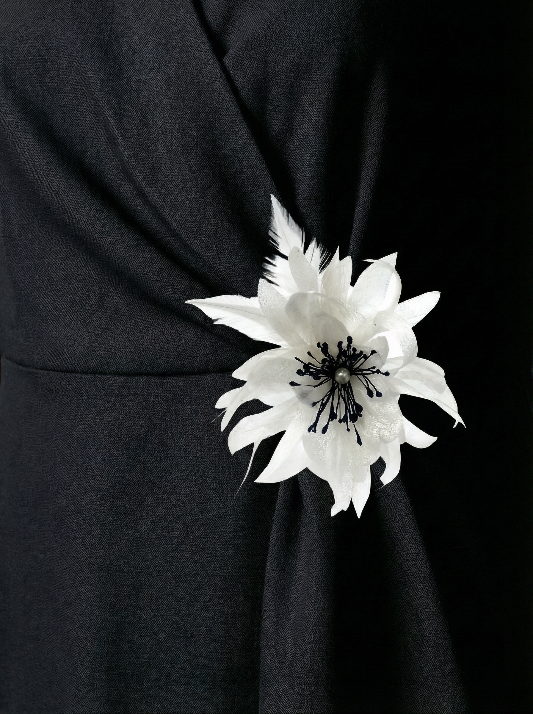 La Broche Black & White est une création délicate issue de notre collaboration avec Cécile Valantin, parurière florale parisienne dont les pièces mêlent raffinement, poésie et maîtrise artisanale. Conçue pour notre collection de Noël inspirée de Gatsby, elle joue sur le contraste intemporel du noir et blanc, tout en offrant un éclat subtil grâce à son organza de soie irisé.
