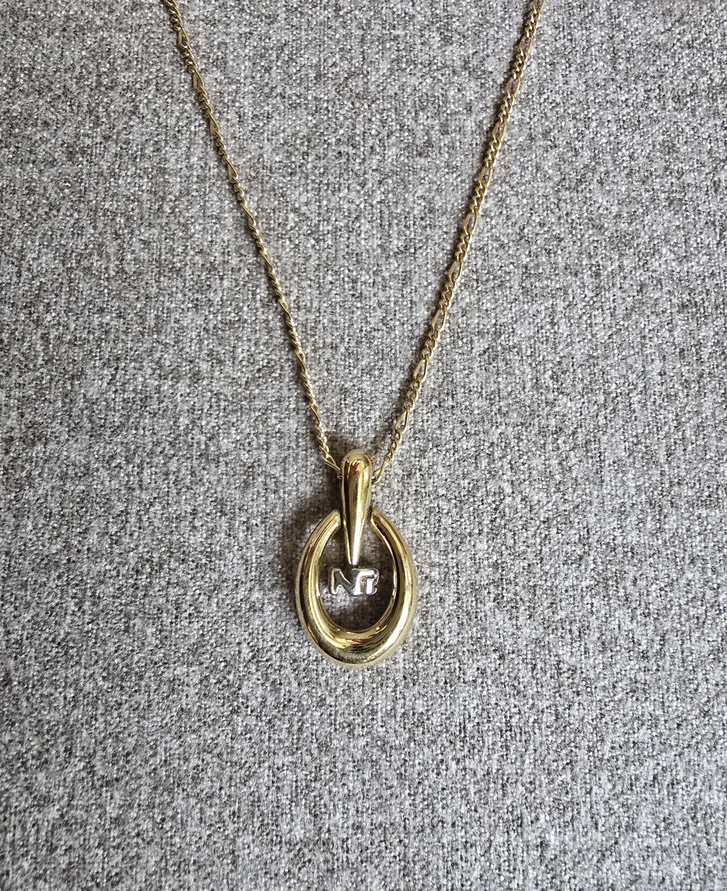 This vintage Nina Ricci necklace is a refined expression of Parisian elegance, featuring a sculptural oval pendant with the house’s iconic NR monogram at the center. Crafted in gold-tone plated metal with a subtle silver-tone accent, it embodies the understated sophistication for which Nina Ricci jewelry is celebrated.
