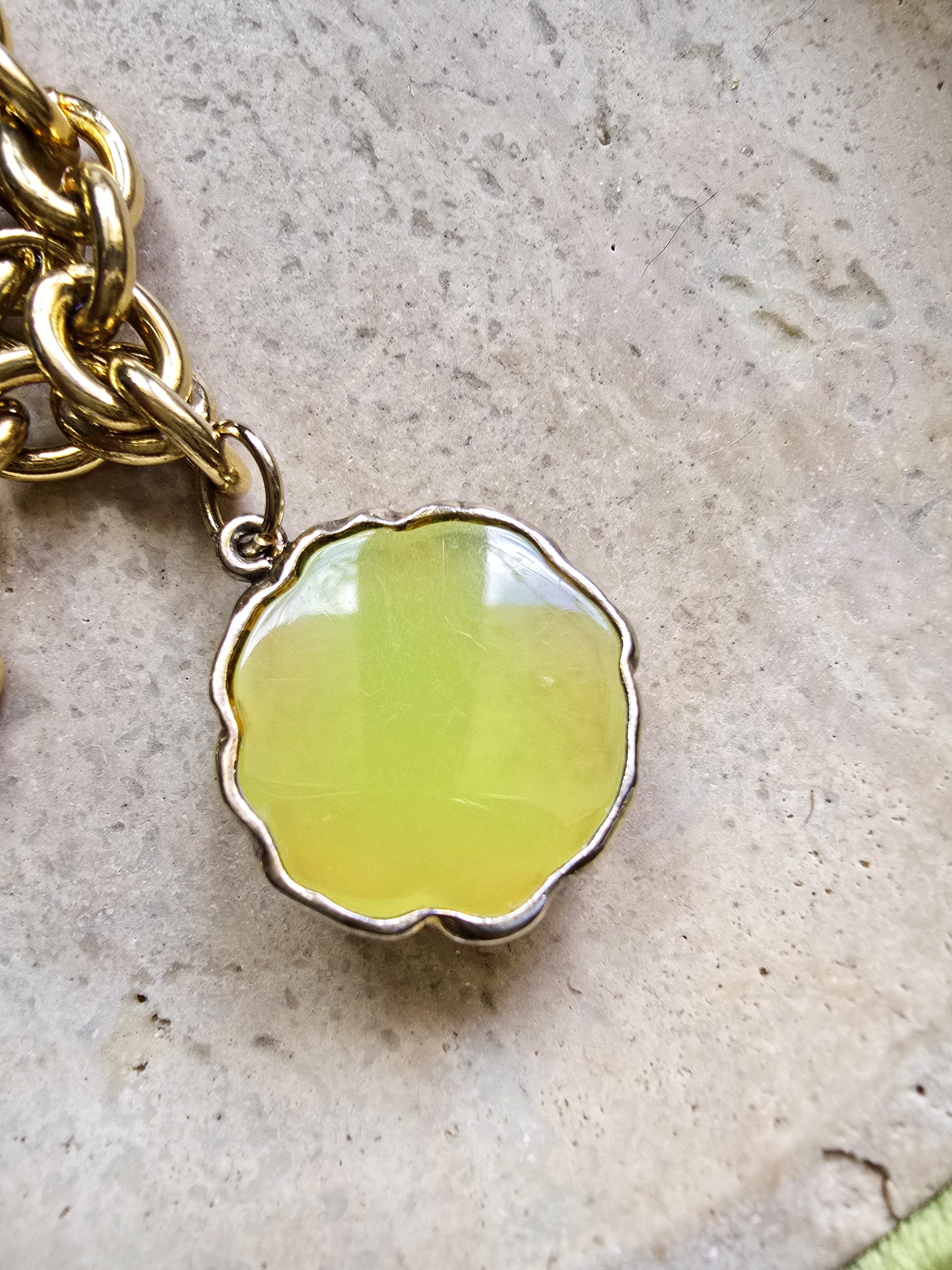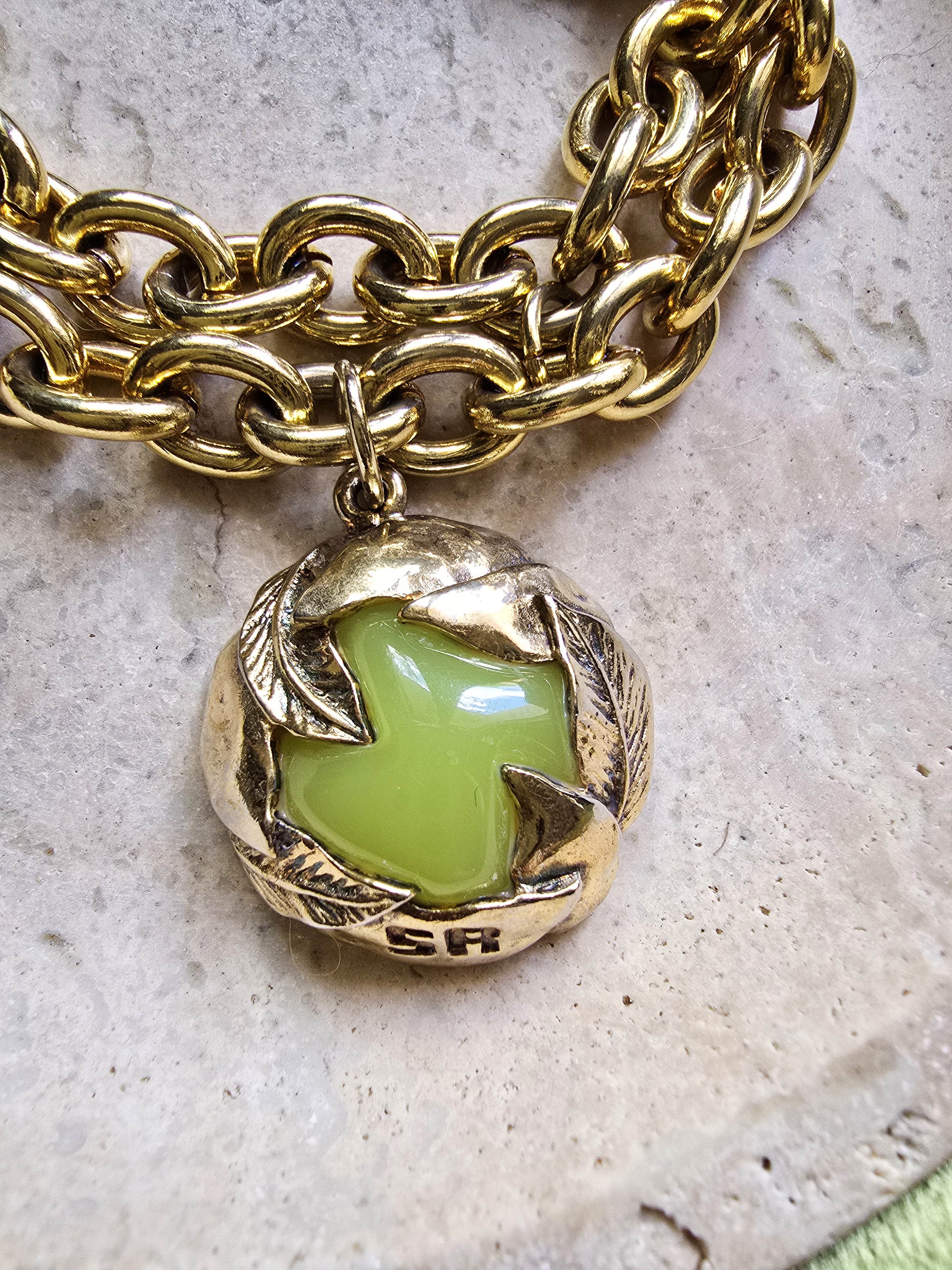 This vintage Sonia Rykiel gold-plated bracelet is a statement piece that reflects the bold and playful spirit of the French fashion house. The chunky gold-tone chain is adorned with a striking green cabochon charm framed in a sculptural leaf motif, alongside the iconic SR logo charm and a hallmarked clasp. Measuring 18 cm, it’s the perfect wrist size for making a statement while retaining wearability.