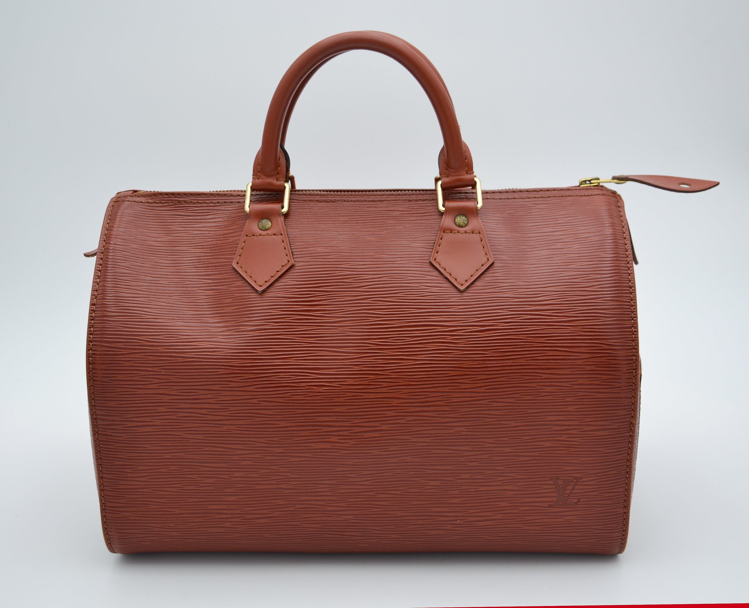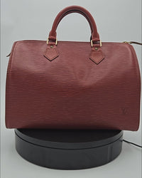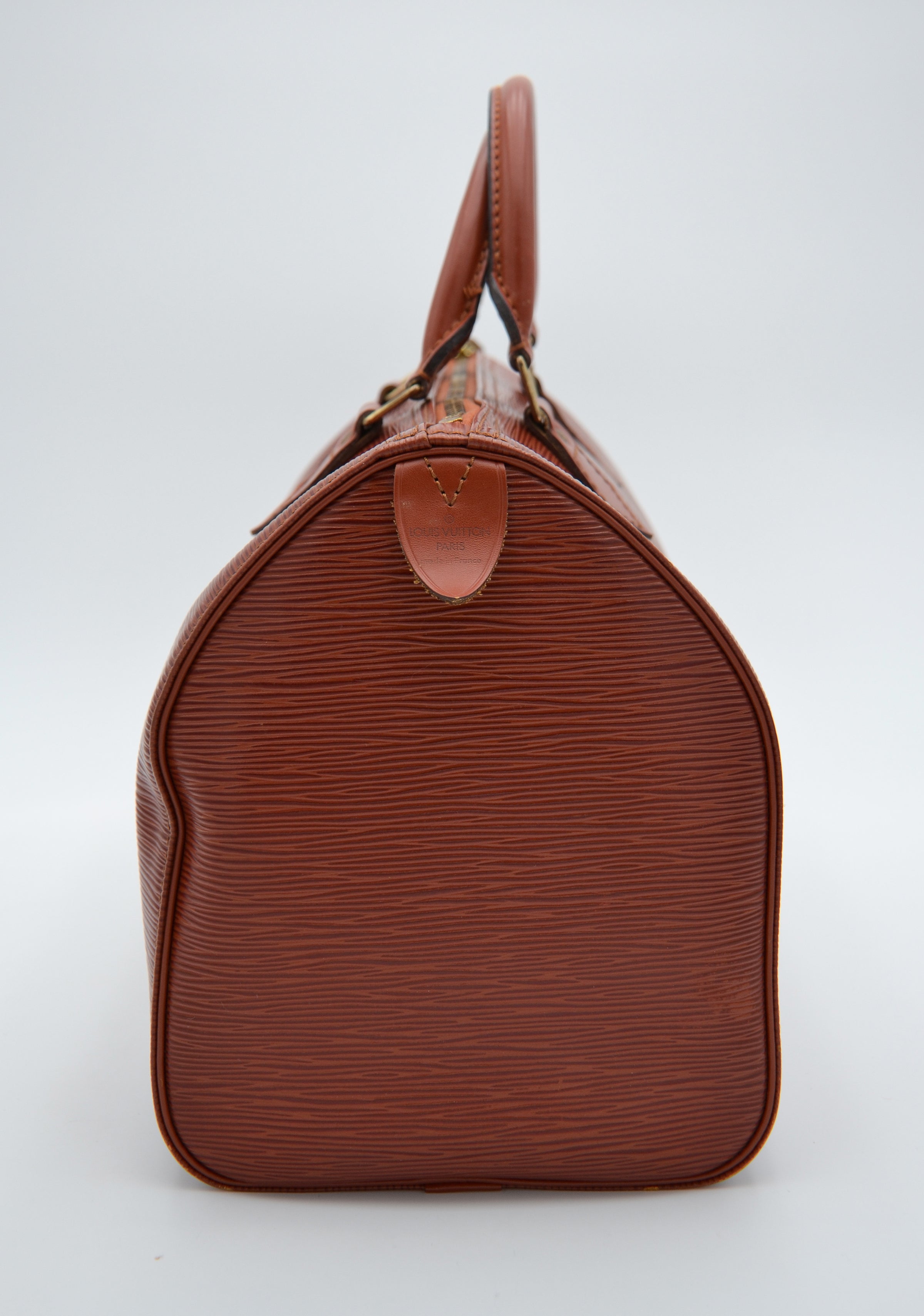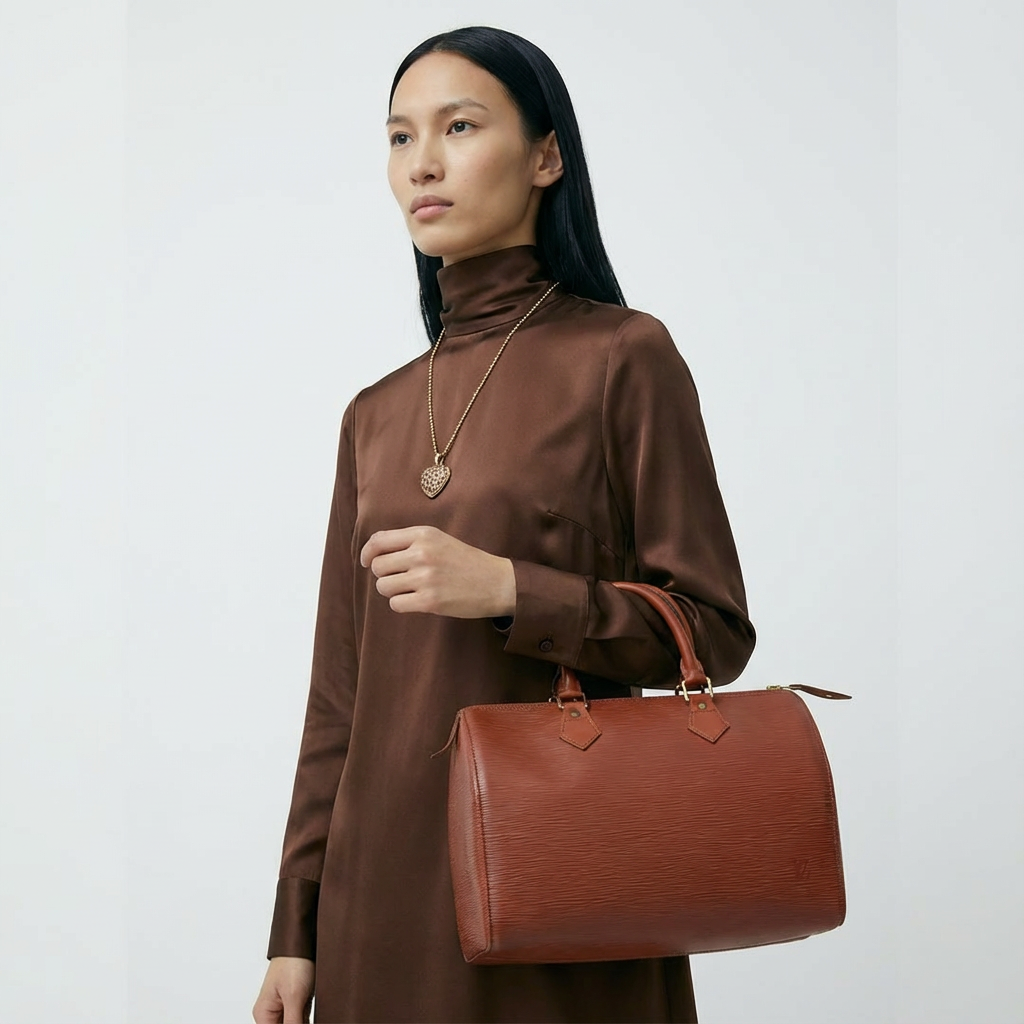 Le coloris Kenyan, un marron profond et chaleureux, confère à ce Speedy une allure chic et polyvalente, idéale aussi bien pour un usage quotidien que pour une tenue plus habillée. Le cuir est propre et bien conservé, sans défaut majeur ; seuls de légers frottements aux coins et de discrètes marques d’usage témoignent de son vécu, sans altérer son élégance ni sa structure.
