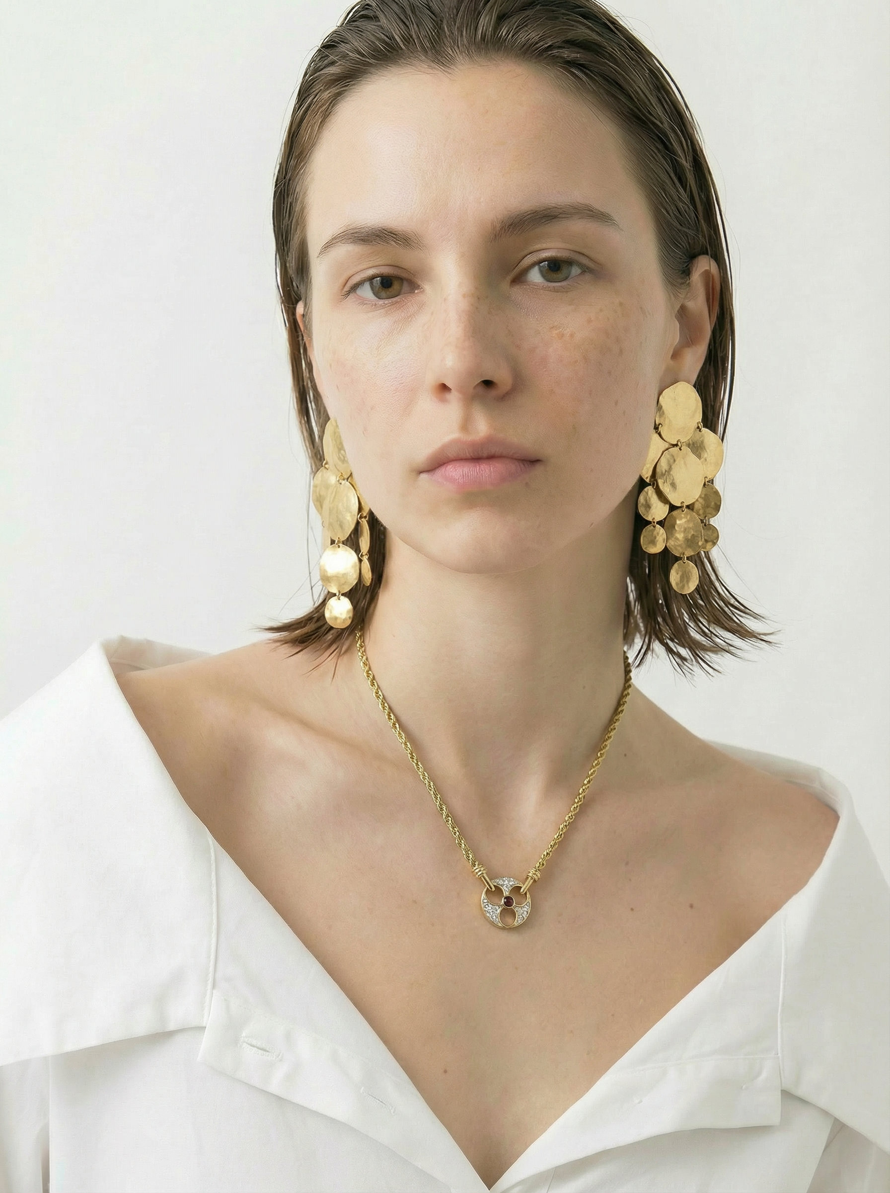 This vintage Nina Ricci necklace is a refined statement piece that perfectly embodies the maison’s timeless Parisian elegance. Designed with a textured gold-tone rope chain, it features a circular pendant set with sparkling rhinestones and a striking red cabochon stone at its center. The piece balances classic glamour with a bold focal point, making it versatile enough for both day and evening wear.
