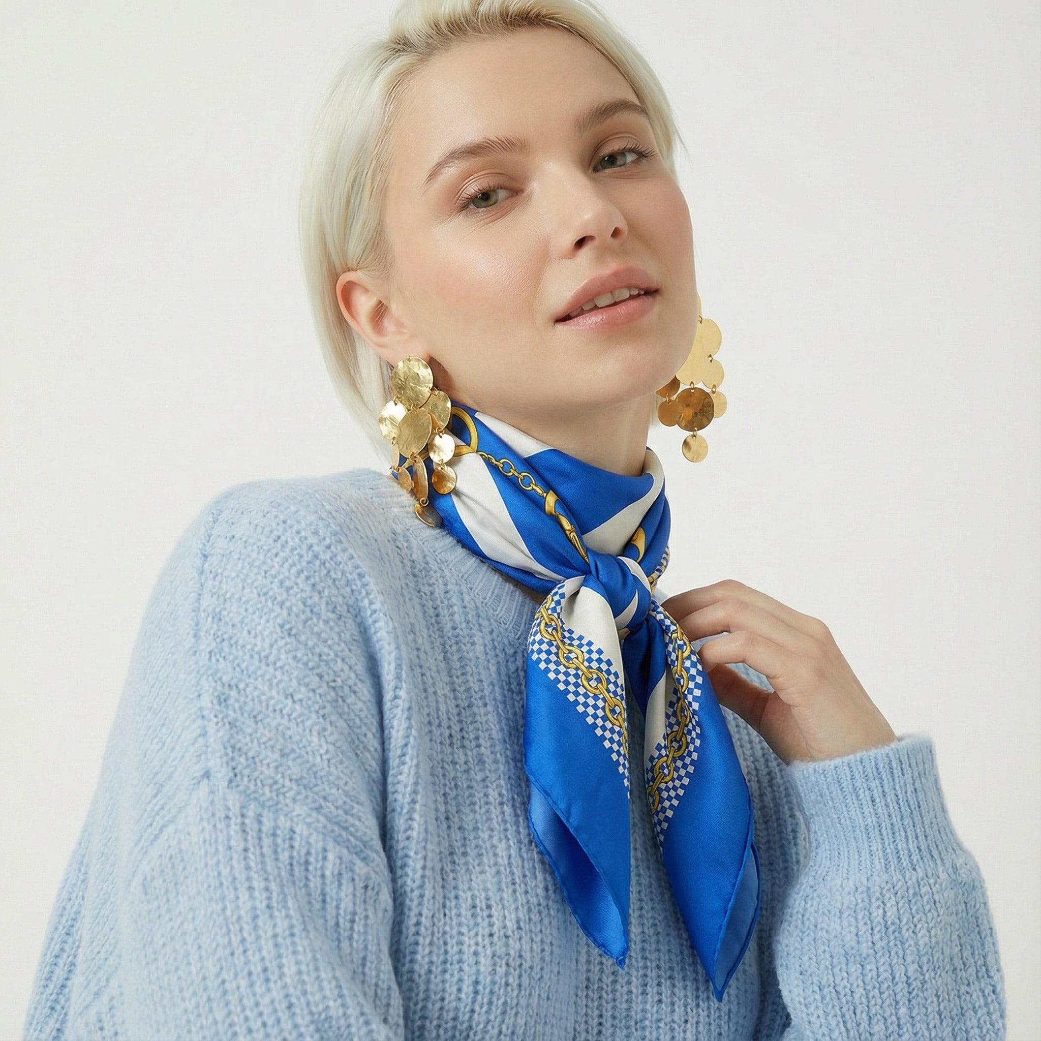 Ce foulard Céline en soie 100 % est une pièce emblématique du luxe parisien, reconnaissable à son élégant motif de chaînes dorées sur fond bleu et blanc graphique. Confectionné en Italie, il bénéficie d’une finition haut de gamme avec bords roulottés à la main, signature des carrés de soie de grande qualité.