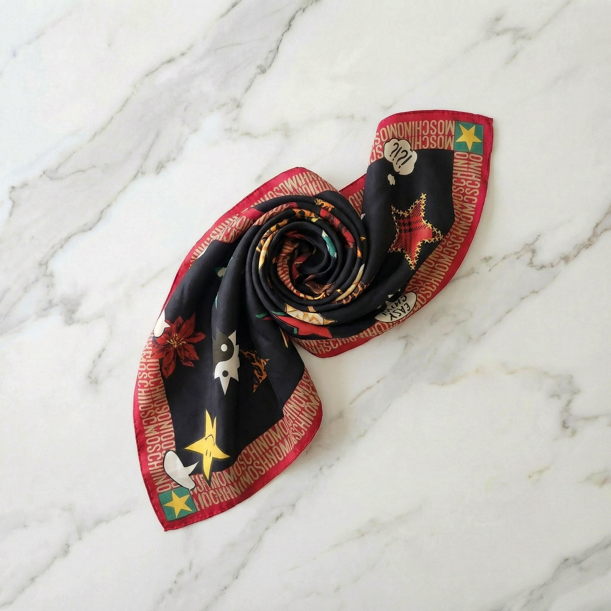 Ce foulard rectangulaire Moschino en soie est une pièce vintage audacieuse et emblématique de l’univers créatif de la maison italienne. Fidèle à l’ADN excentrique et pop de Moschino, il associe un fond noir profond à une bordure rouge vibrante ornée de l’inscription répétée « MOSCHINO », véritable signature visuelle forte.