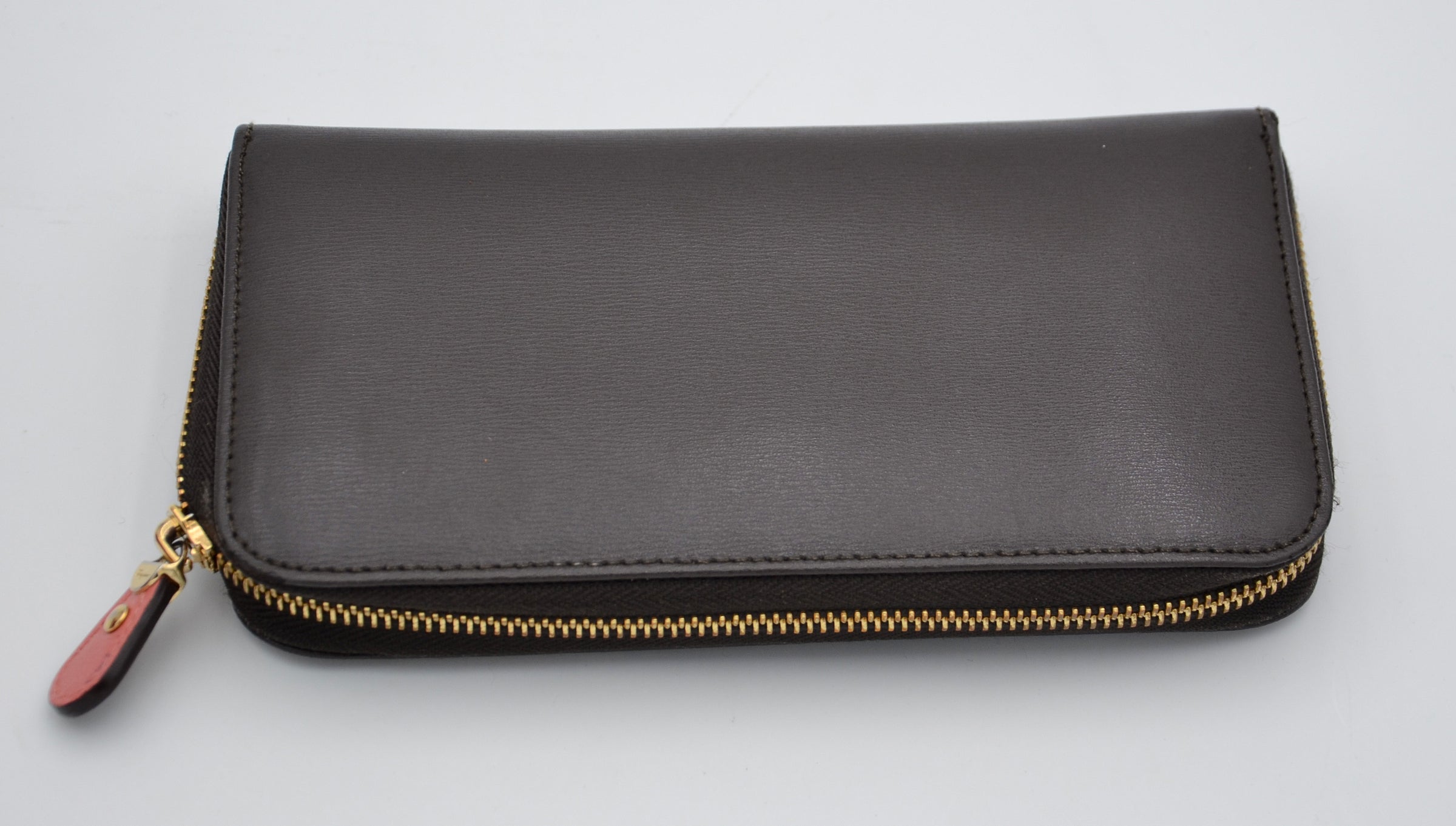 Ce portefeuille zippy Salvatore Ferragamo en cuir noir lisse incarne l’élégance sobre et le raffinement emblématique de la maison italienne. Le devant est sublimé par le célèbre motif Gancini, signature iconique de Ferragamo, rehaussé d’une bijouterie dorée qui apporte une touche luxueuse et intemporelle à l’ensemble.
