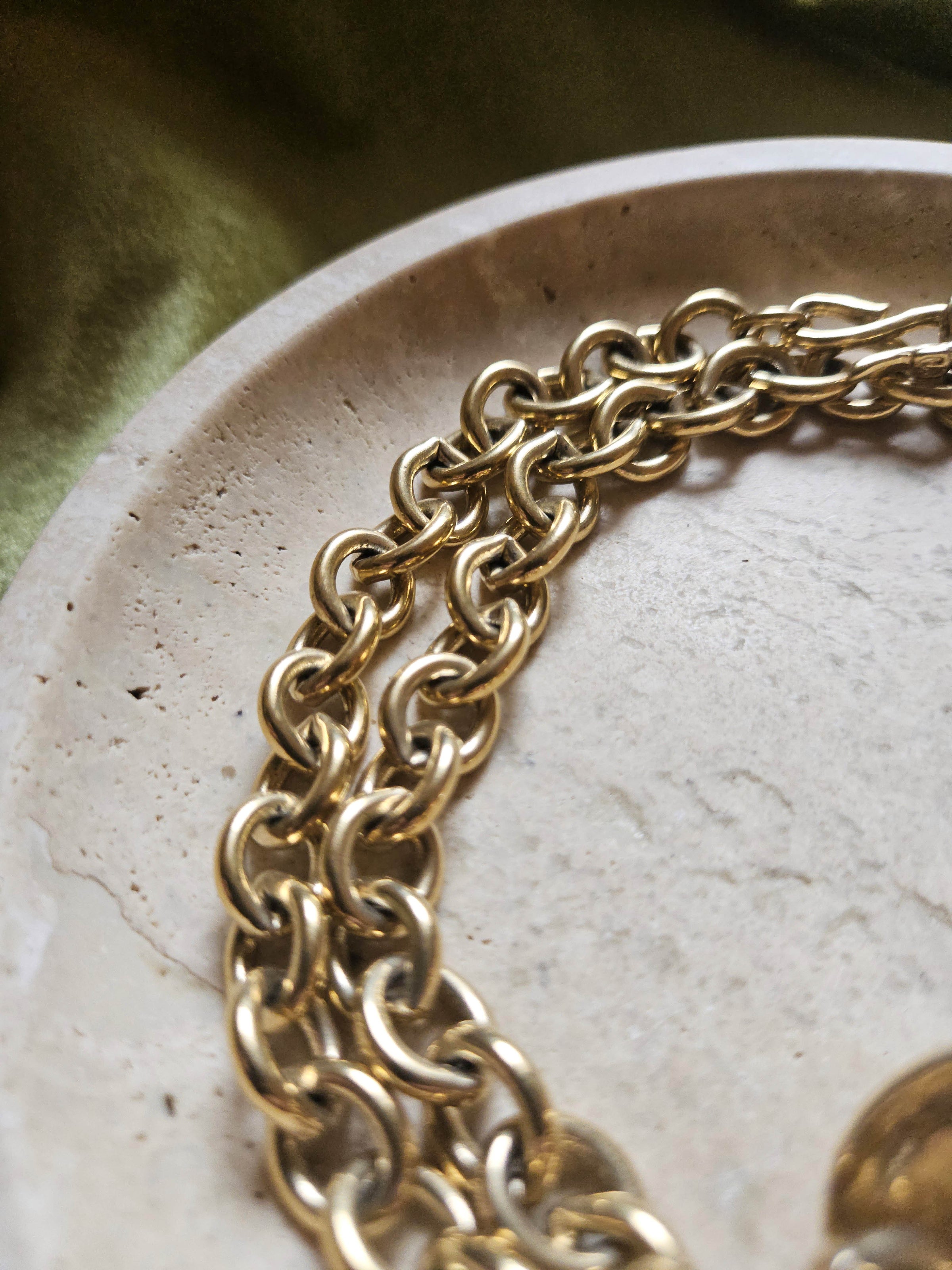 Ce collier Givenchy vintage à gros maillons dorés incarne la quintessence du style sophistiqué et glamour des années 1980. Réalisé en métal plaqué or de haute qualité, il se distingue par son pendentif orné d’une fausse perle irisée, délicatement mise en valeur par la brillance du doré. La gravure “Givenchy Paris” sur les pendentifs souligne l’authenticité et le prestige de cette création.