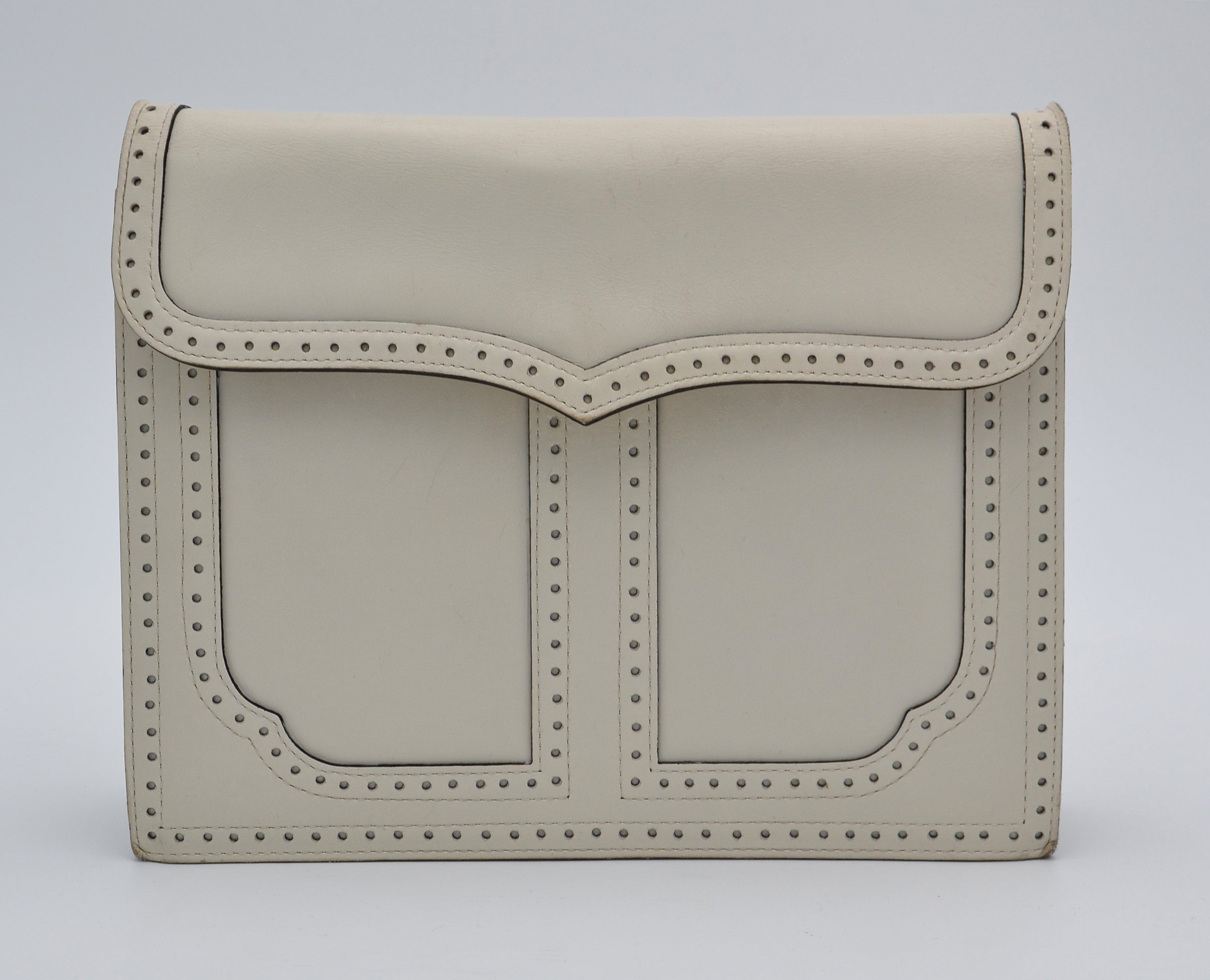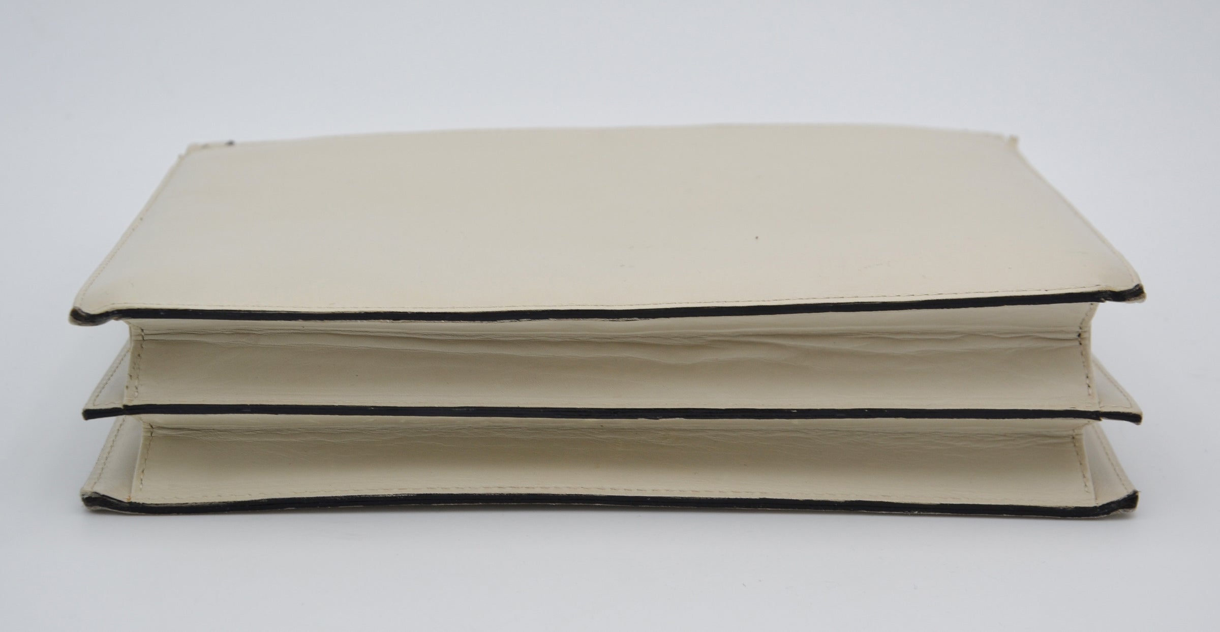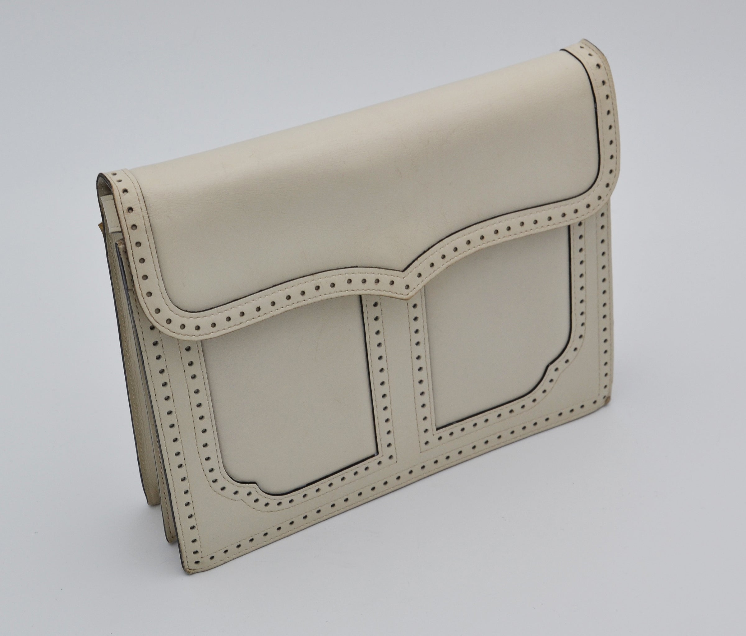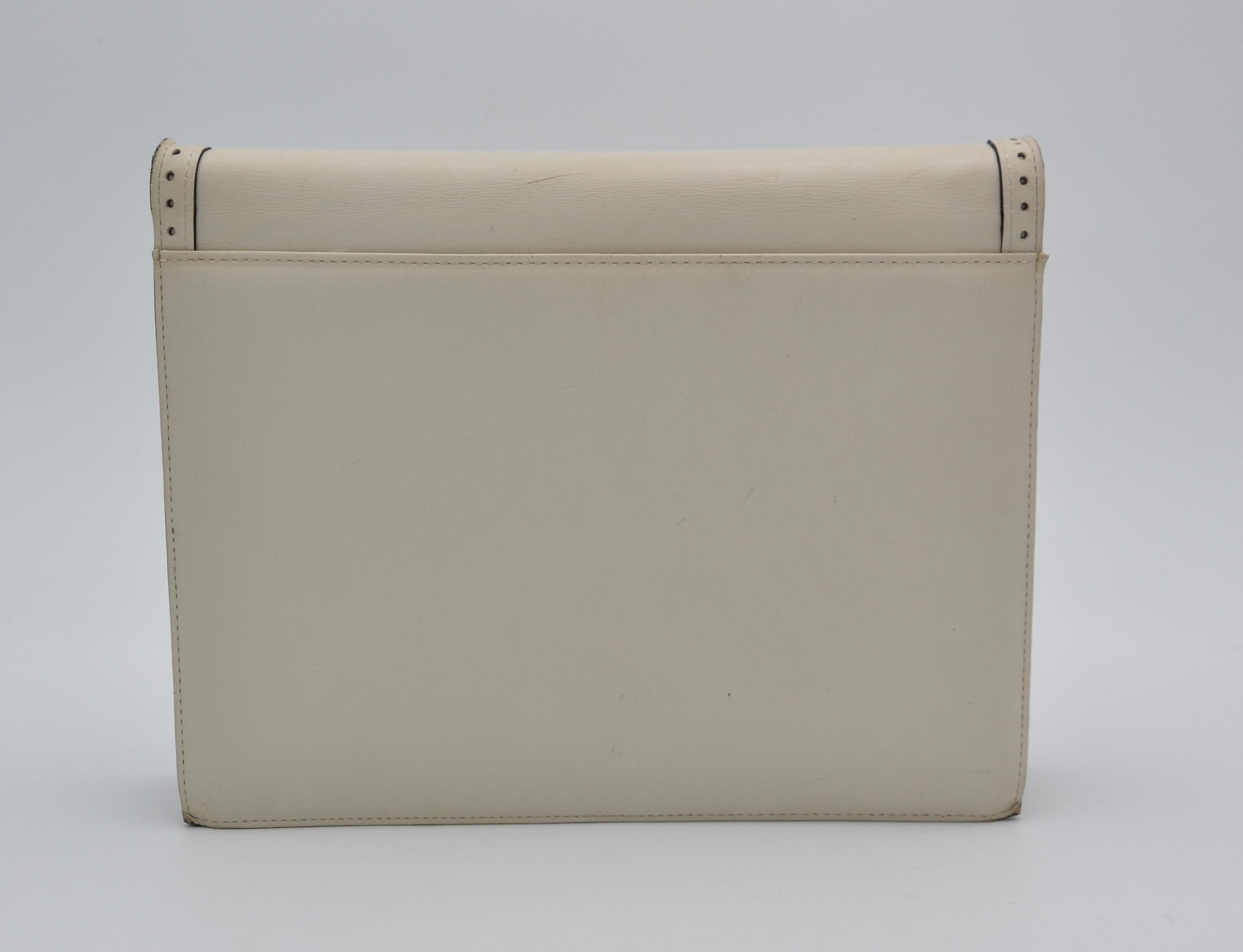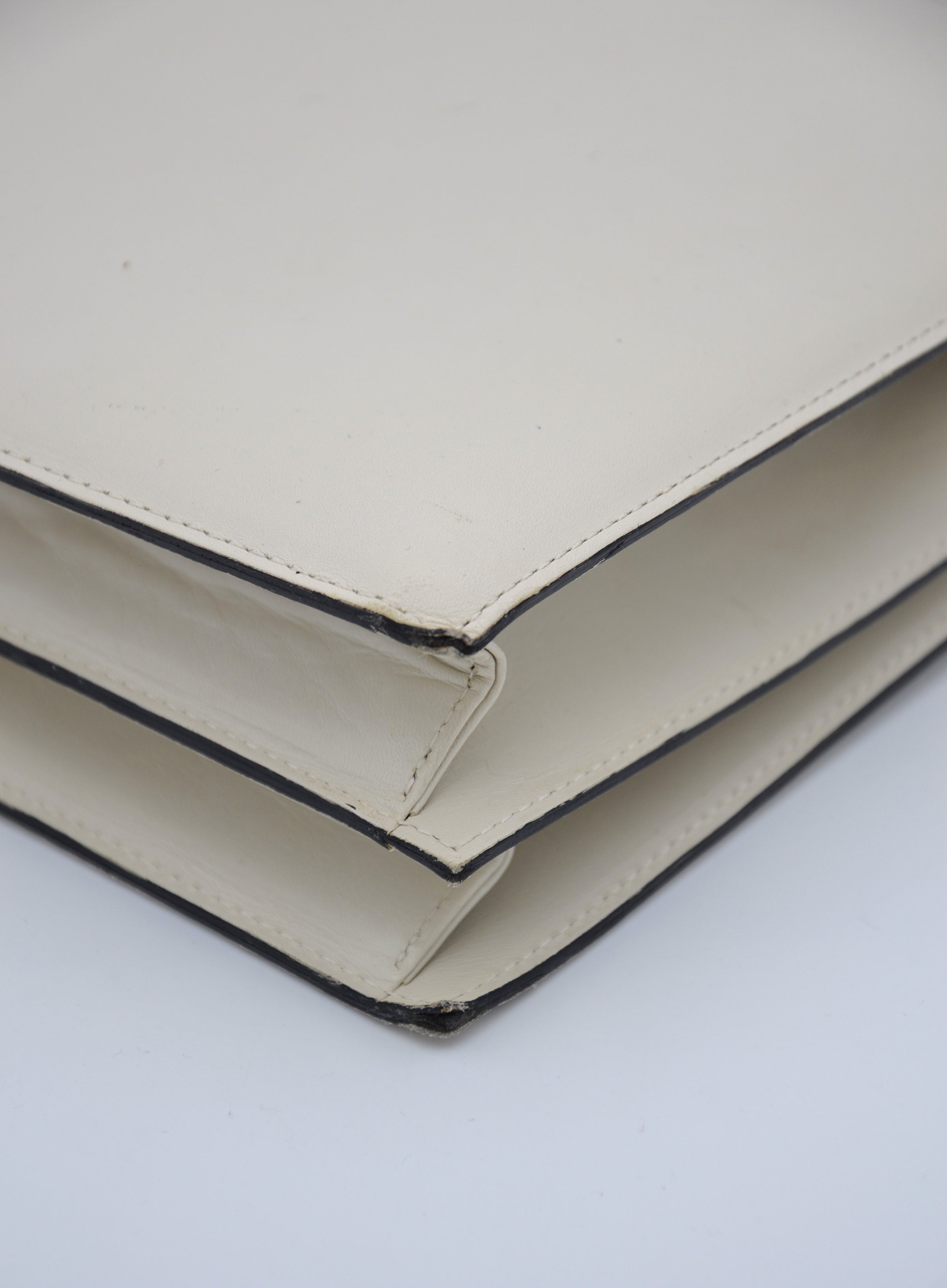 Ce sac Yves Saint Laurent vintage combine élégance classique et praticité moderne dans un format crossbody boxy compact, parfait pour compléter une tenue chic ou décontractée. Fabriqué en cuir blanc de qualité, il présente de subtils détails perforés le long des bords, ajoutant une touche raffinée et unique au design. L’extérieur est en bon état général, avec des tranches et coins propres et sans défauts particuliers, assurant une allure intacte malgré les années. On note une légère décoloration sous le rabat, visible sur les photos, qui s’intègre bien au caractère vintage du sac.