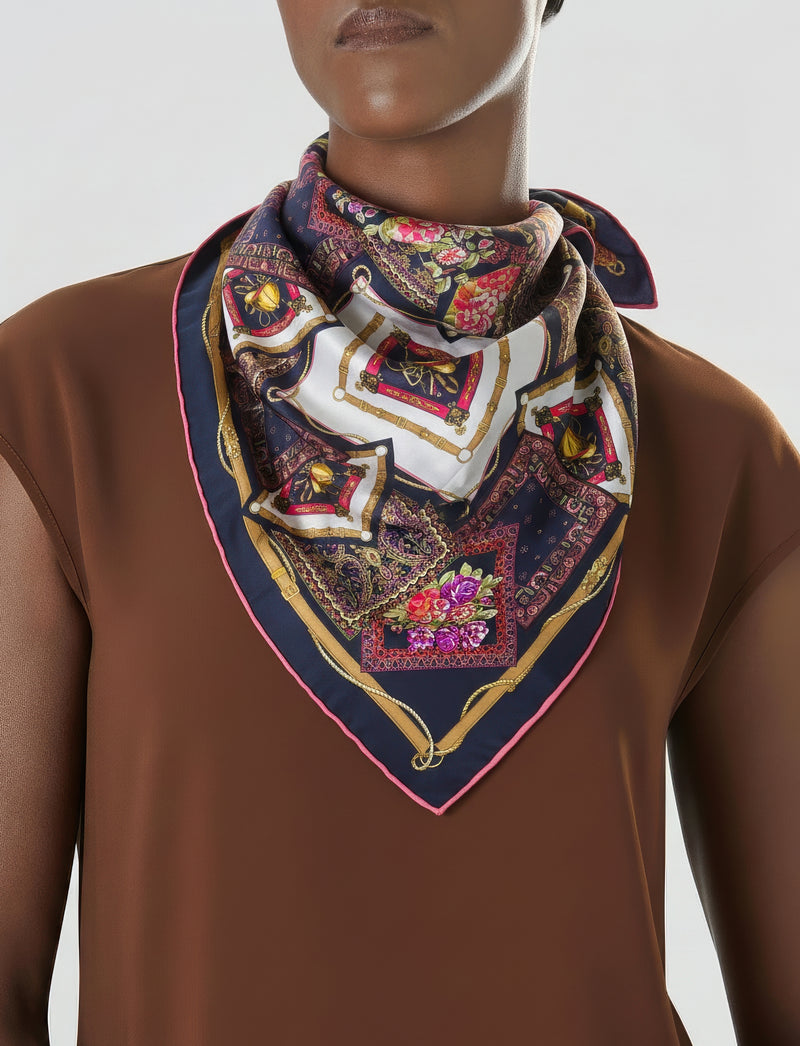 Celine Cotton Scarf – Navy Blue with Gold Motif