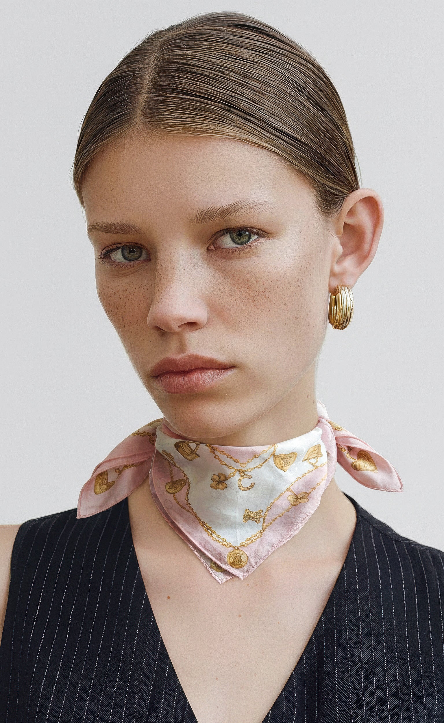 This vintage Celine cotton scarf is a playful yet elegant design, featuring a soft pink center framed by a powder-blue border adorned with golden charm motifs. The whimsical details include hearts, handbags, clovers, and medallions — all symbolic of Celine’s charm-driven accessory collections. Feminine yet chic, this scarf embodies the house’s ability to balance refined Parisian luxury with lighthearted design.