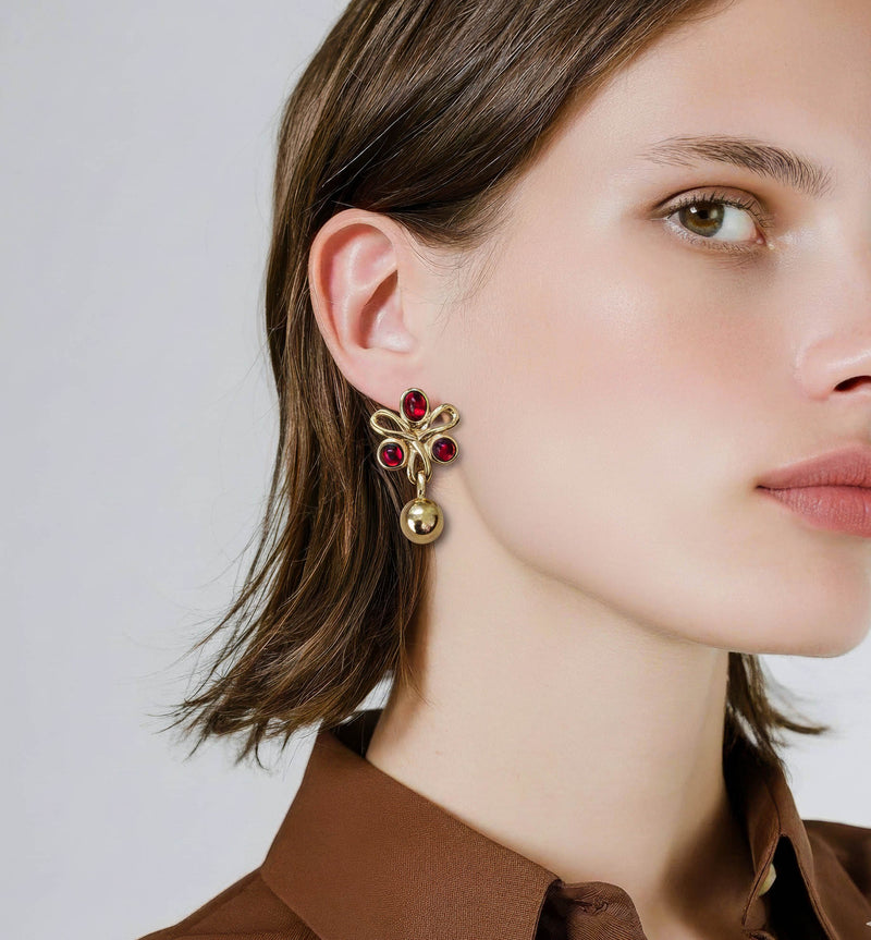 Nina Ricci Vintage Gold Clip-On Earrings with Red Cabochon
