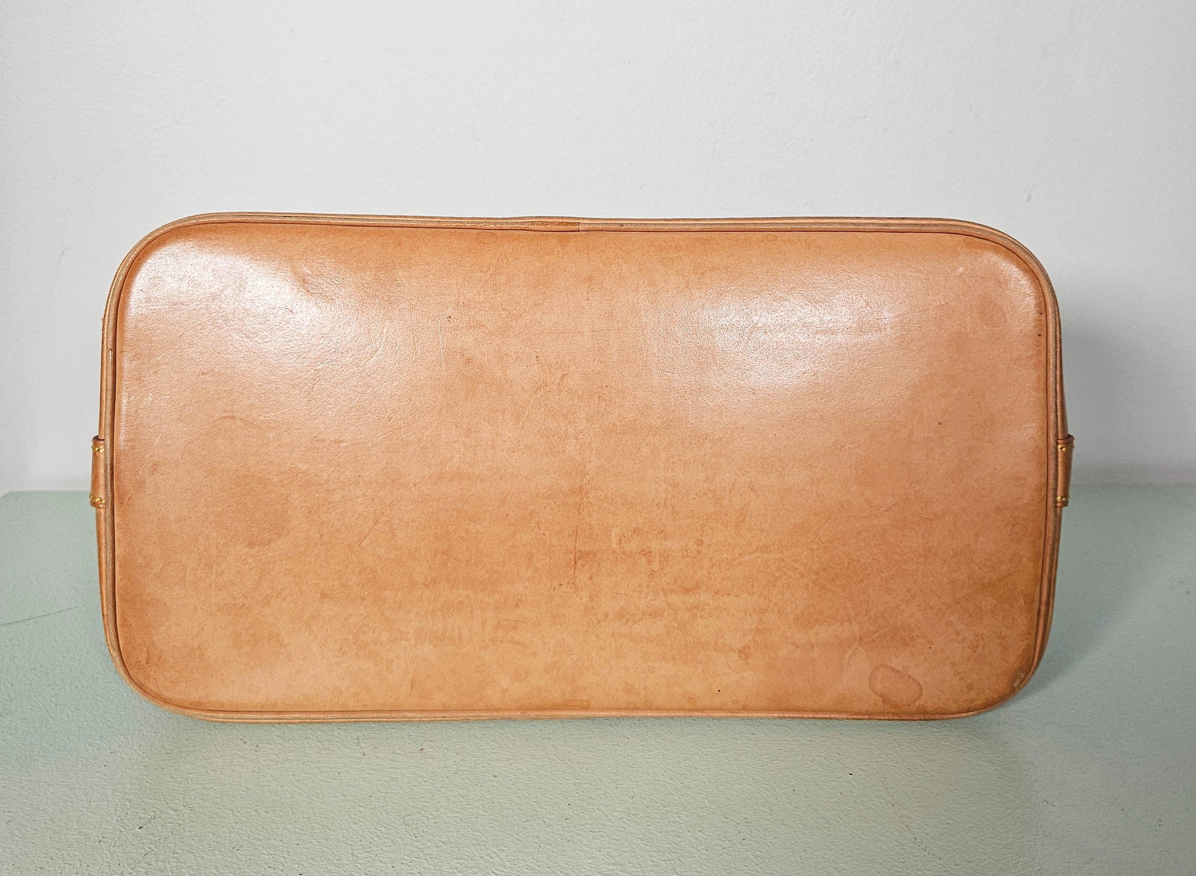 État : Bon état vintage : très légère patine claire sur les parties en cuir, pas de défauts majeurs, légers signes d’utilisation au niveau des poignées, toile propre et non abîmée