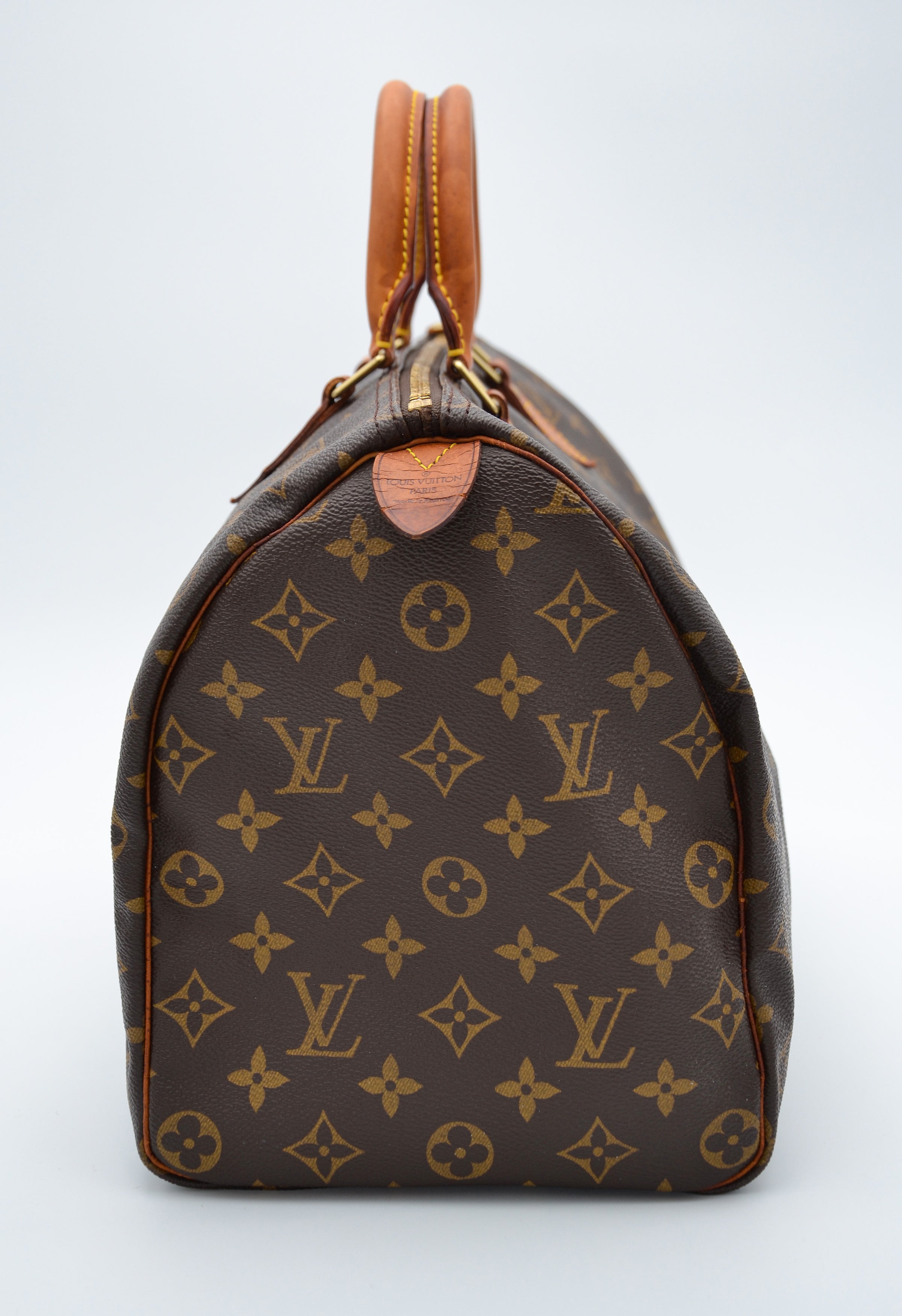 Louis Vuitton, fondée en 1854, a bâti sa réputation sur l’art du voyage et l’excellence artisanale. Le Speedy reflète parfaitement cet héritage : léger, élégant, pensé pour durer. Le modèle présenté ici, en bon état général, conserve toute sa structure et son charme grâce à une toile intacte, des coins préservés et une patine douce qui enrichit son caractère vintage.