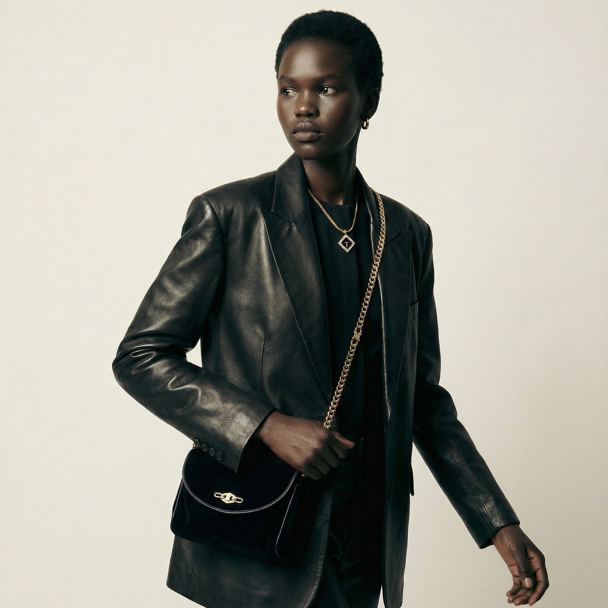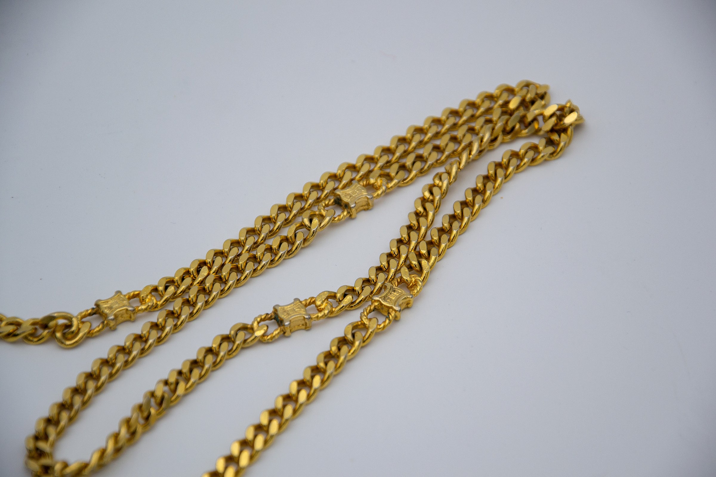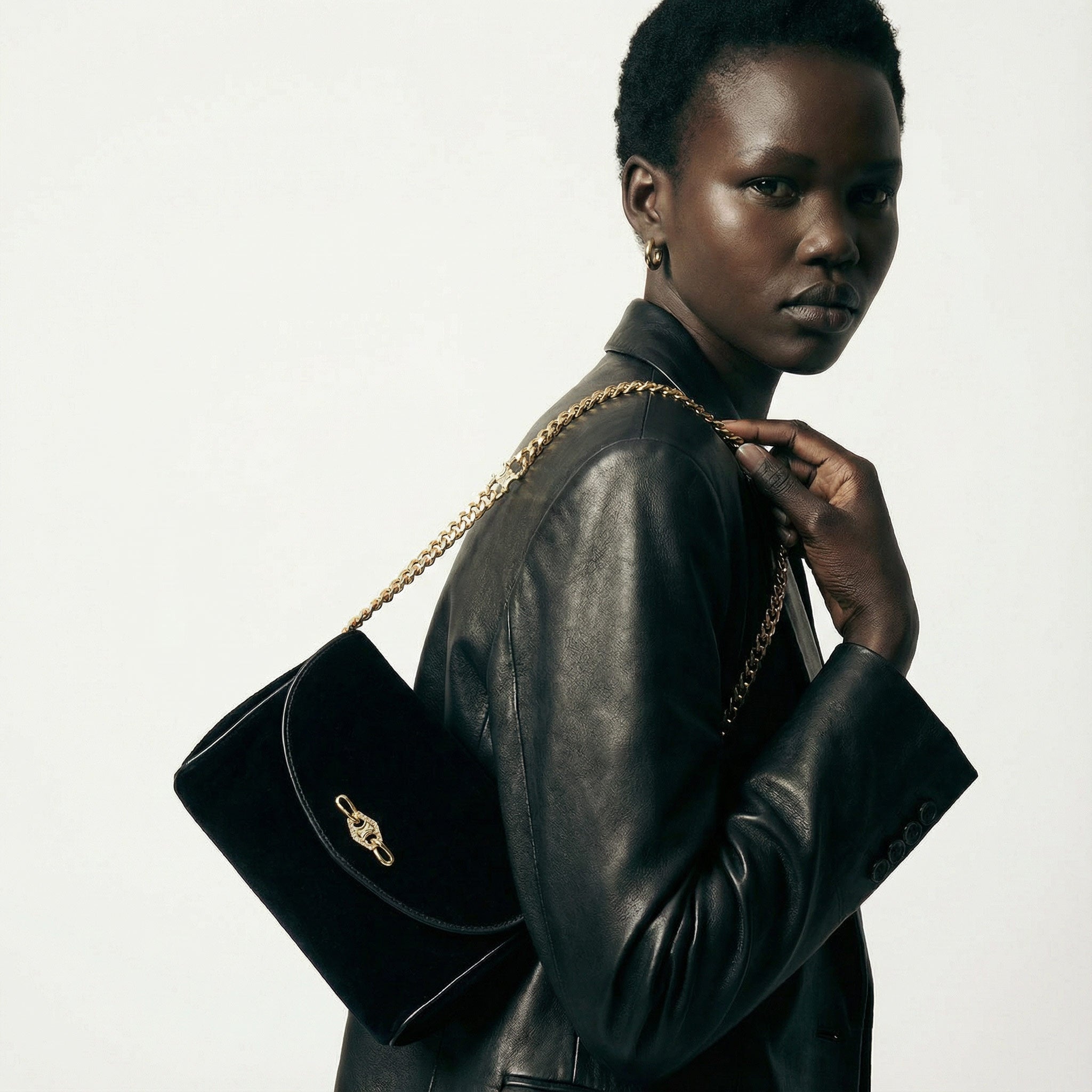 Bandoulière : Chaîne Triomphe dorée, porté épaule ou crossbody