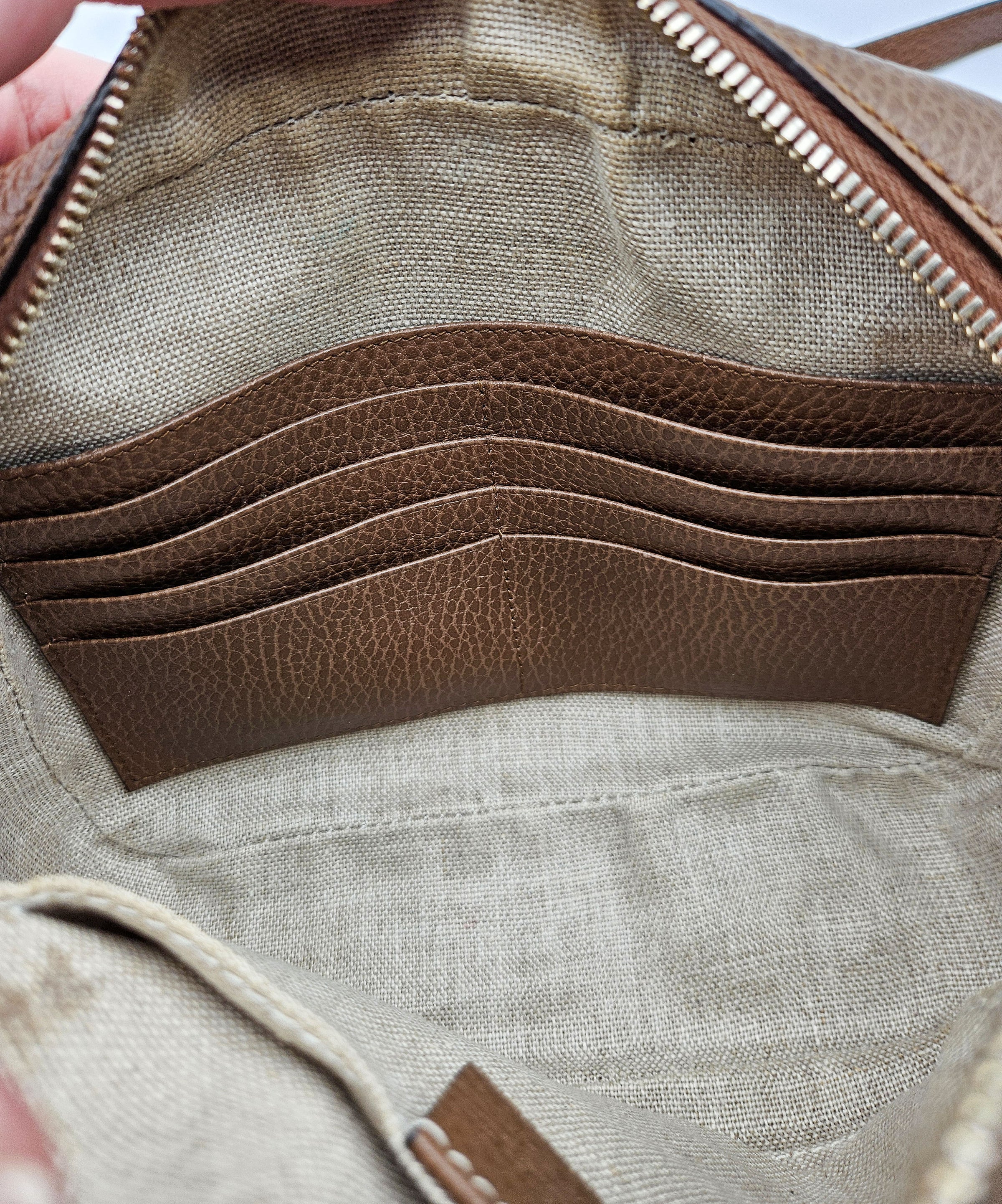 Compact mais fonctionnel, ce modèle est idéal pour transporter l’essentiel du quotidien. Il peut accueillir un long portefeuille, un iPhone Pro Max, des clés ou encore un rouge à lèvres. L’intérieur est doublé d’une toile coton greige élégante et dispose de fentes pour cartes en cuir permettant une organisation pratique.