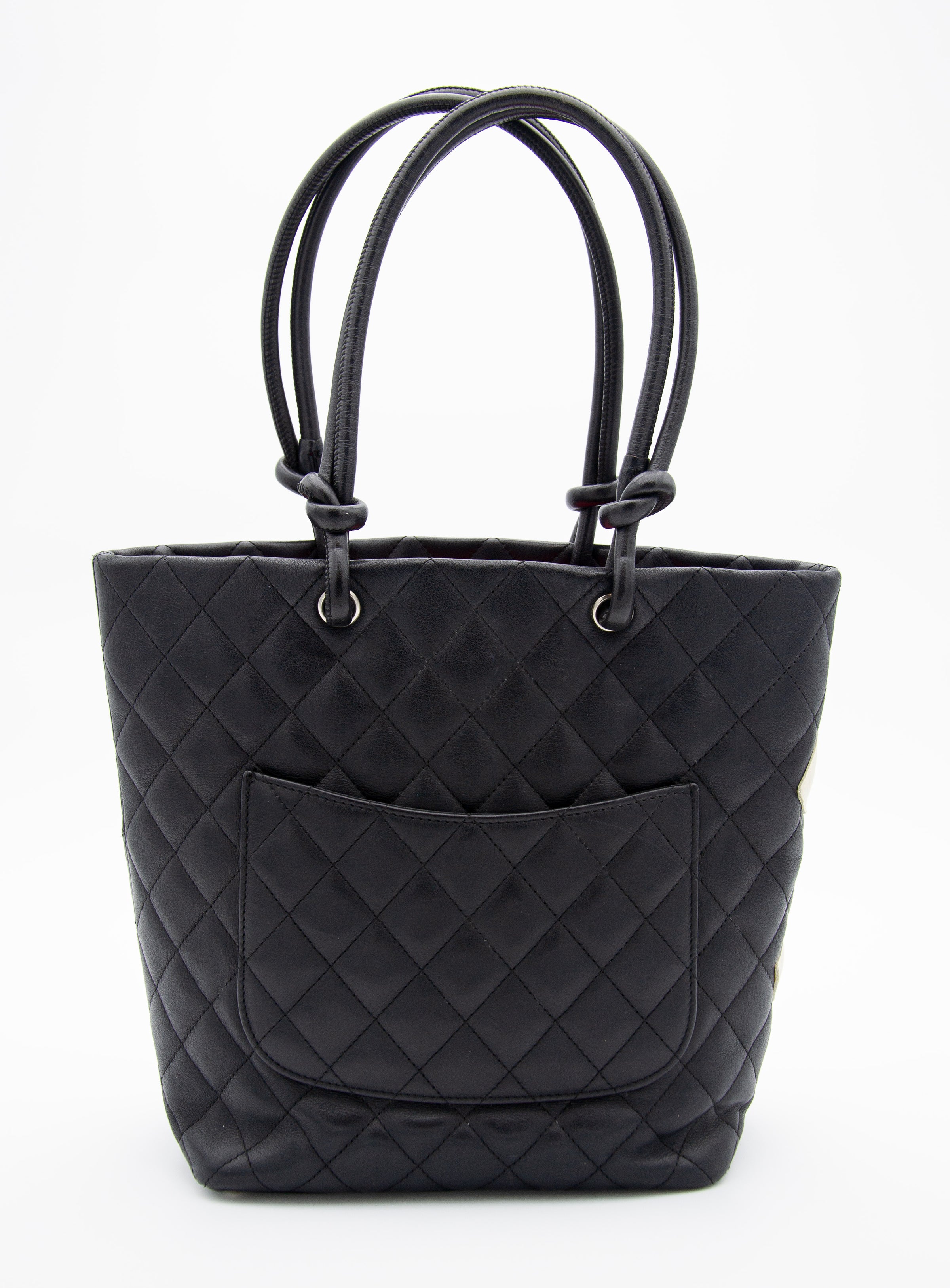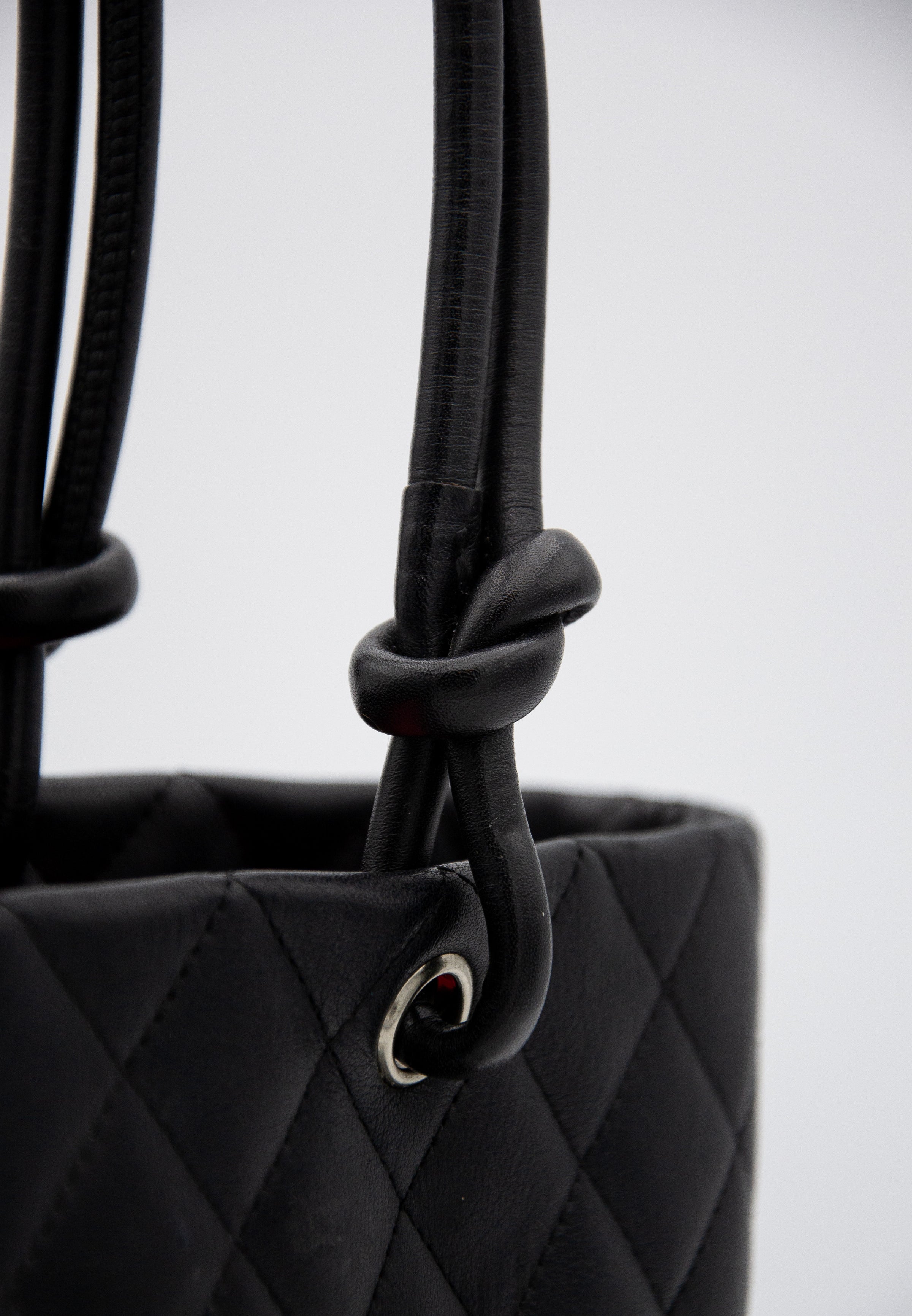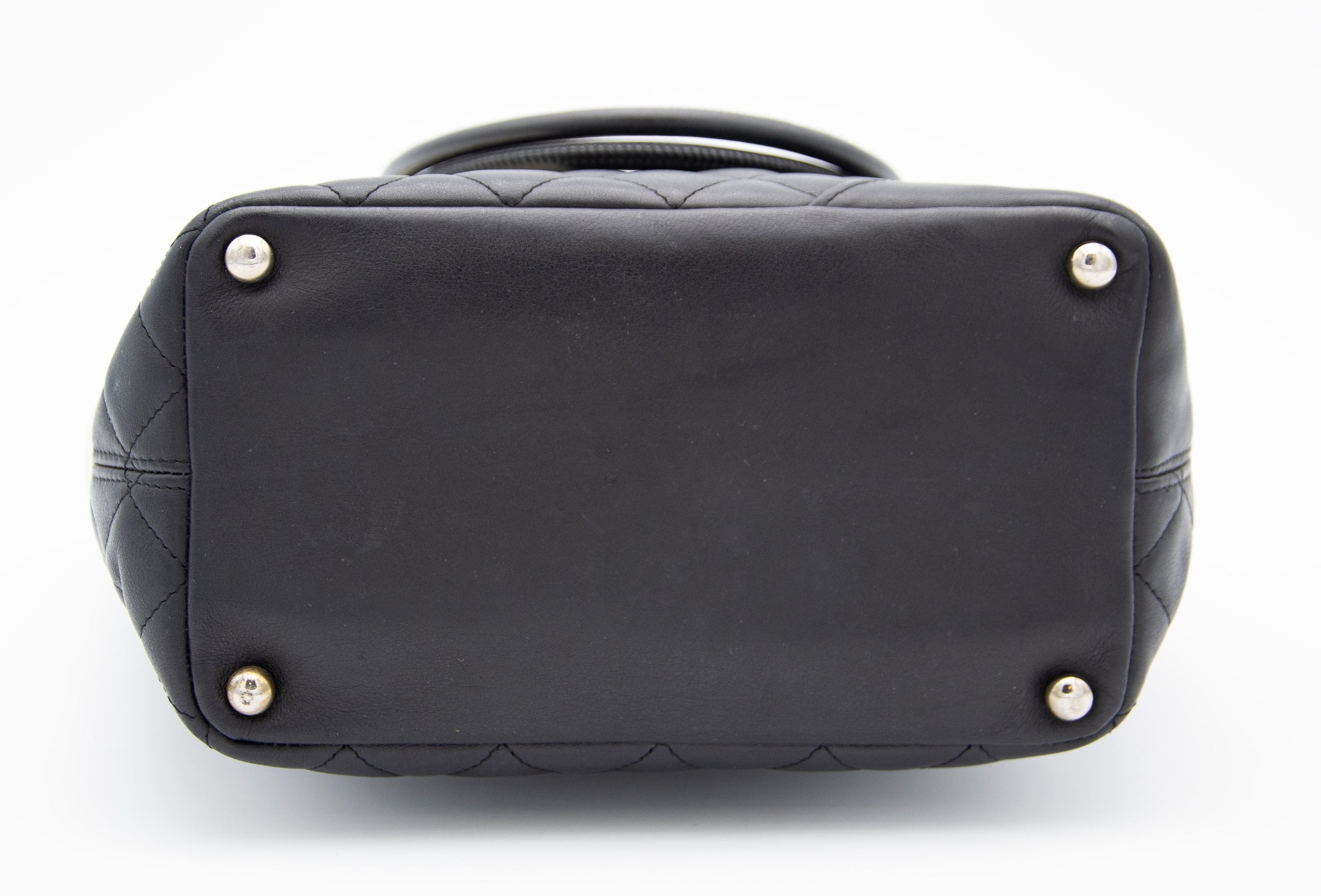 This iconic Chanel Cambon Tote is a luxurious vintage piece from the early 2000s, specifically dating back to 2003-2004. Crafted in supple black leather, the bag is in excellent condition, free from scratches, stains, or other defects, a remarkable state for its age. The well-maintained interior shows only a few light, barely noticeable stains.