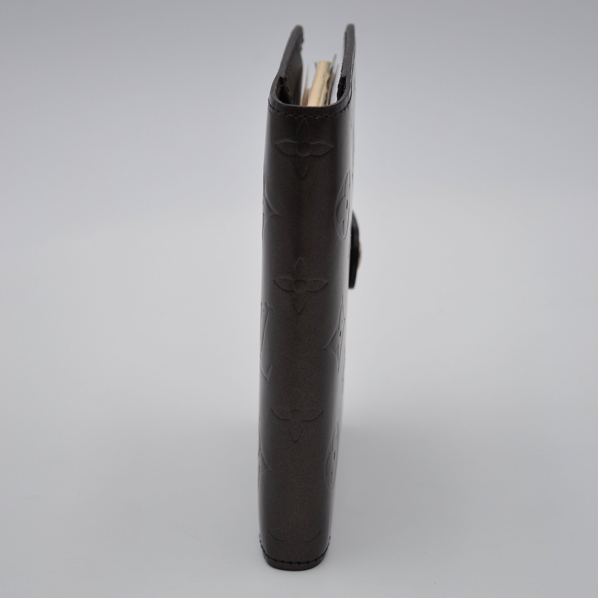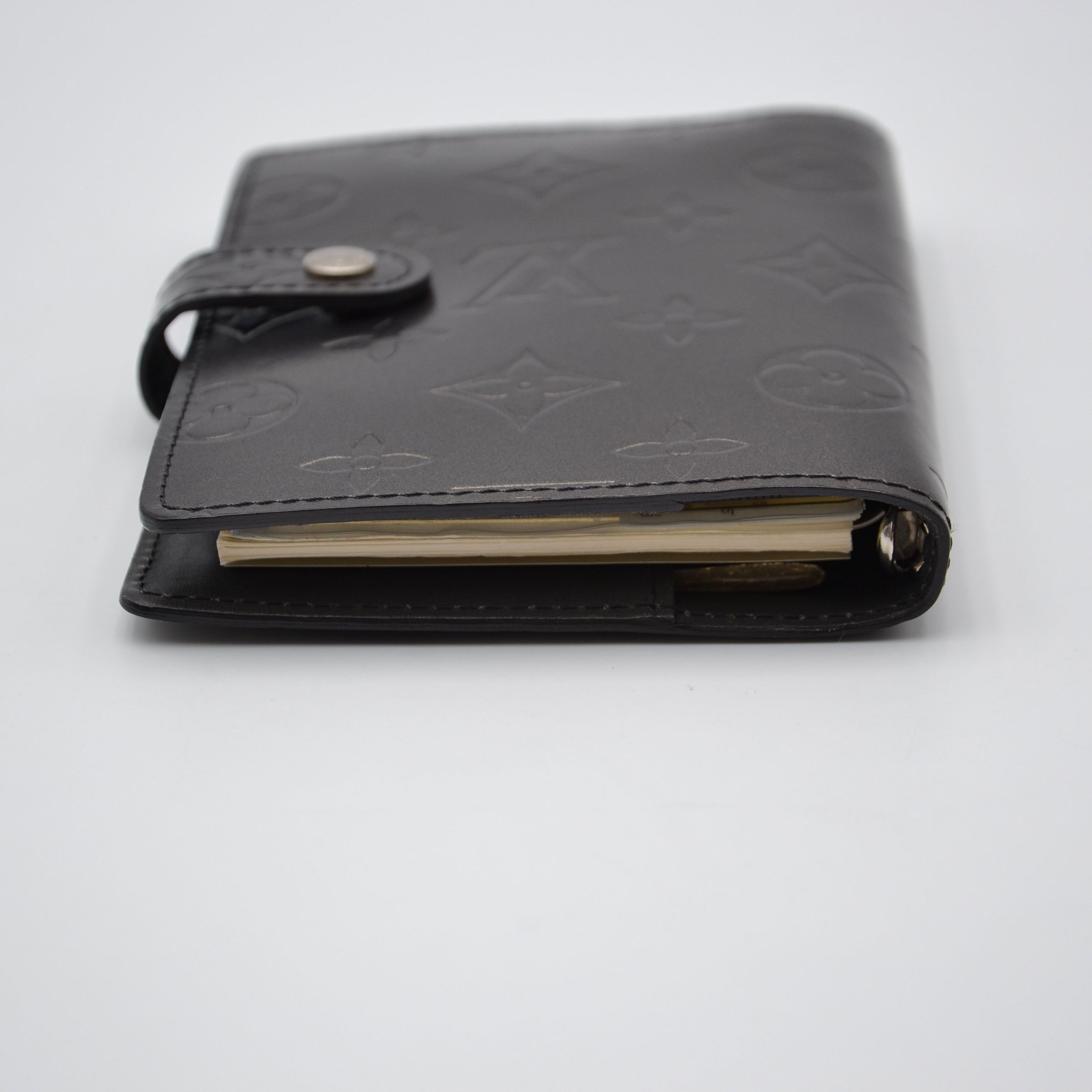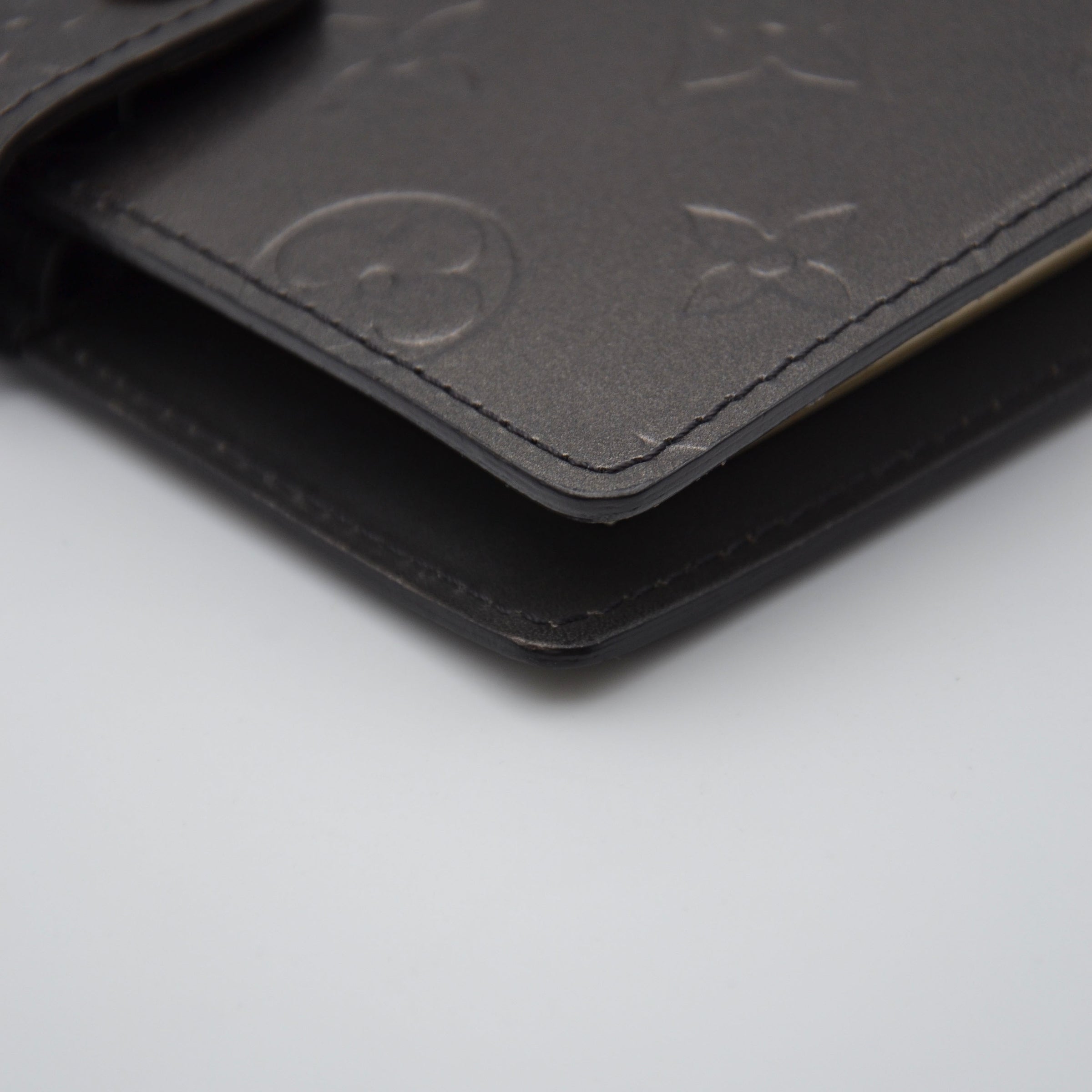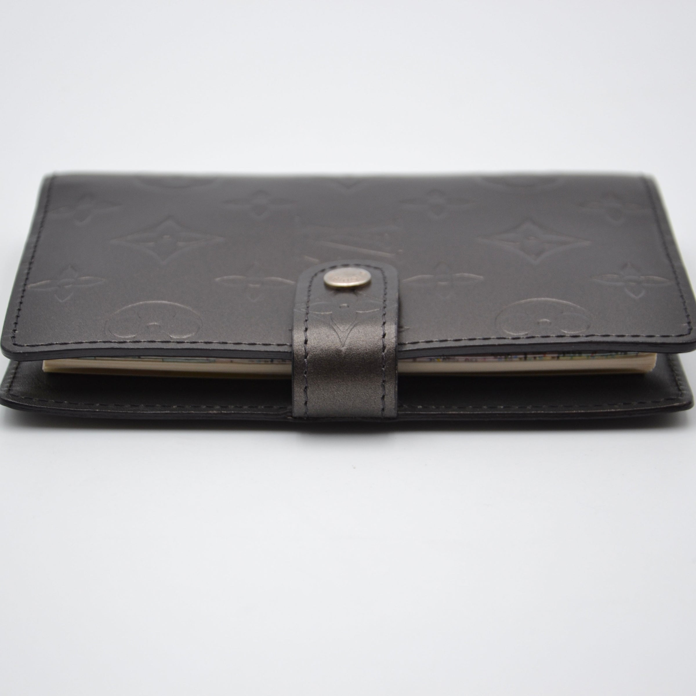 Cette couverture d'agenda PM Louis Vuitton en cuir Monogram Mat noir anthracite est une pièce rare et désirable — le monogramme LV embossé en relief mat sur fond noir confère à l'objet une élégance discrète et sophistiquée, loin des pièces toile plus communes.