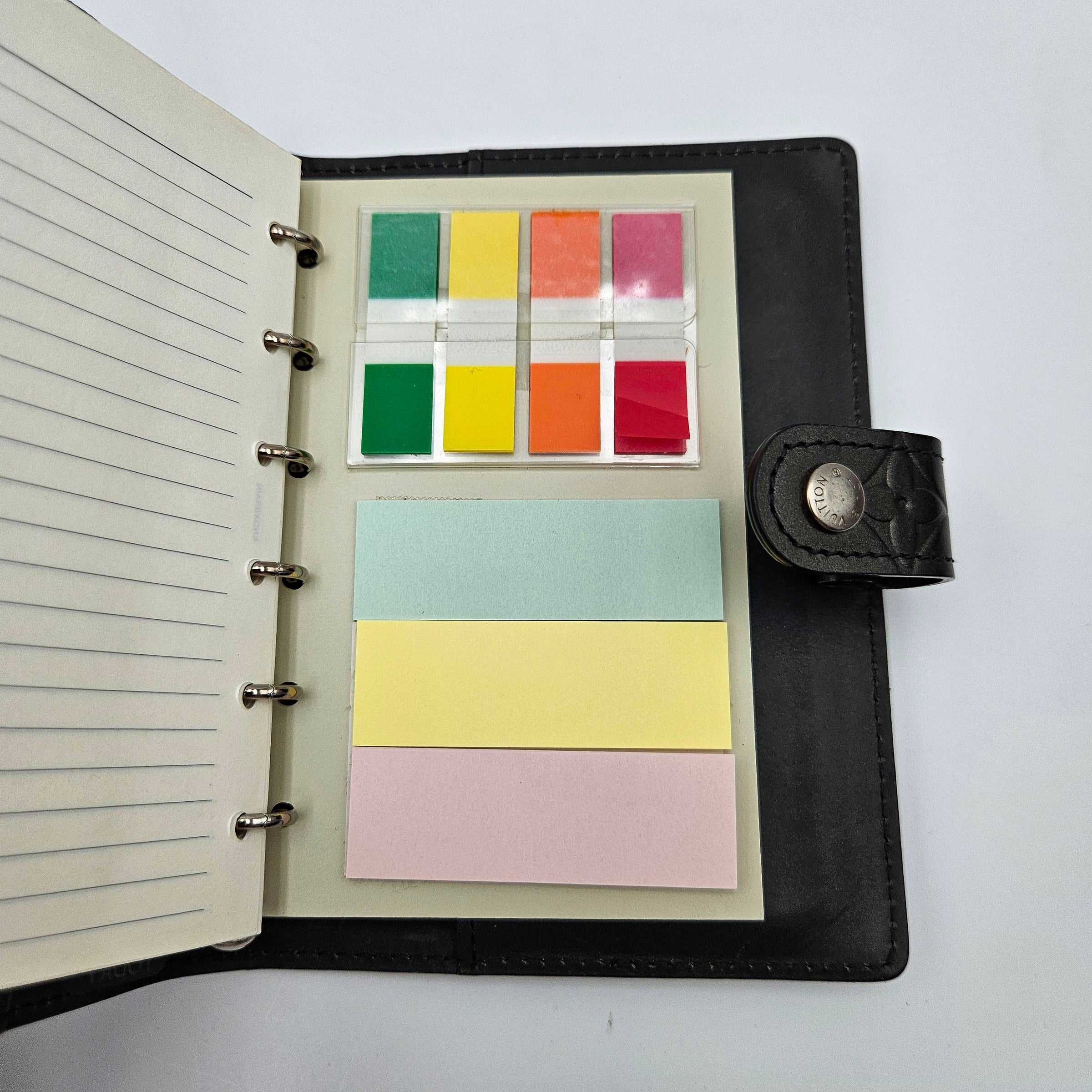 L'intérieur est équipé de plusieurs fentes pour cartes et livre avec son insert d'origine complet : carnet, stickers, plan, répertoire et post-it — une vraie trouvaille pour qui cherche un agenda de luxe clé en main.