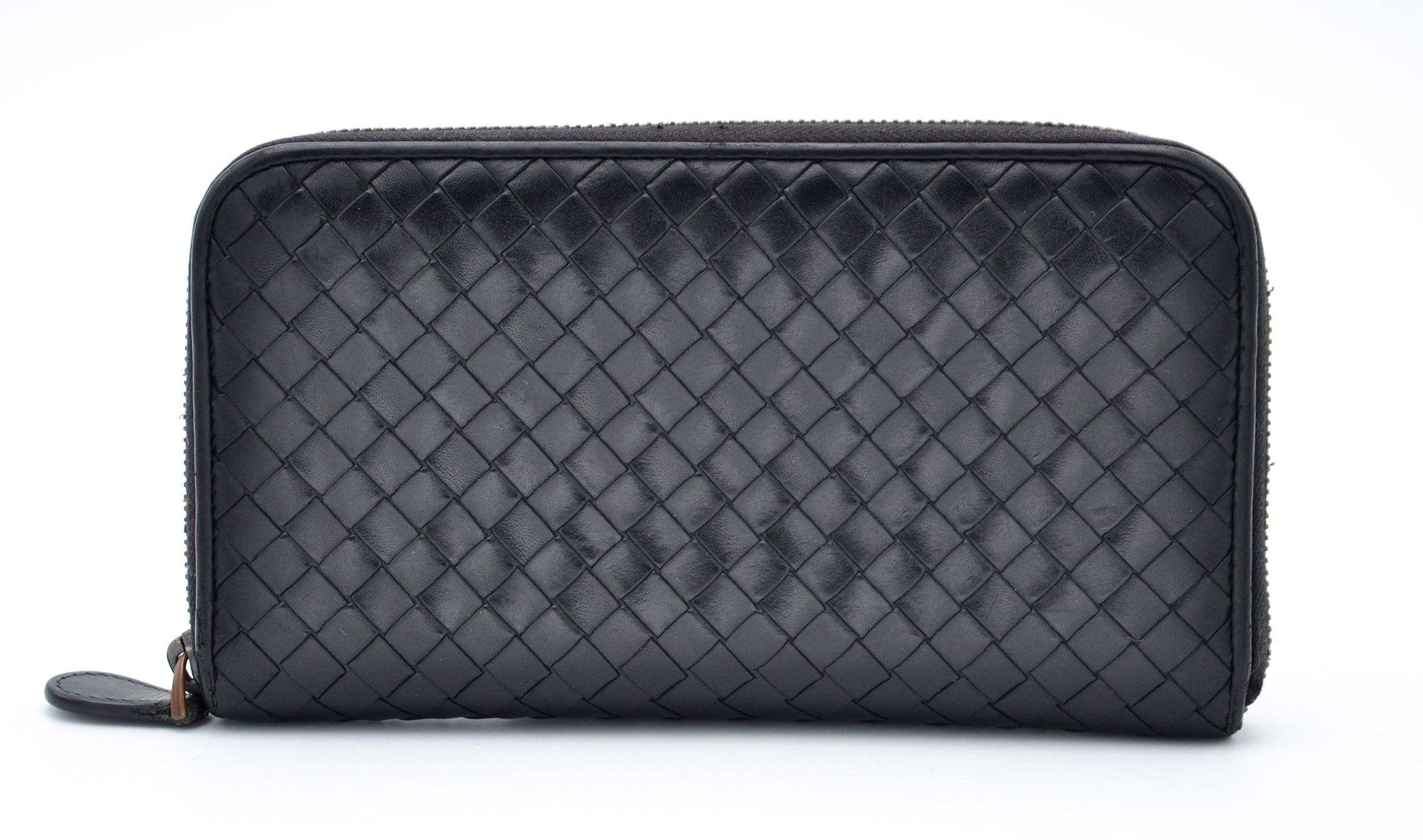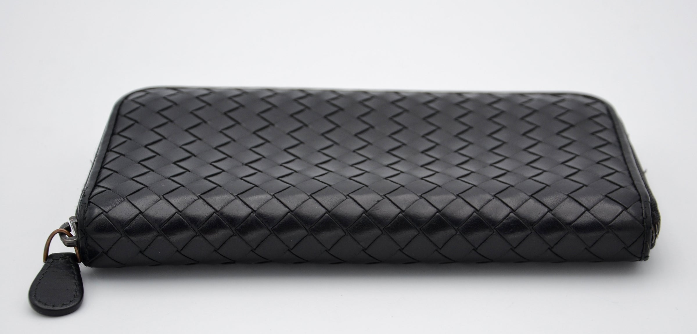 Ce portefeuille long Bottega Veneta en cuir noir Intrecciato est un accessoire à la fois élégant et fonctionnel. Le cuir tressé signature de la maison, associé à une bijouterie argentée et un curseur de zip en cuir, offre un design raffiné et distinctif. L’extérieur est en bon état avec de légers signes d’usure, tandis que l’intérieur reste propre avec des fentes pour cartes et une poche à monnaie zippée, garantissant un rangement pratique et sécurisé.