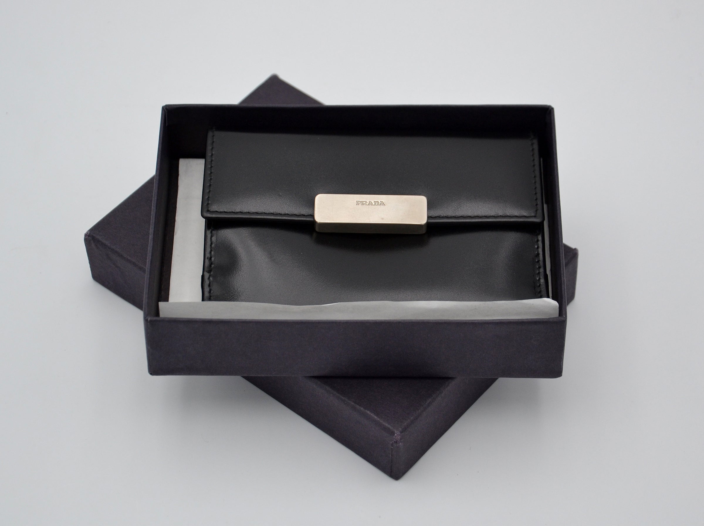 Ce portefeuille compact Prada en cuir noir incarne parfaitement l’esthétique minimaliste et sophistiquée de la maison italienne. Conçu dans un cuir de qualité, il se distingue par ses lignes épurées et sa bijouterie argentée ornée du logo Prada gravé sur le devant, apportant une touche discrète et élégante.