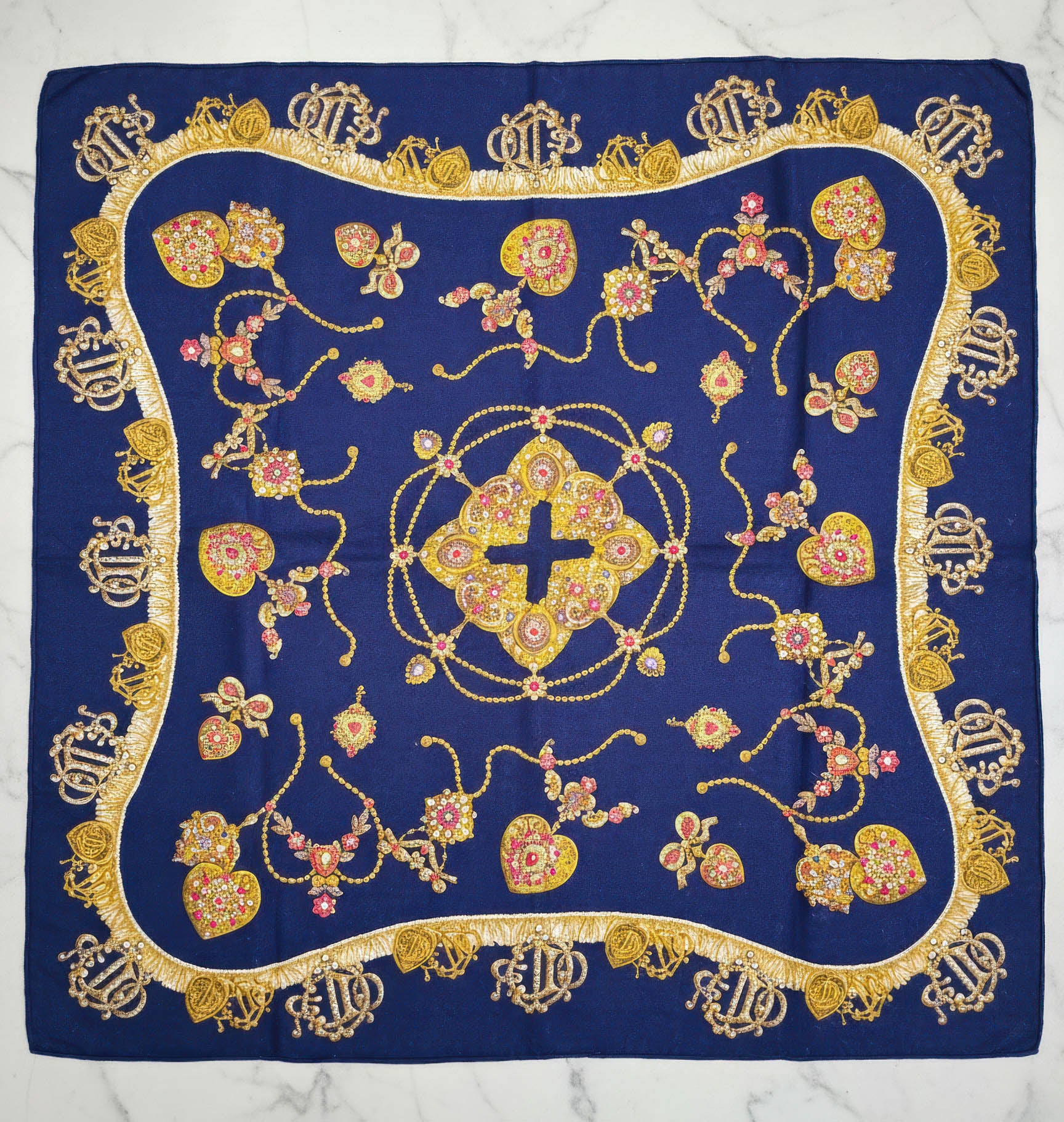 Ce foulard bandana Dior vintage est une pièce élégante et emblématique de l'esprit baroque et opulent de la maison. Son fond bleu nuit profond contraste magnifiquement avec un motif doré dans les tons jaunes , représentant des chaînes, des bijoux et les lettres « DIOR » subtilement intégrées au dessin — un hommage au luxe et au raffinement propres à la marque.