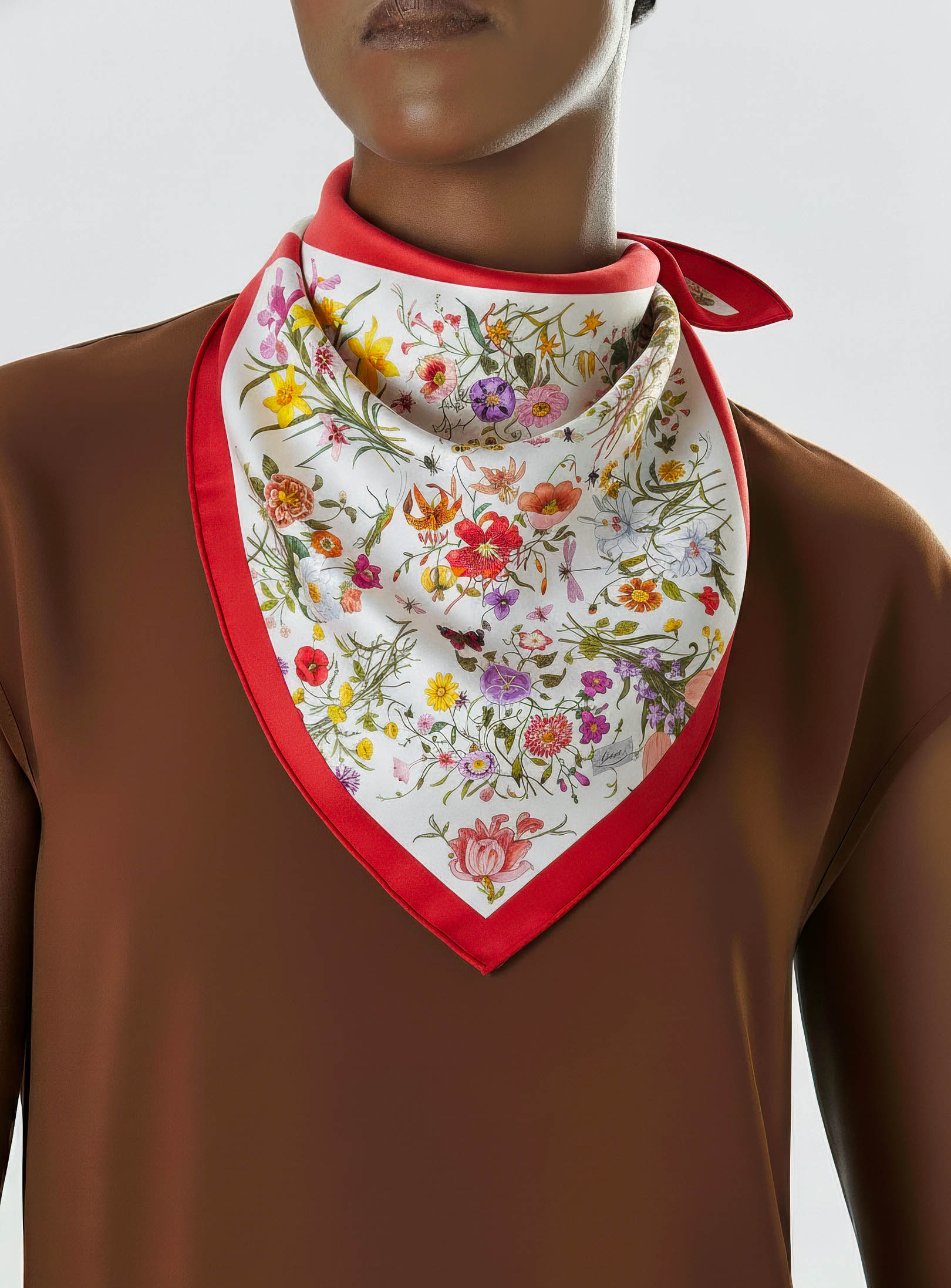 Ce foulard Gucci vintage Flora est un superbe exemple du raffinement floral emblématique de la maison italienne. Le motif délicat, inspiré d'aquarelles, représente des fleurs finement dessinées avec des couleurs chatoyantes qui apportent élégance et fraîcheur à toute tenue. Sa soie douce et fluide garantit un toucher luxueux et un drapé parfait, tandis que les bords point roulottés témoignent du soin apporté à sa confection.