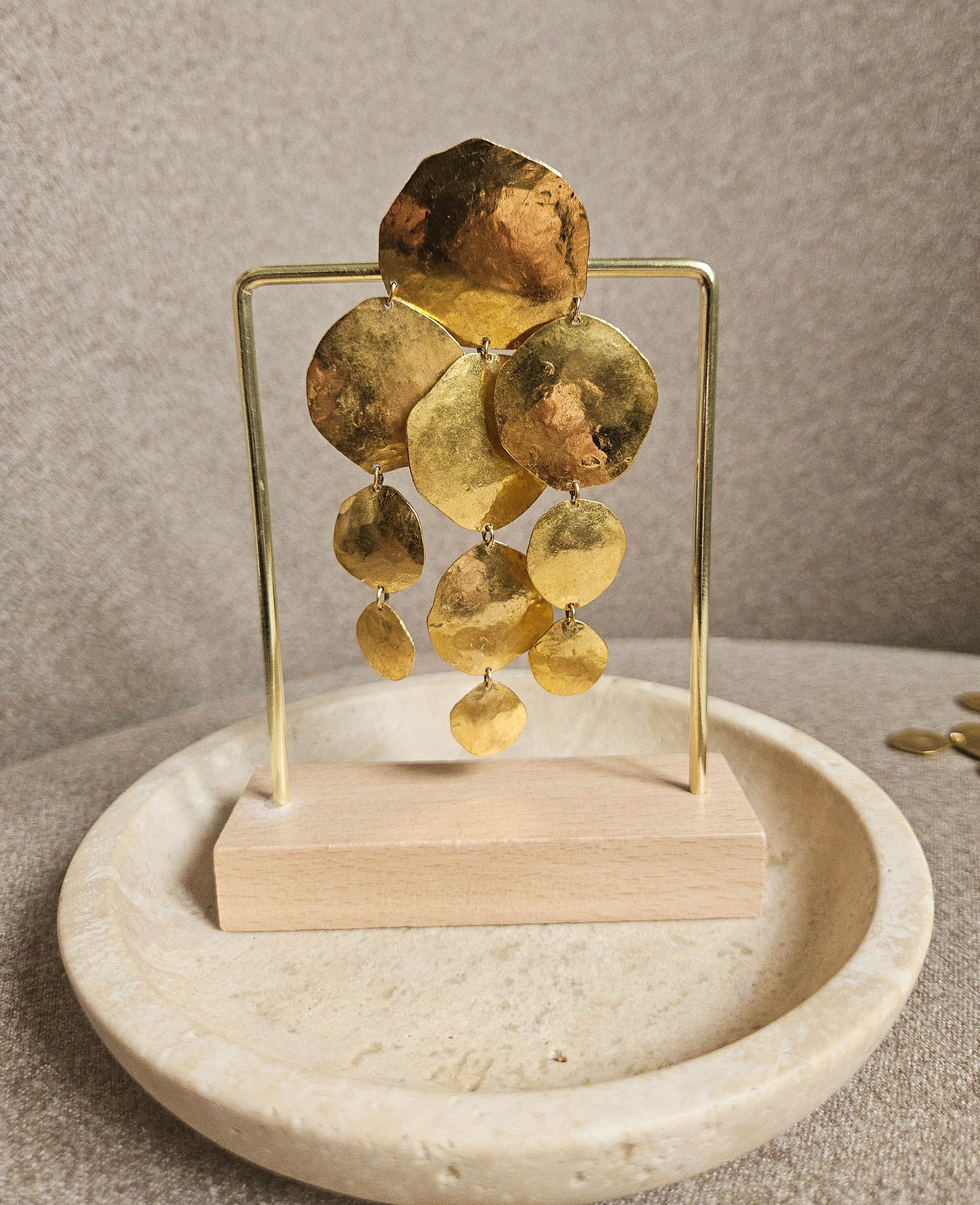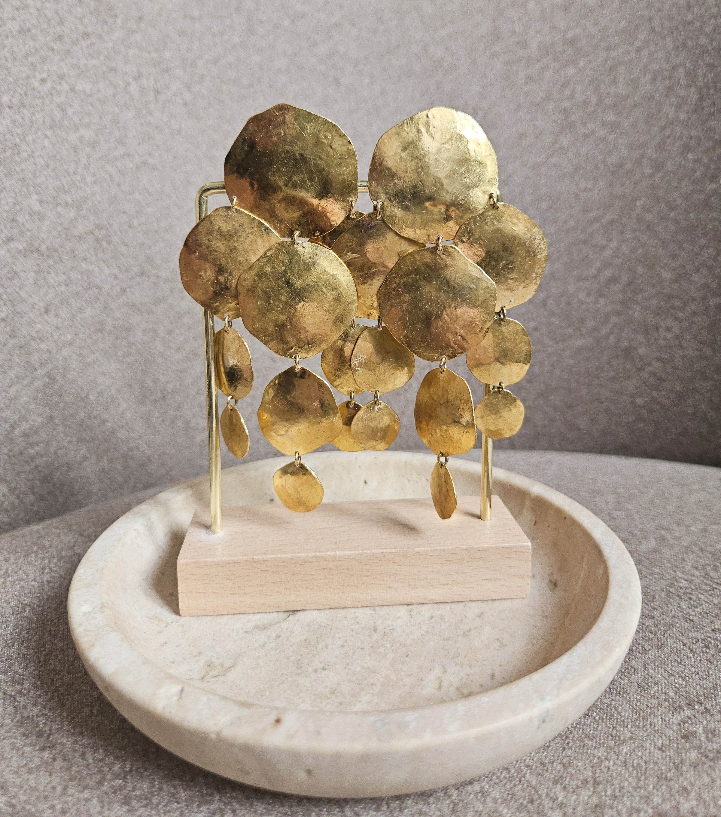 Ces maxi boucles d’oreilles Sonia Rykiel vintage incarnent à merveille l’audace et l’élégance exubérante de la créatrice parisienne. Réalisées en plaqué or avec une somptueuse finition martelée, elles adoptent une forme chandelier composée de plusieurs disques mobiles, reflétant la lumière à chaque mouvement.