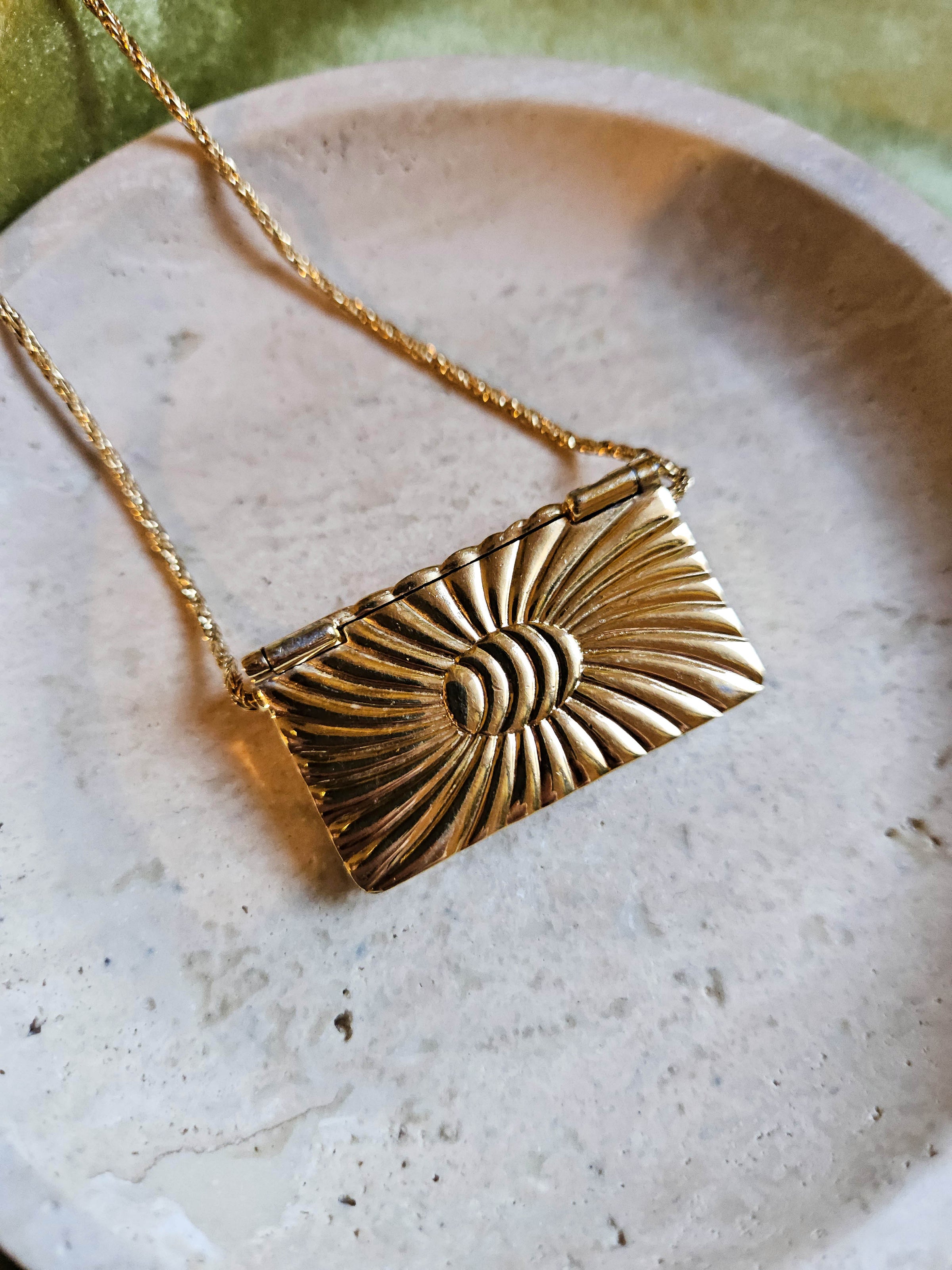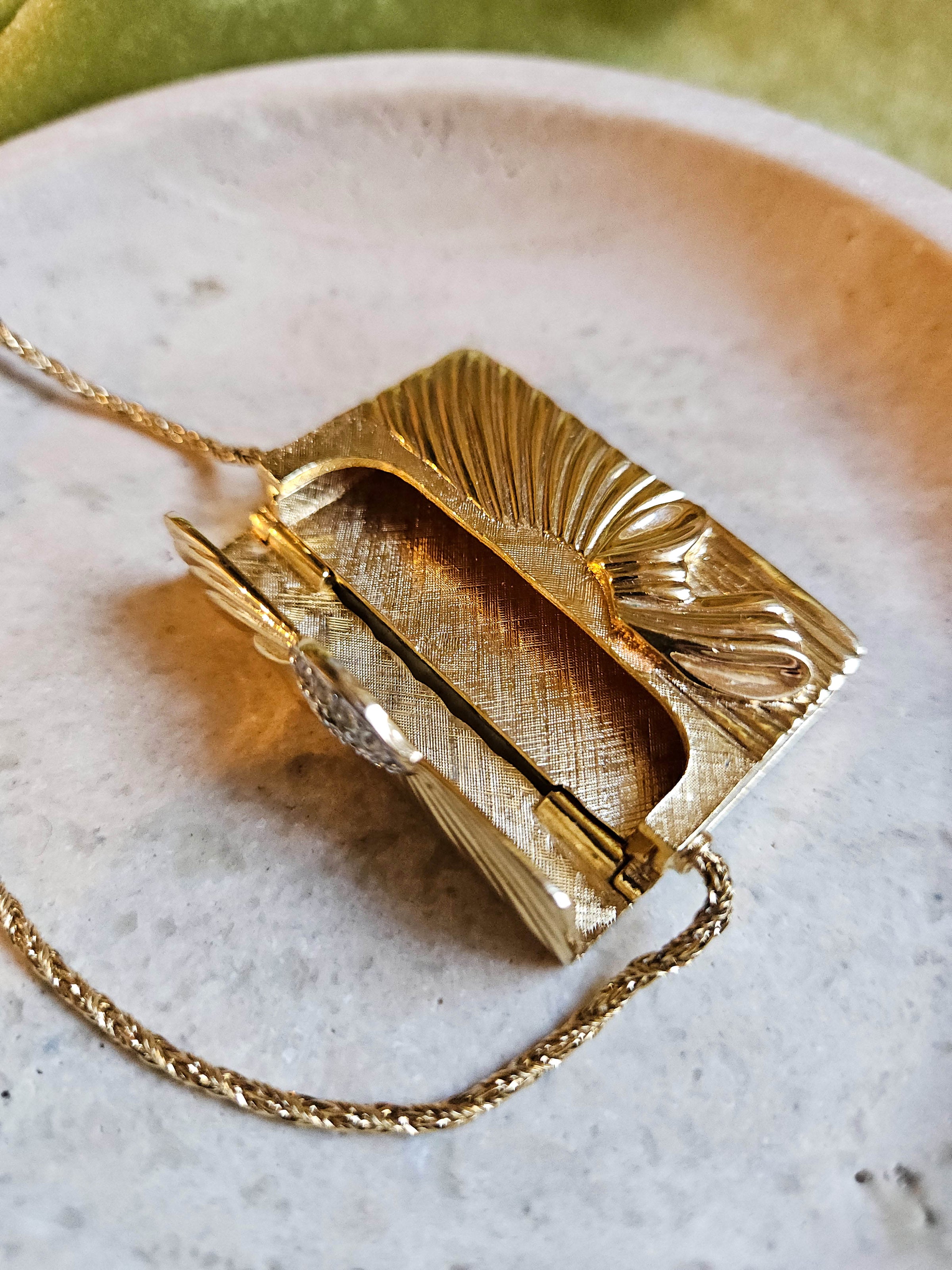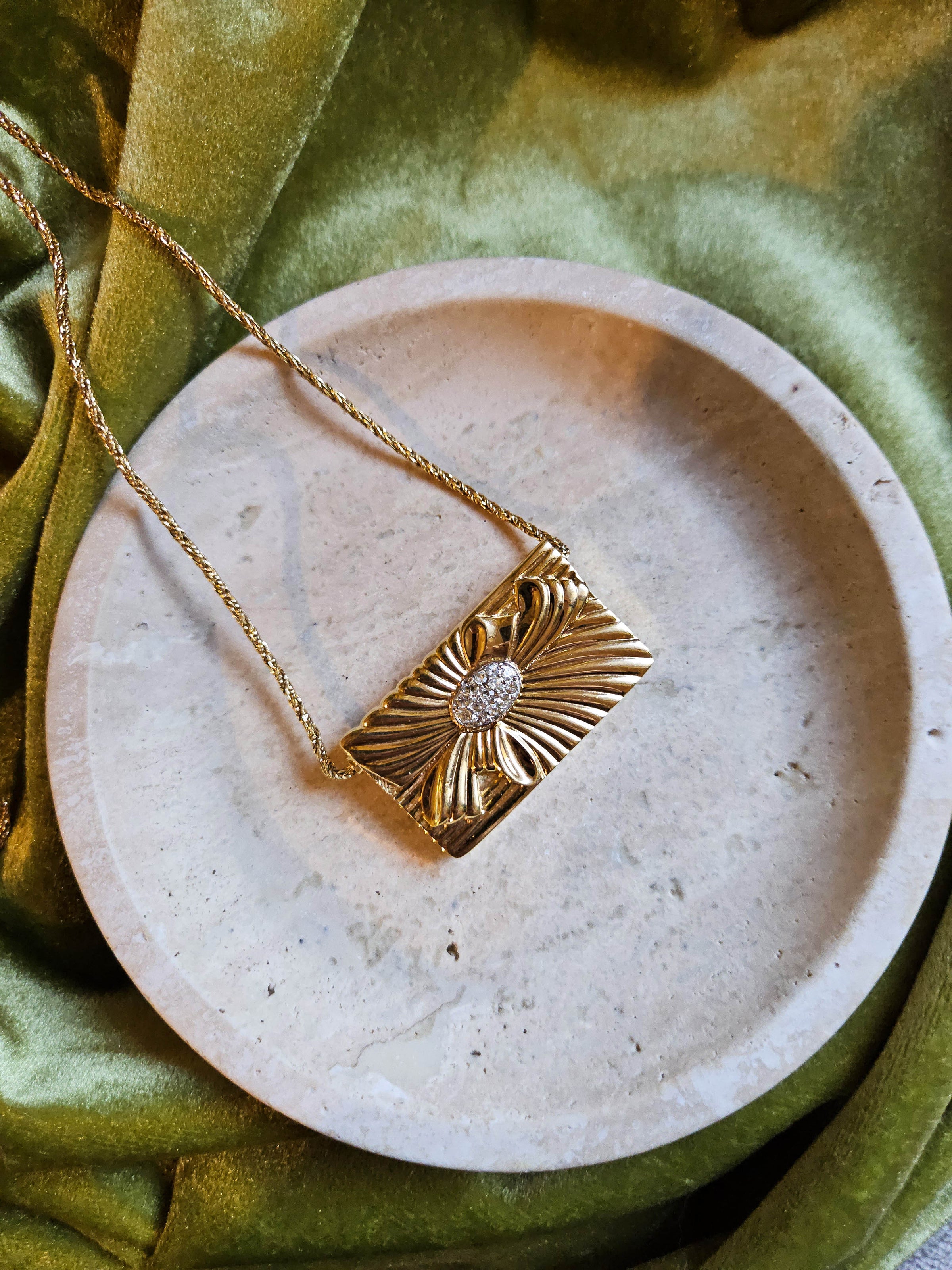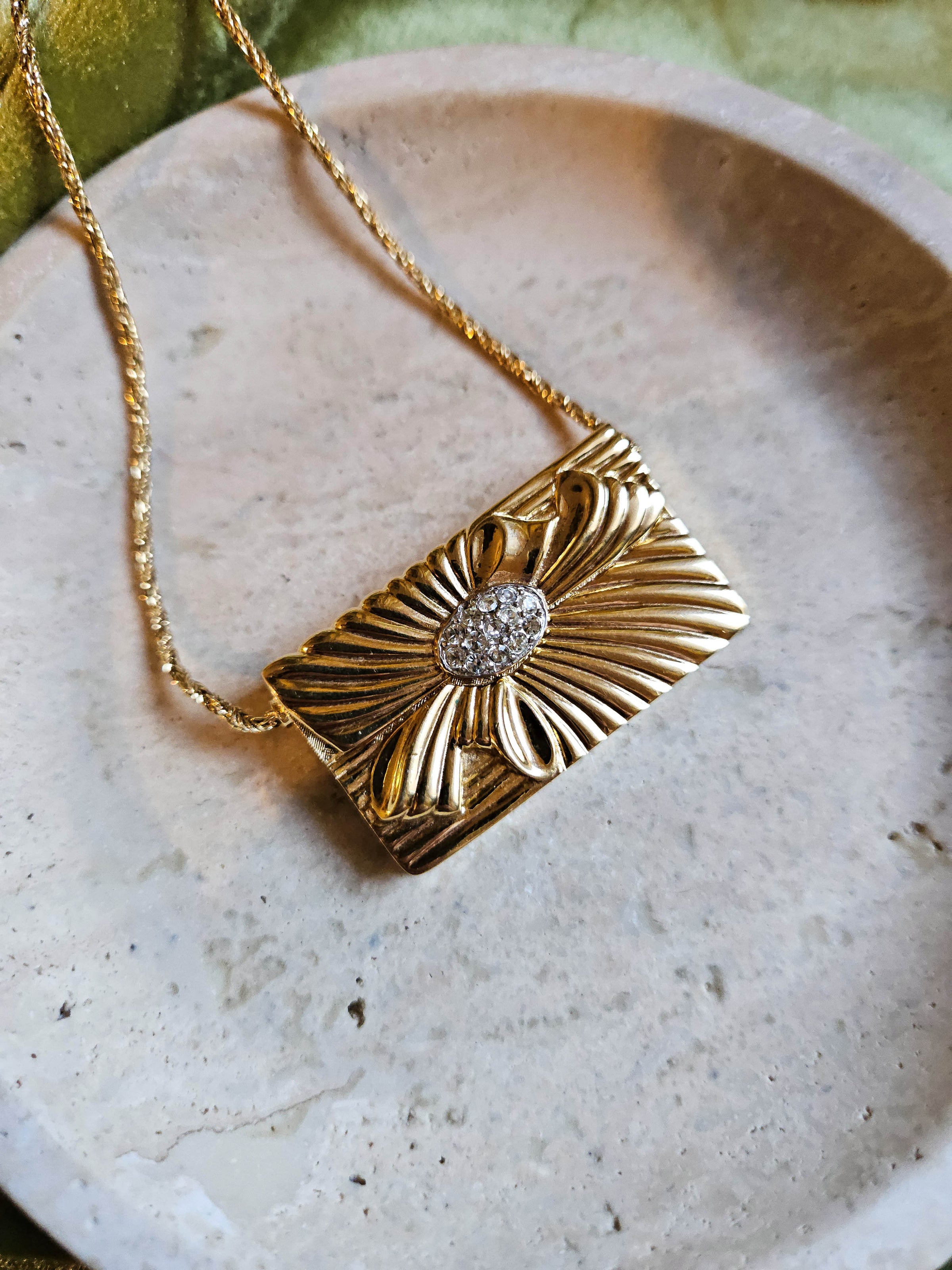 Ce collier Nina Ricci vintage reflète à merveille l’élégance et le raffinement qui caractérisent la maison parisienne. Réalisé en métal doré, il se distingue par son pendentif rectangulaire finement travaillé, orné d’un motif floral rayonnant et d’un cristal clair au centre. Ce bijou délicat conjugue romantisme et sophistication, dans l’esprit des créations intemporelles de Nina Ricci.