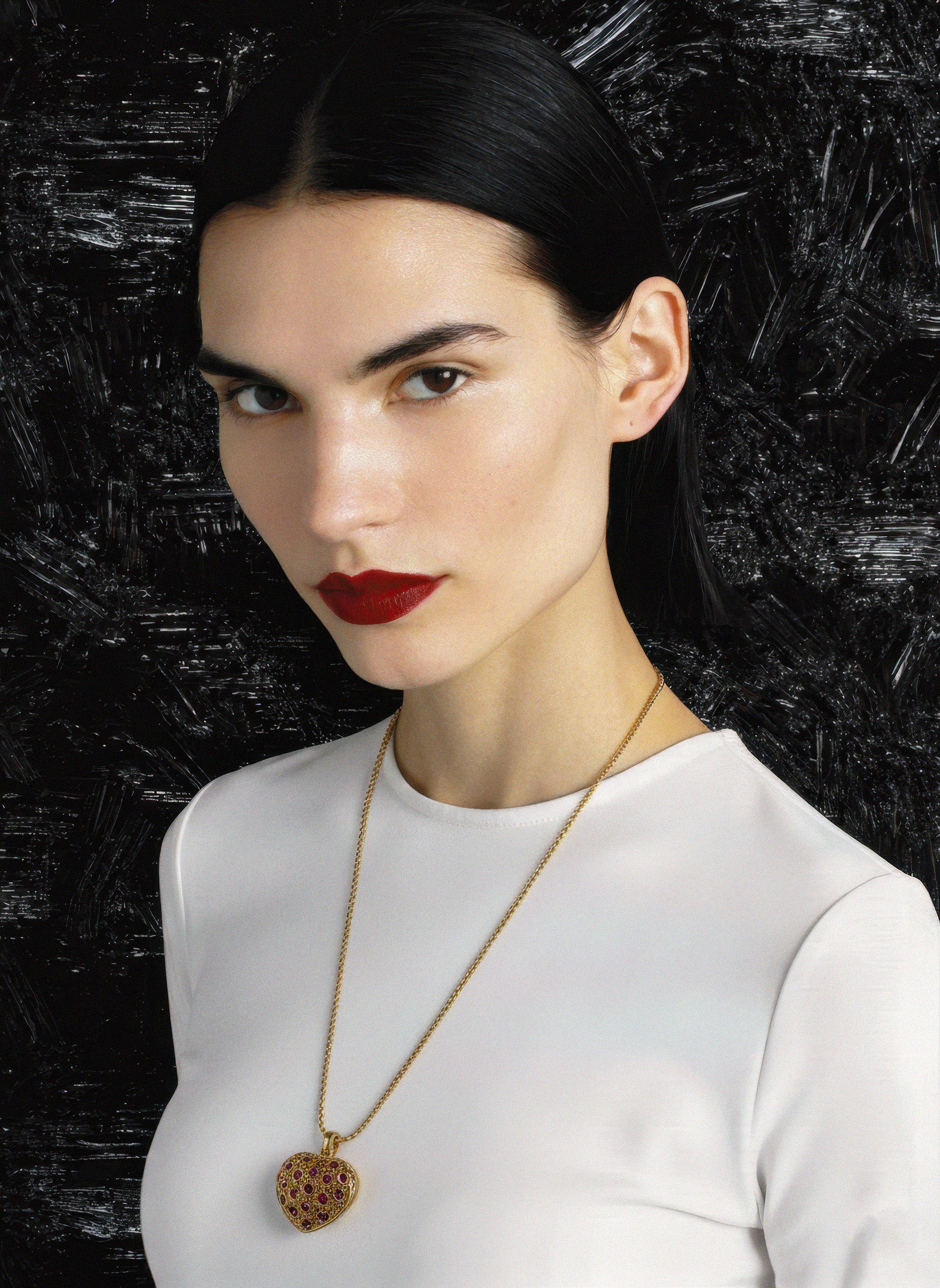 Ce collier sautoir Dior vintage en forme de cœur est une pièce d’exception, symbole du romantisme et du raffinement caractéristiques de la maison Dior. Confectionné en métal plaqué or, il est orné de multiples strass couleur rubis, finement sertis sur un cœur ajouré à la texture délicatement travaillée. L’ensemble reflète un éclat chaud et luxueux, typique des créations Dior de l’époque.