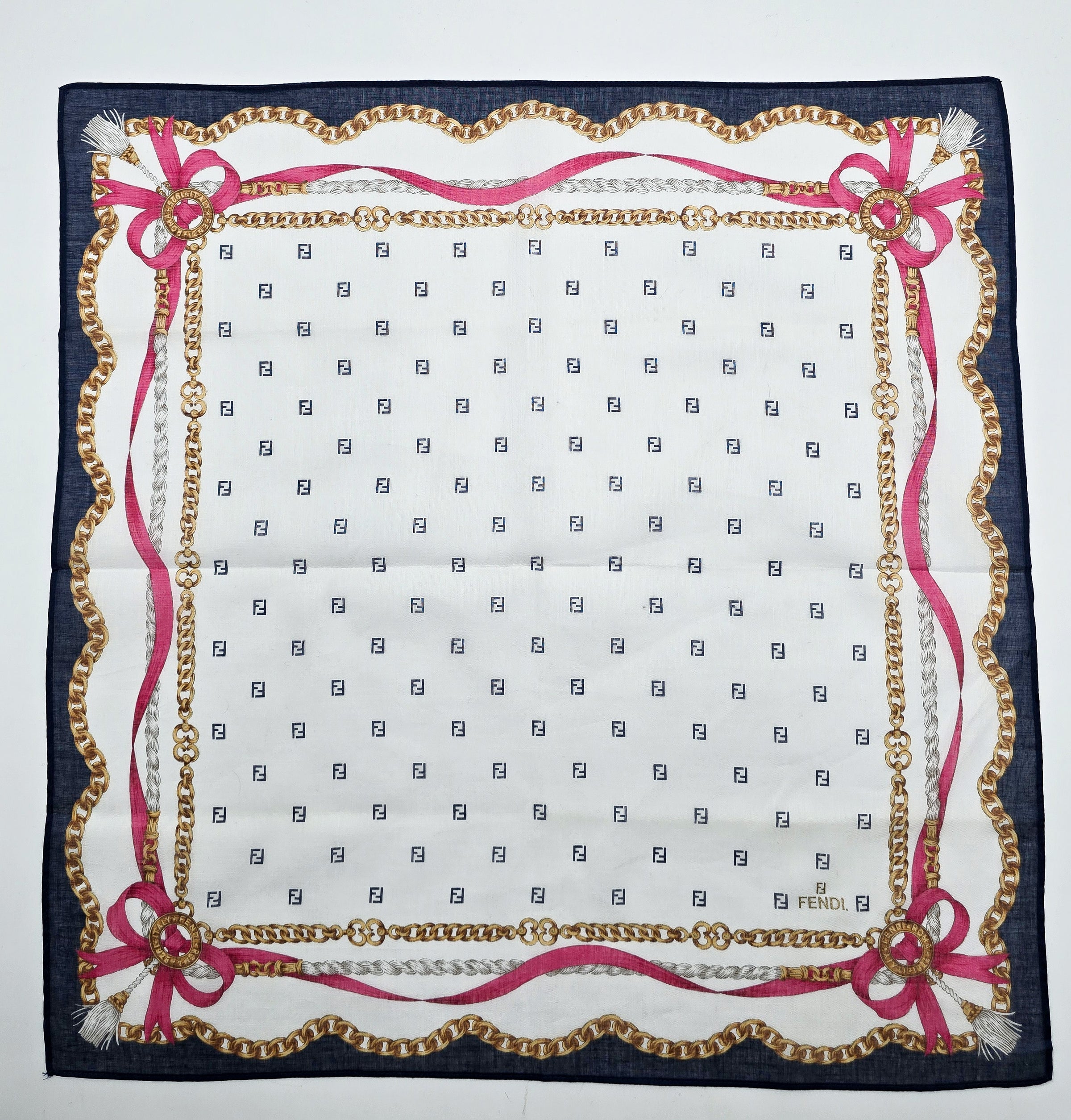 Ce foulard bandana vintage Fendi en coton se distingue par son fond blanc lumineux orné du monogramme FF discret, signature iconique de la maison. Le design est sublimé par un jeu élégant de chaînes dorées entrelacées, de cordages et de rubans roses qui apportent une touche féminine et sophistiquée. La bordure bleu marine structure l’ensemble et renforce son contraste raffiné.