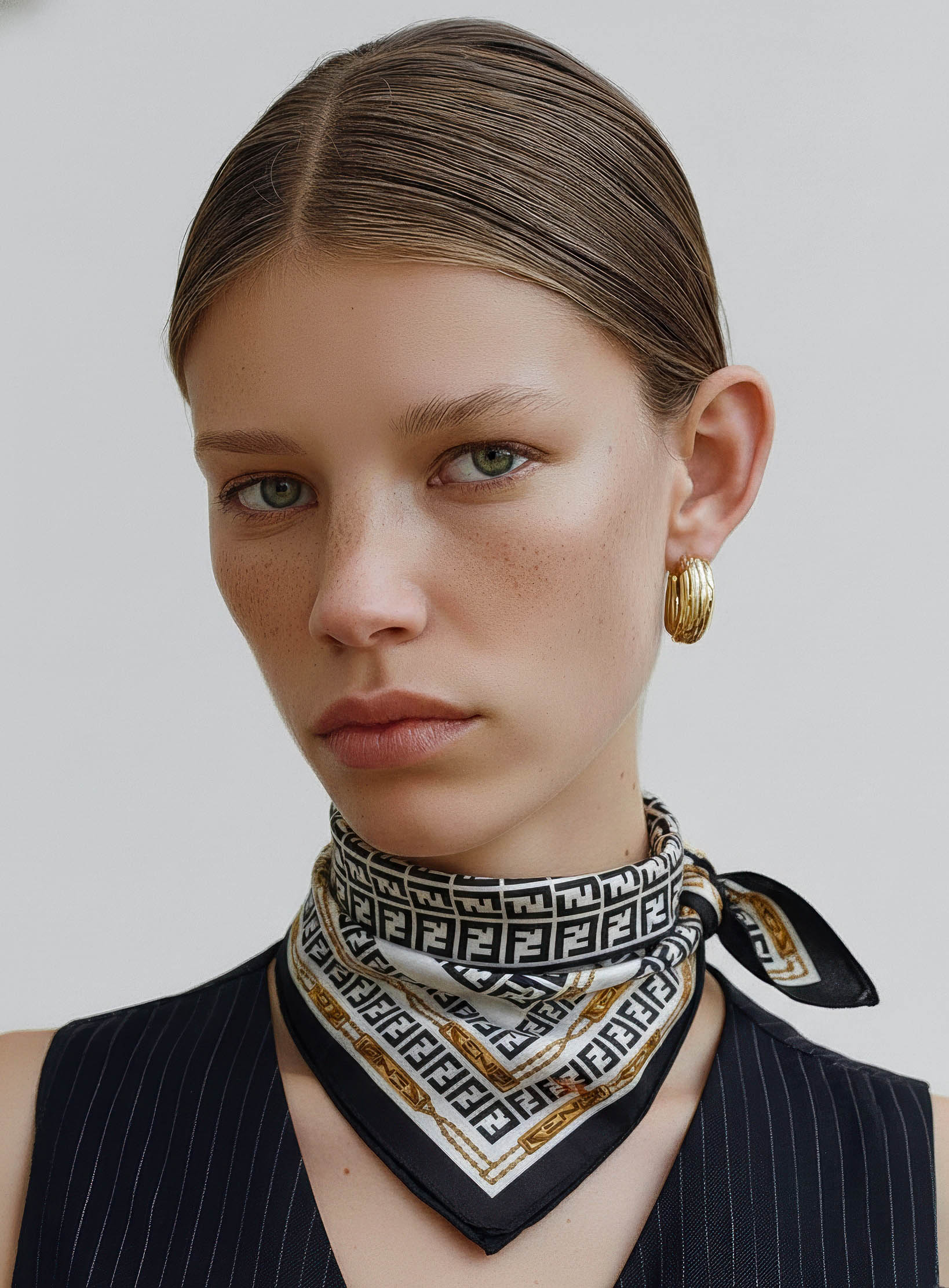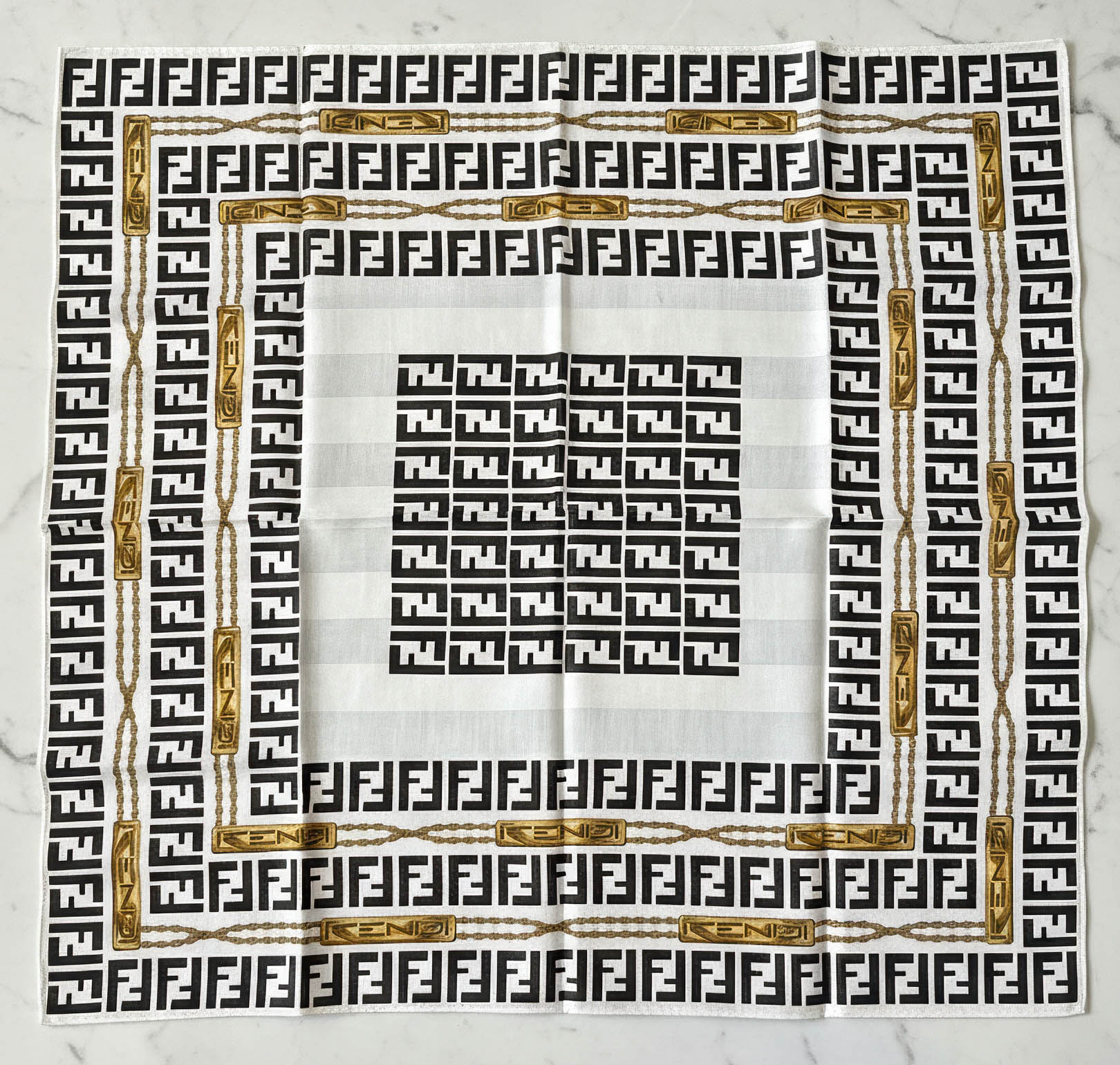 Ce foulard bandana Fendi vintage incarne parfaitement l’élégance graphique et le style emblématique de la maison italienne. Réalisé en coton doux et de haute qualité, il présente un motif géométrique FF noir associé à de chaînes dorées sur un fond blanc lumineux, créant un contraste chic et raffiné typique du design Fendi.