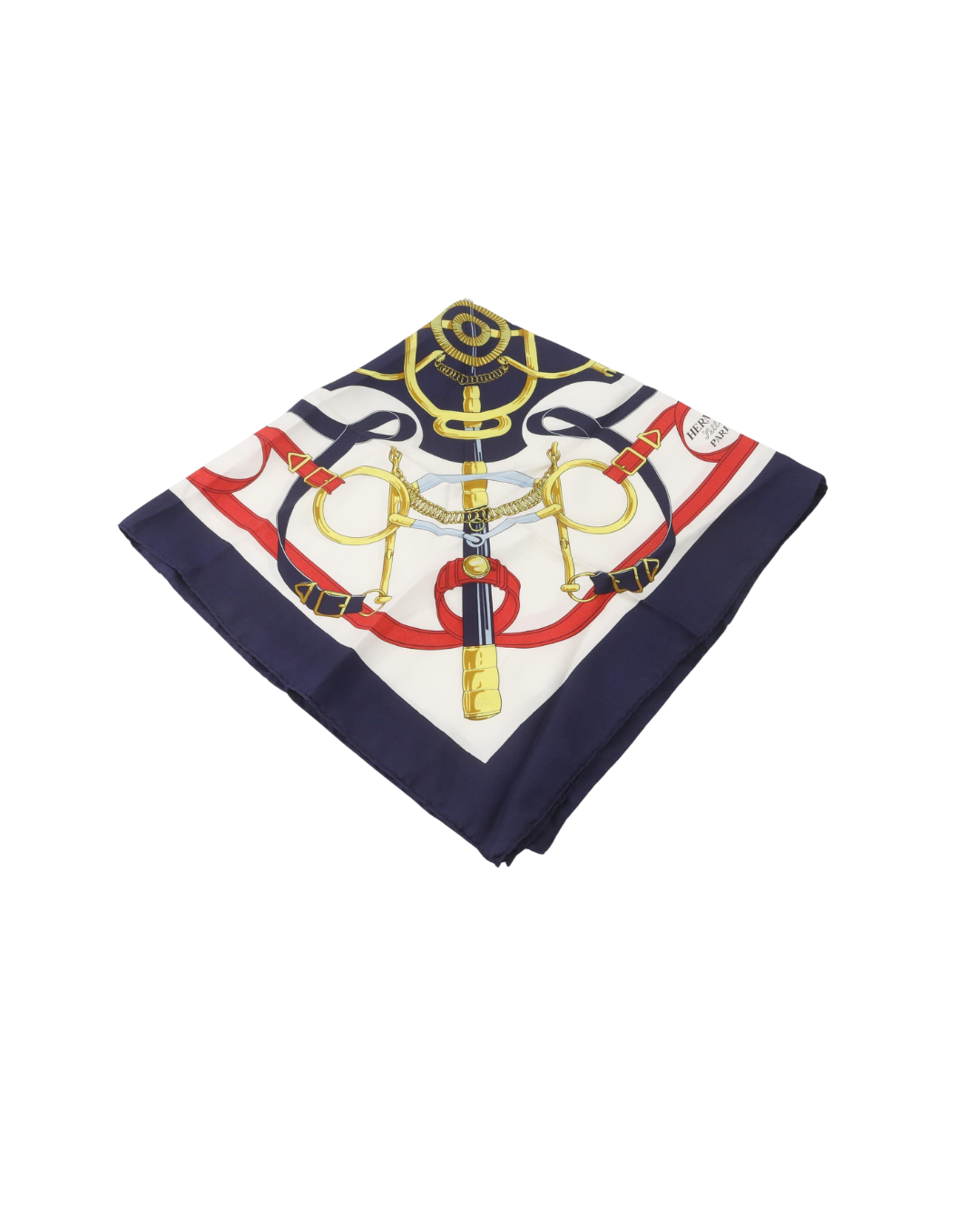This is a timeless Hermès Carré 90 silk scarf featuring the iconic design “Éperon d’Or” by renowned Hermès artist Henri d’Origny, originally released in 1974. Inspired by the equestrian world, the scarf showcases bridles, bits, and harnesses arranged in a symmetrical, almost regal layout — a tribute to the elegance of classical horsemanship.