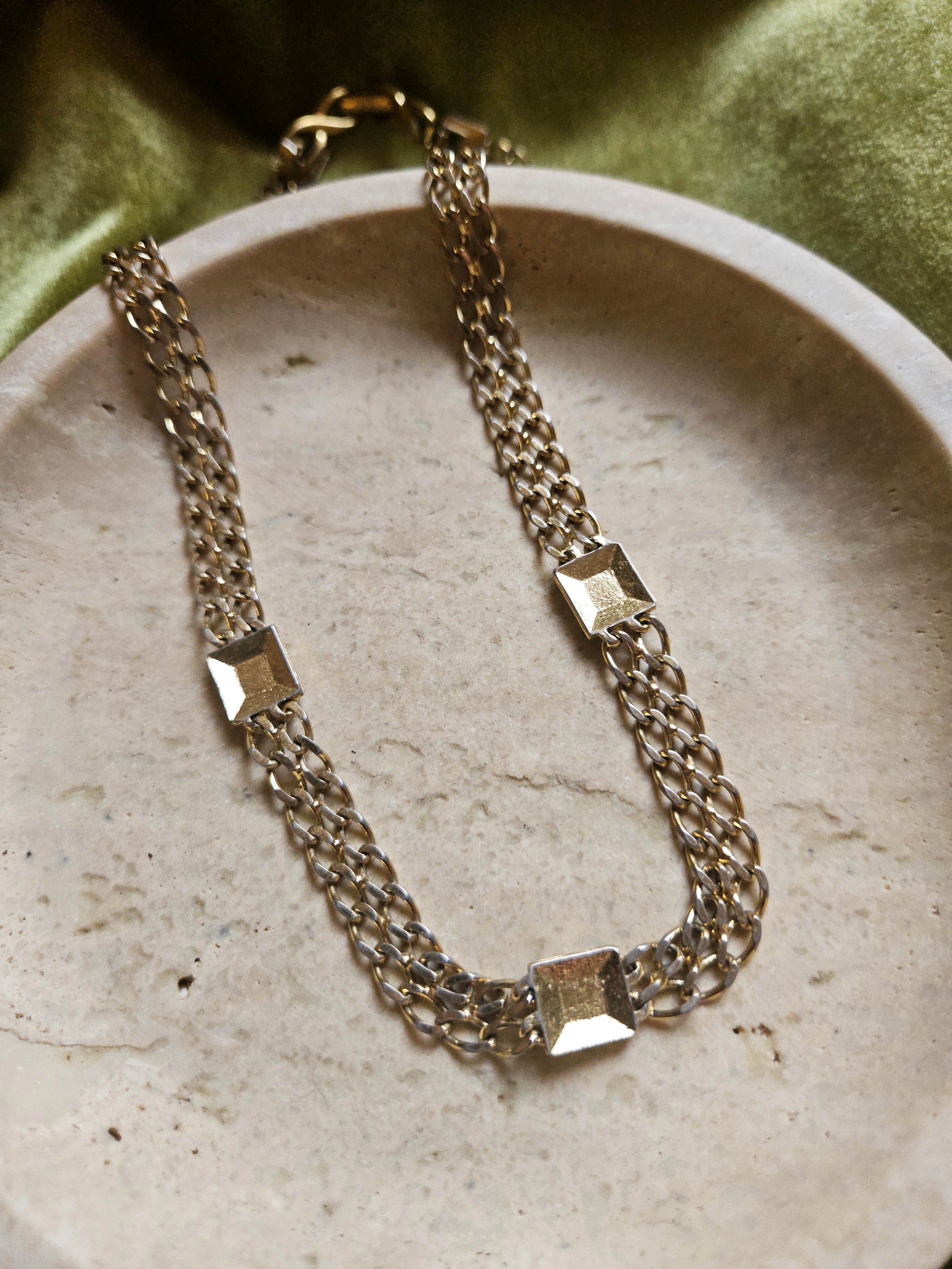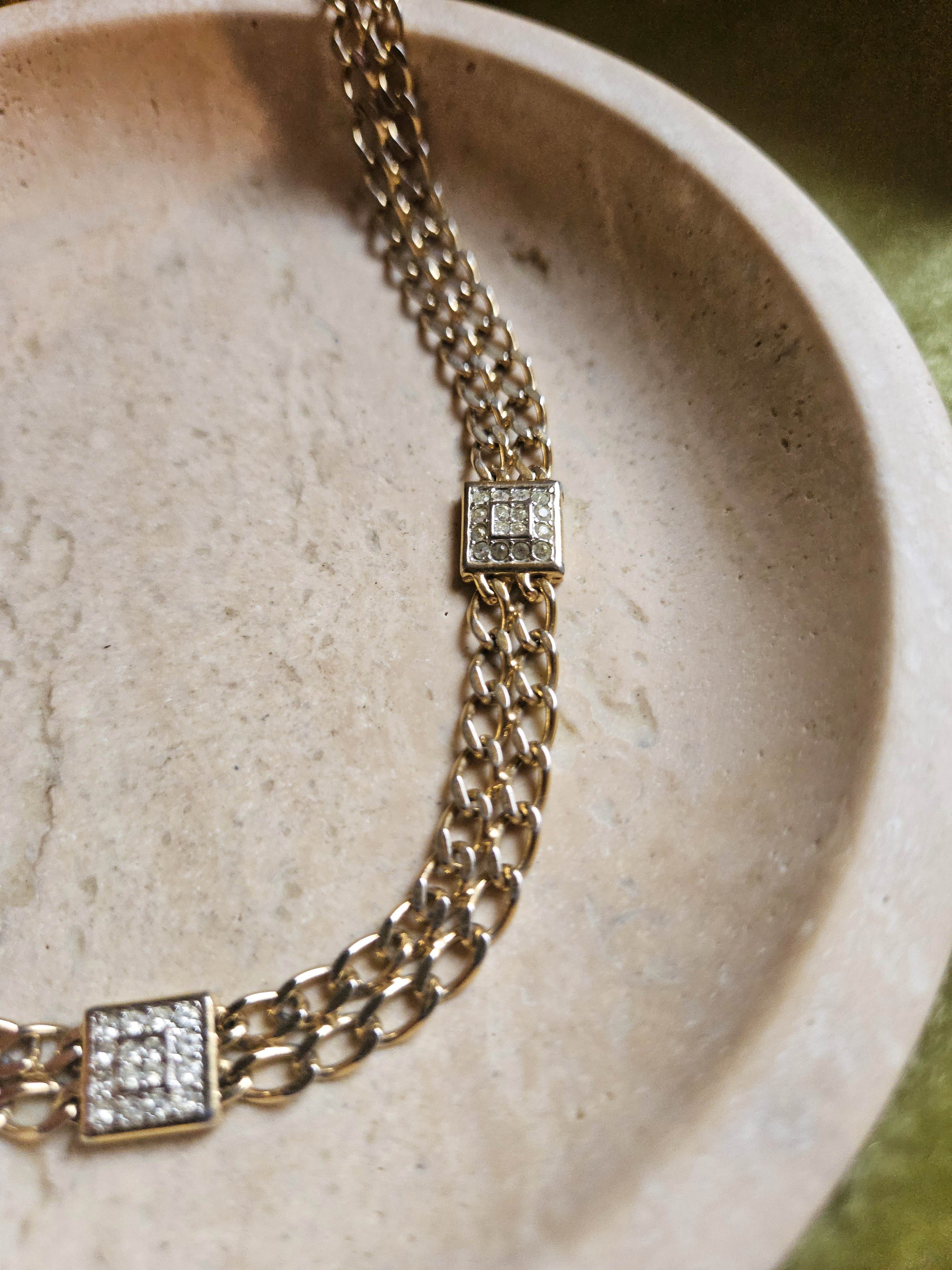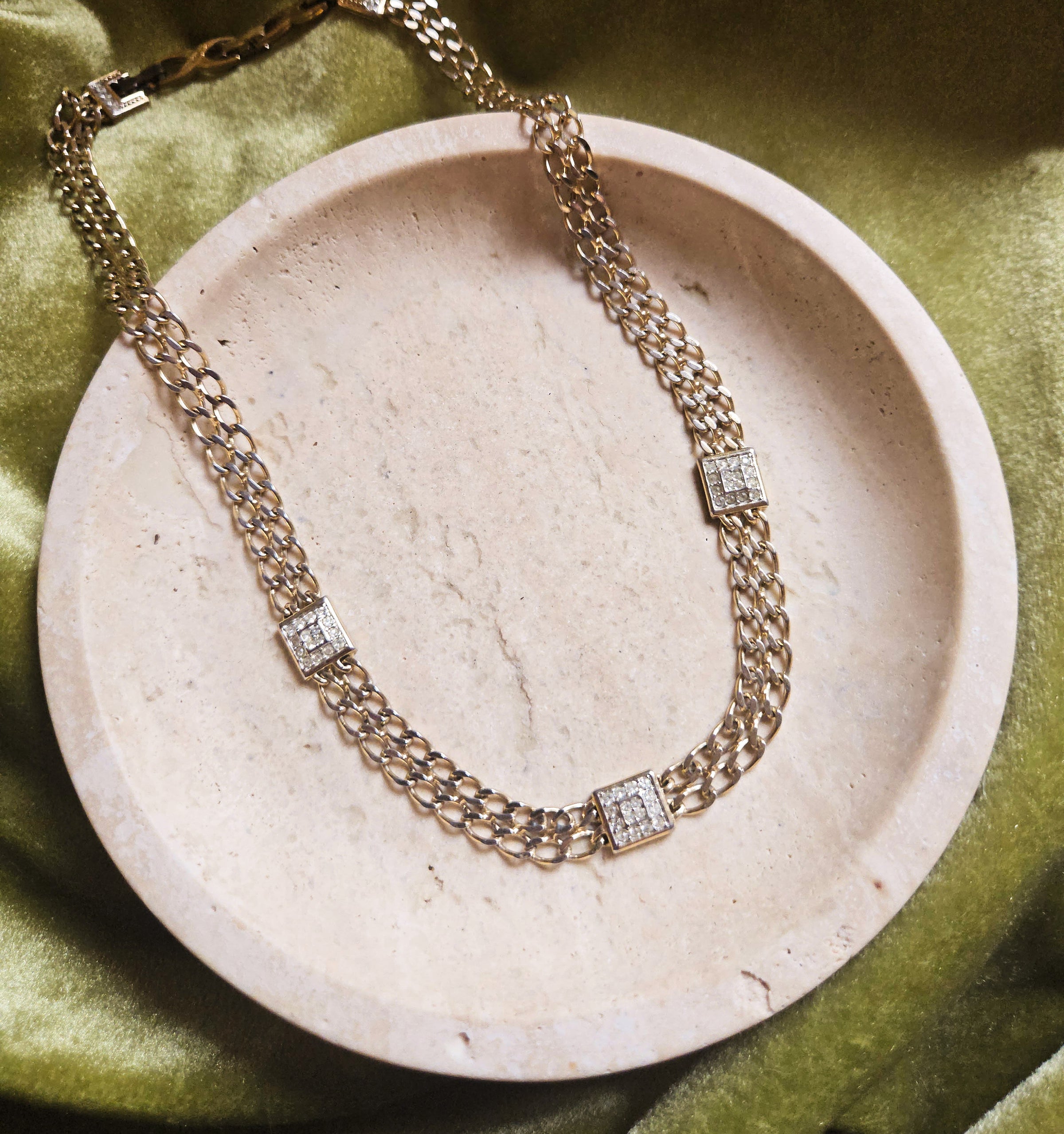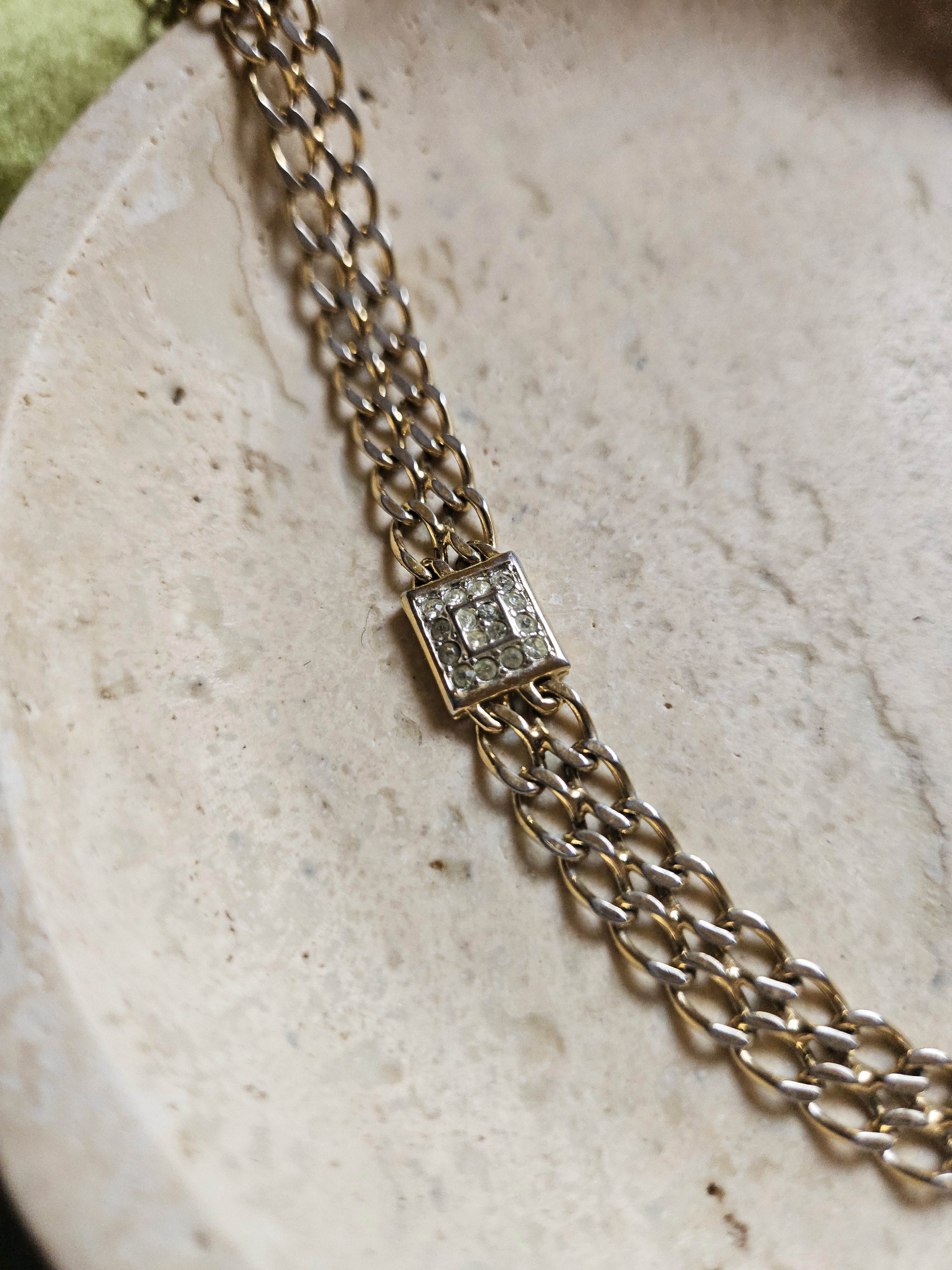Ce sautoir vintage Nina Ricci illustre parfaitement l’élégance raffinée et le savoir-faire du créateur français. Conçu en plaqué or, il est composé de boucles de chaîne délicates et de petits carrés pavés de cristaux transparents, apportant une touche de luxe subtile. Le double fermoir permet d’ajuster la longueur selon vos envies, et chaque détail — du fermoir pavé de cristaux à la gravure Nina Ricci — témoigne de l’excellence et de l’attention aux finitions propres à la maison.