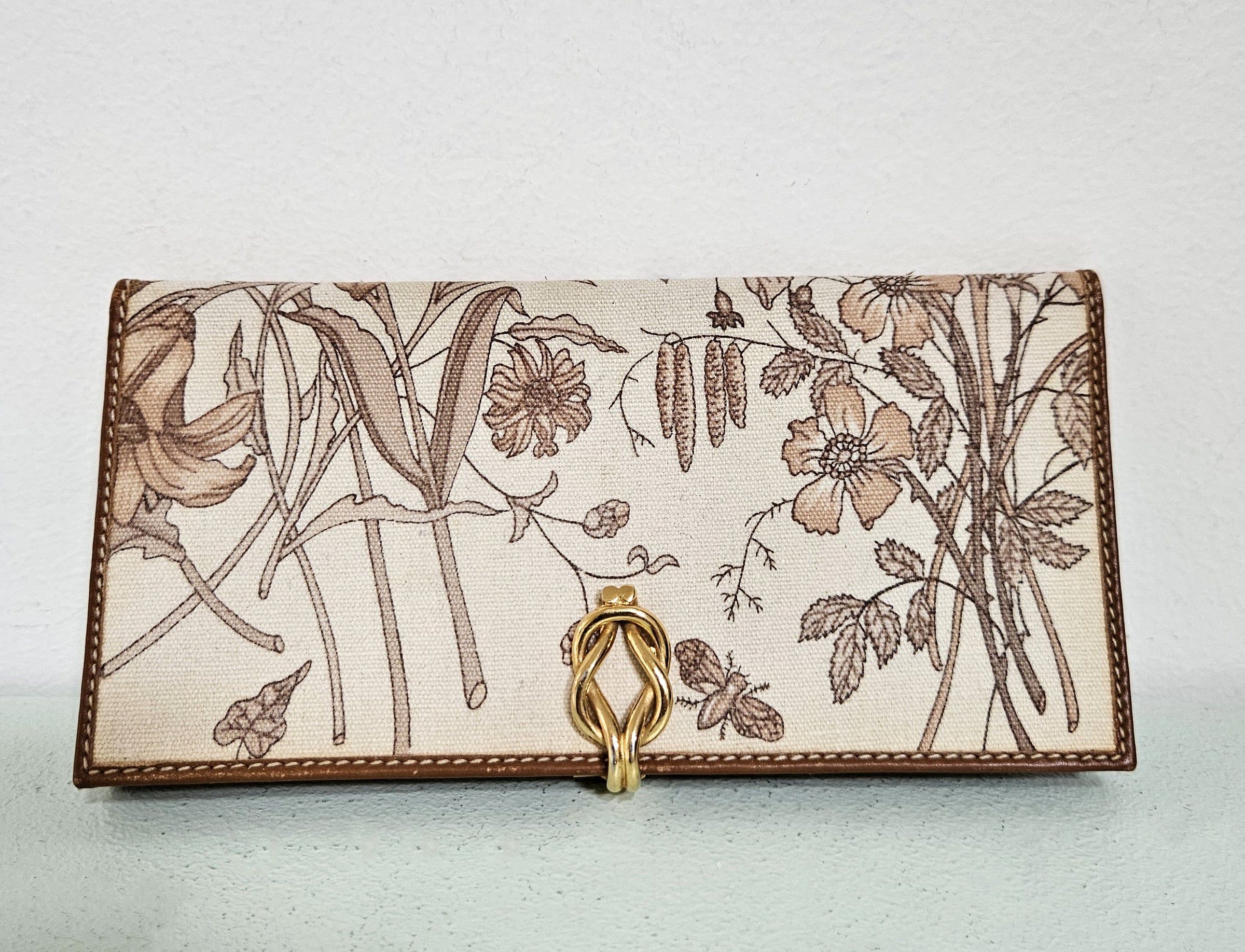This rare Gucci wallet from the early 1980s is a stunning example of vintage luxury and craftsmanship. Made for cards and bills, the front features a small pouch for coins, secured with a charming knot-shaped clasp that adds a refined, elegant touch.